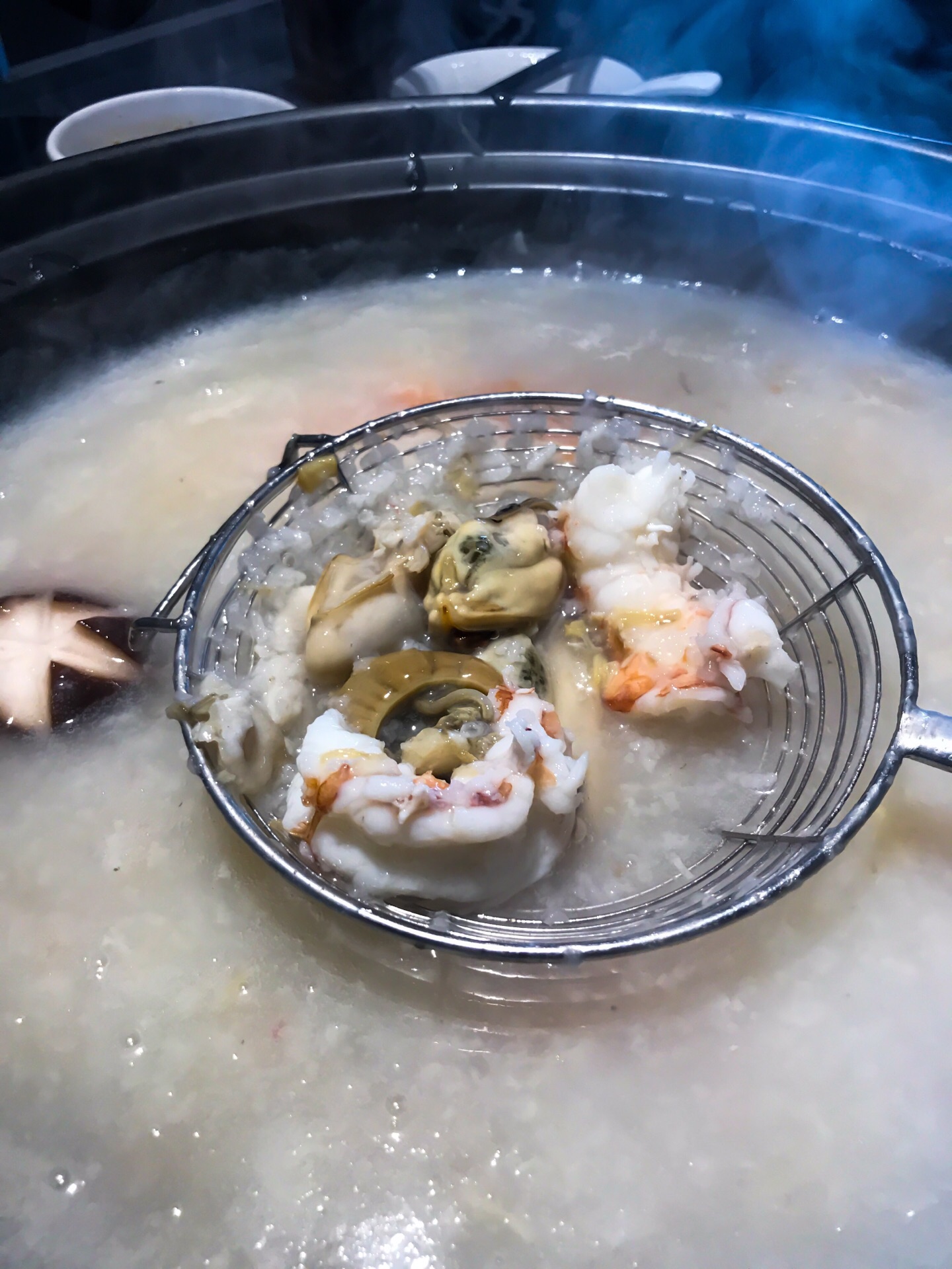 专门绕道过来就为了吃他家粥底火锅,粥底的鲜美让人心情愉悦,各种海鲜鲜美度爆棚,清远鸡的嫩滑也让人印象深刻。 吃粥底火锅一定记得首选最基础的「瑶柱粥底」,价格不贵鲜美度高,各种海鲜肉类涮食吃完后,所有食材的鲜美都会留在粥内,这个时候喝粥就全是精华了。 小料选「秘制海鲜酱油」, 两个人点了「海鲜拼盘」和「广东清远鸡」,还有一份炸鱼皮,除了鱼皮略咸,从粥底到食材,再到服务,全五星送上! 下次得约几个饭量大点的朋友,多点一些海鲜使劲造一顿。
