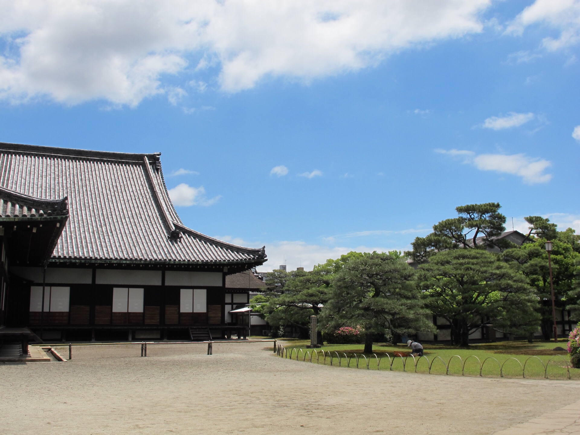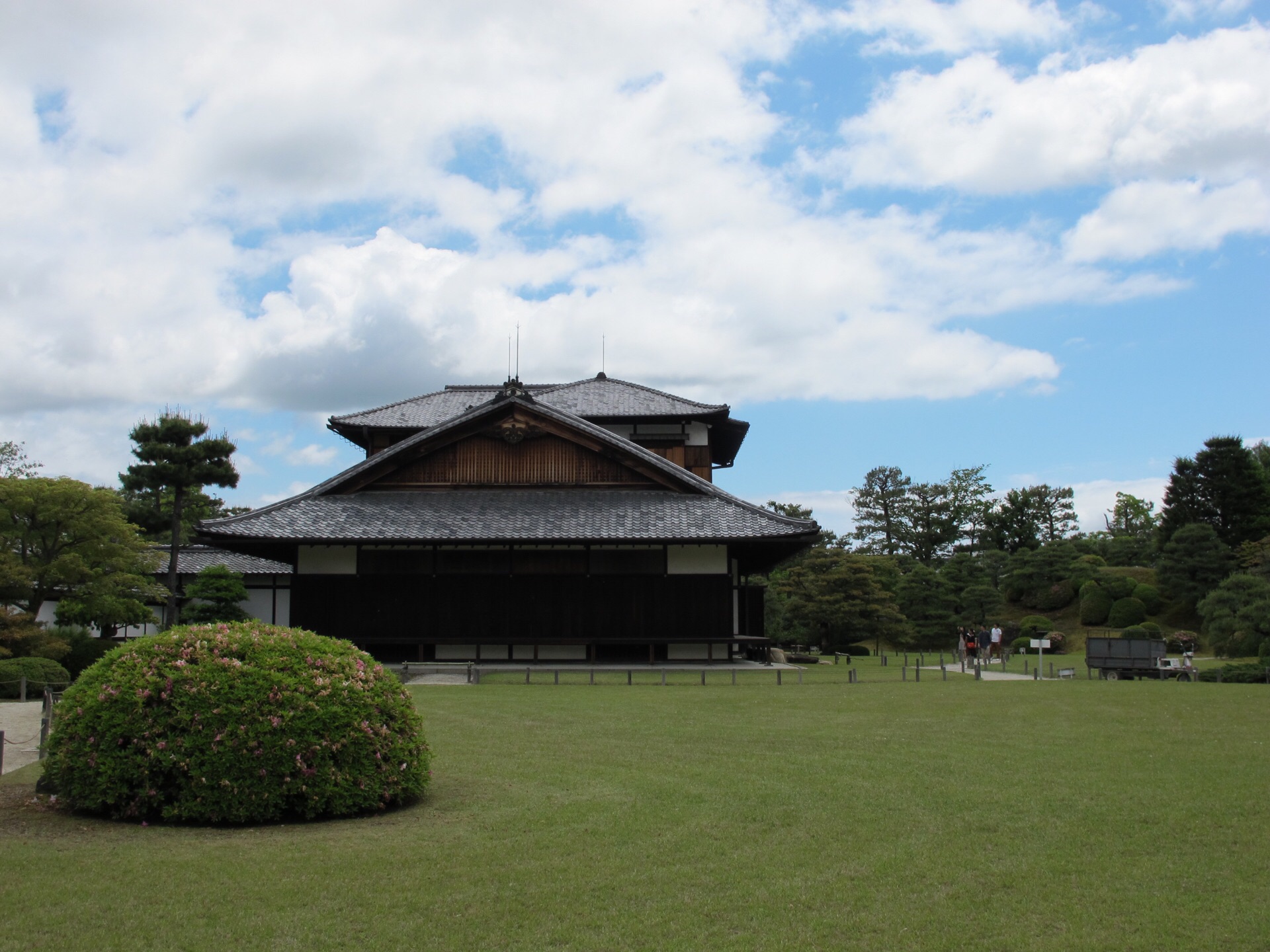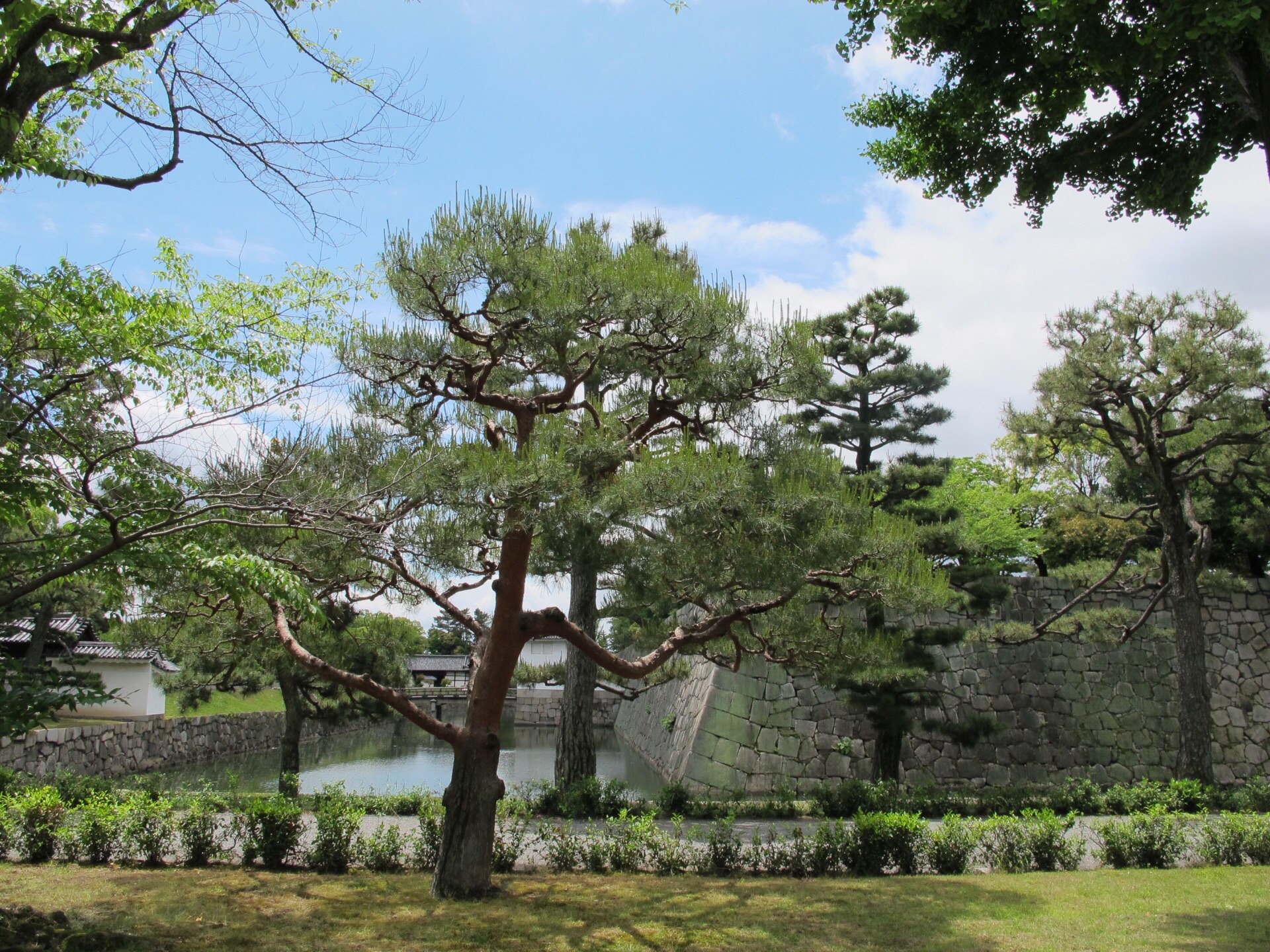 在东京的皇居里和京都的二条城里都有一个花园叫做二之丸庭院,其实景观大体上来说也是差不多的,都是修剪得非常整齐的矮松和绿植。在春末夏初的季节里看上去绿油油的,非常的养眼,在园中走一走很是舒服。在二条城的二之丸庭院里面还有一个湖泊,湖中两岛叫做蓬莱岛和鹤龟岛。