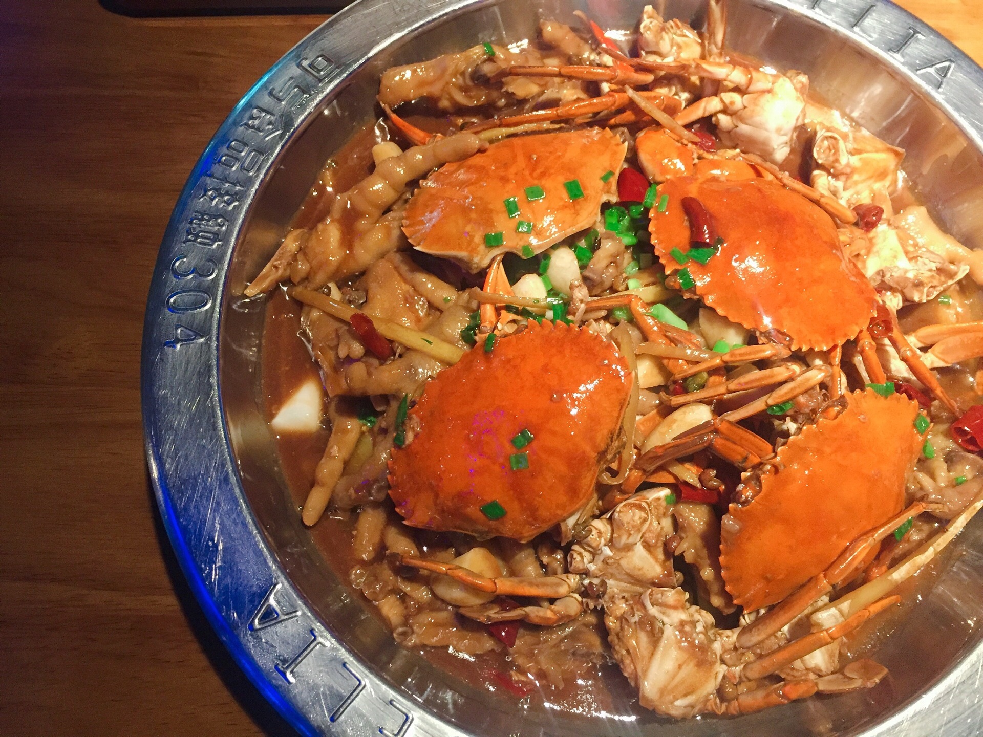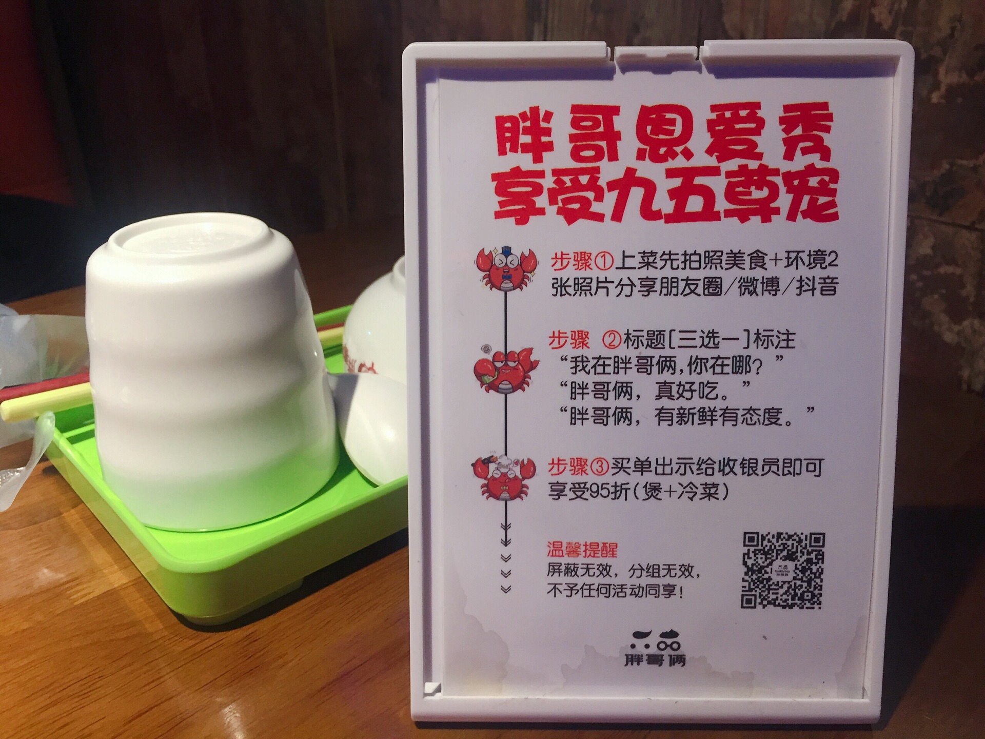 ∠( ᐛ 」∠)_ 时隔5个月,第二次踏入胖哥俩,中午2点到,虽然免去了排队,但也很遗憾,“膏蟹煲”、“排骨”都已售罄。 许久没来,点单方式也由纸质菜单改为桌角扫码点餐,湿巾必点,但可退掉。难得的是,它家也做起了活动(参考图4),线上指定平台分享胖哥俩,打95折。 「招牌肉蟹煲」,四只孟加拉蟹,虽然无膏少了份美味,但舀些酱汁在碗里,蘸酱吃还是不错,同样点的是微辣,但辣度有下调,没之前辣得过瘾。 最喜欢的莫过于「鸡爪子」,软烂入味。还搭配了土豆、豆腐、年糕,土豆份量最多,但这次味道不佳,不入味。 8月的肉蟹煲与1月的肉蟹煲,最喜欢的还是夏天那会,只因冬日的低温让肉蟹煲凉得快,影响口感。