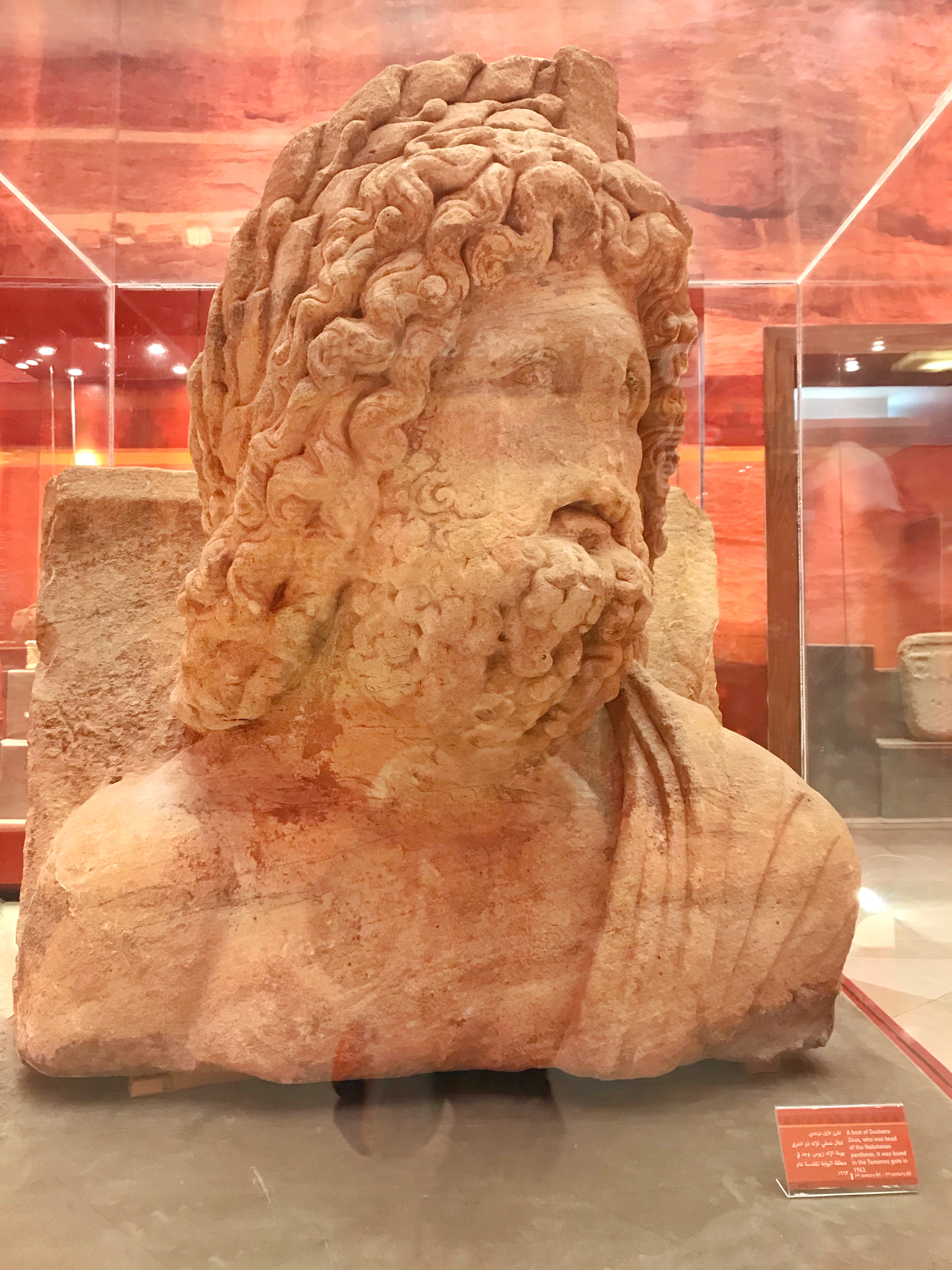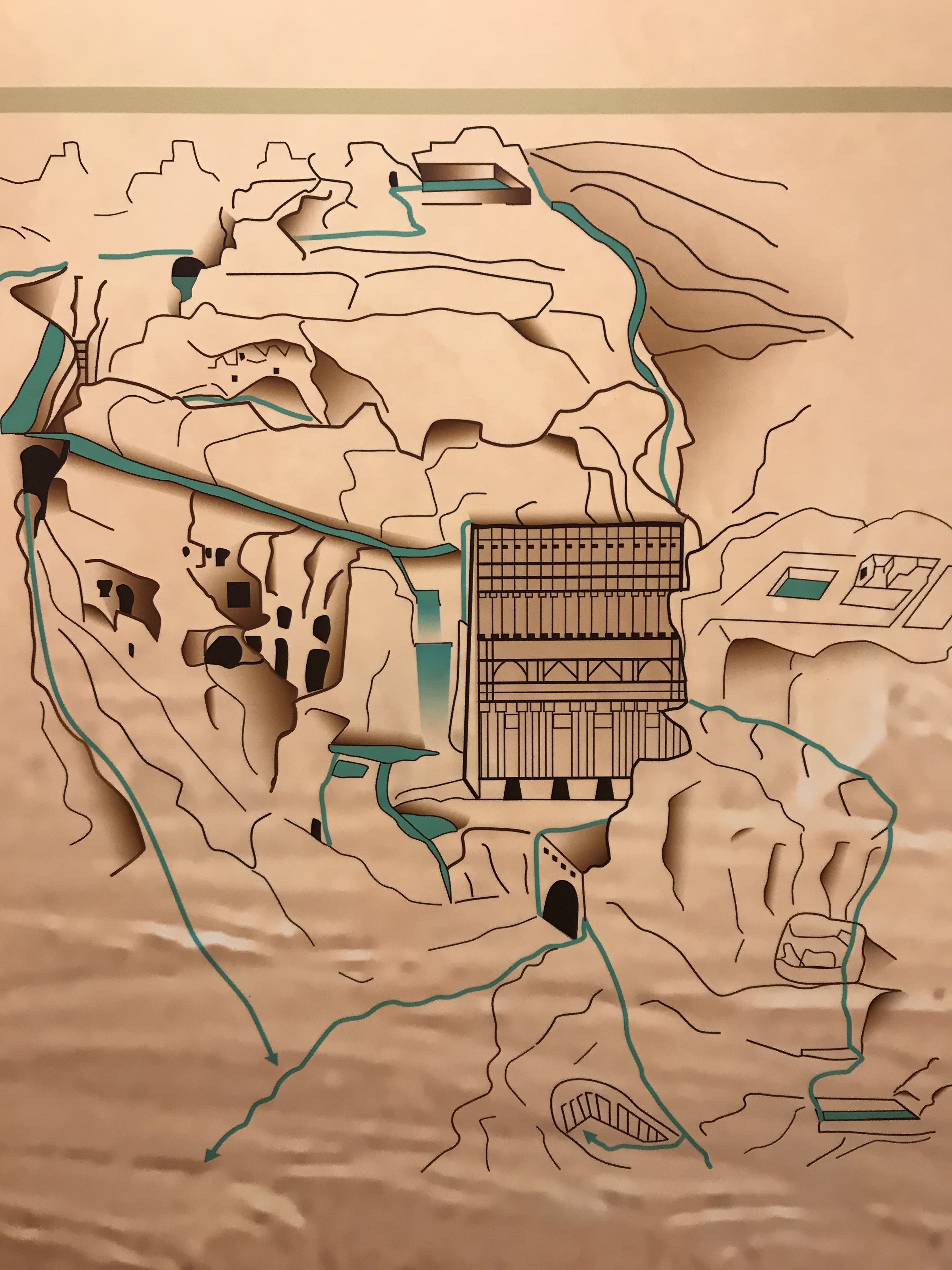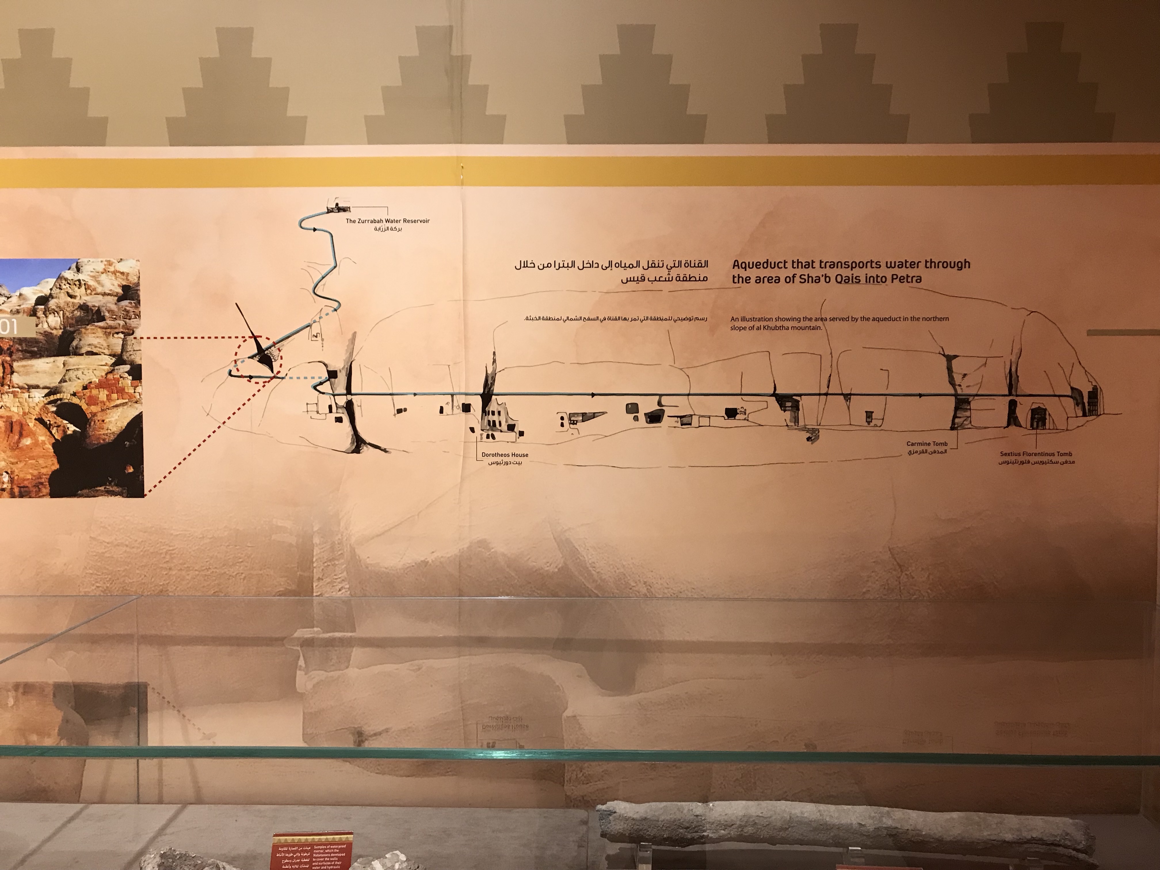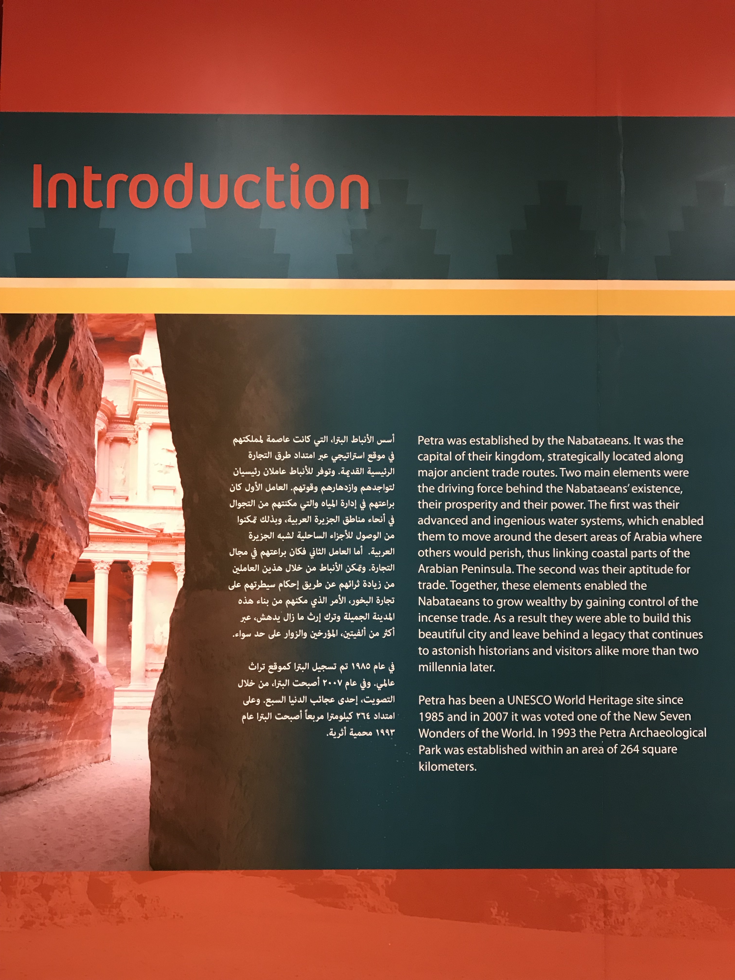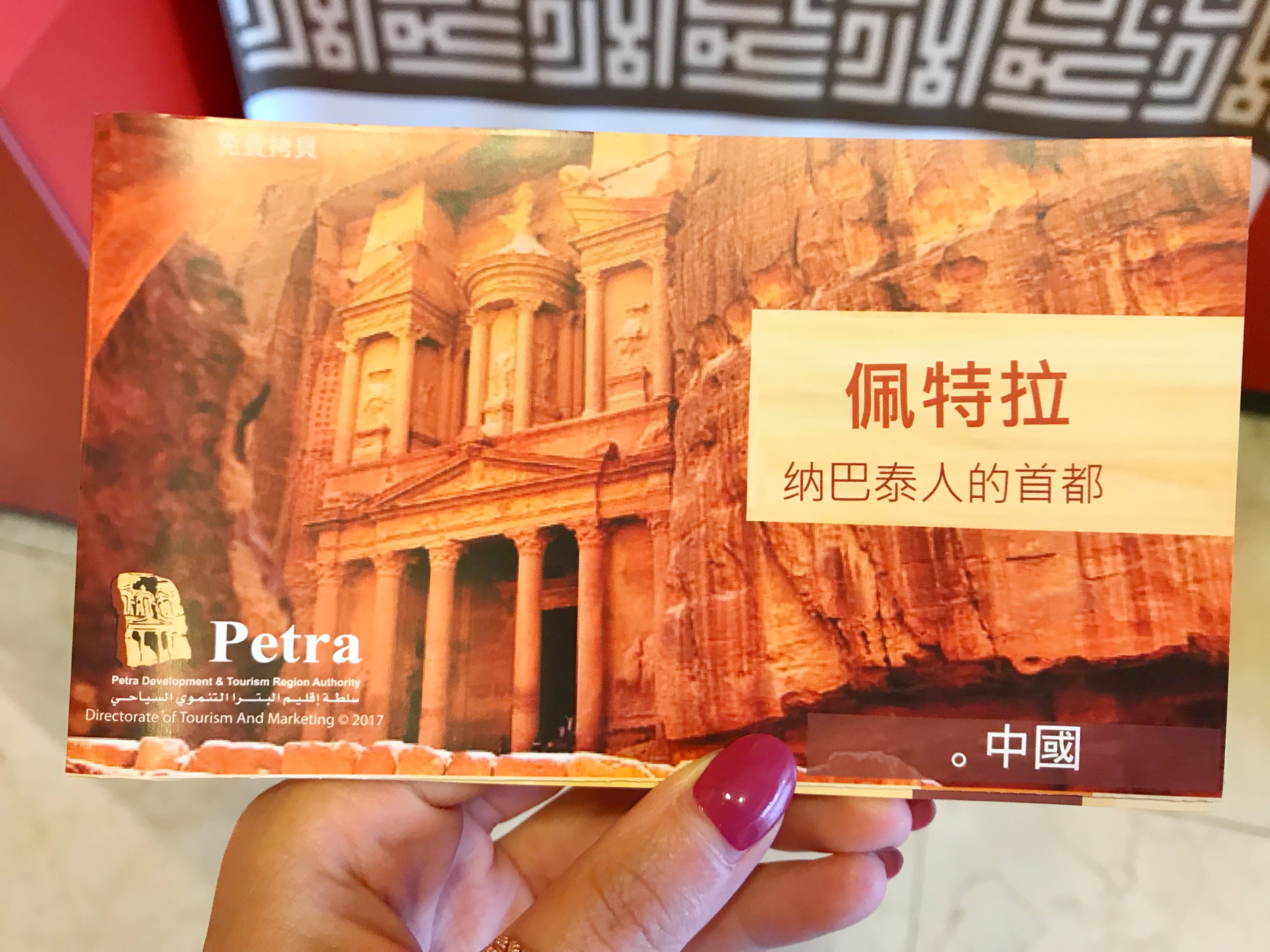 Petra 的大门——游客中心的大门——我么有拍到。一边走一边拿着手机拍,晃动的照片有点糊了,看不清楚,所以删掉。之后似乎也没再找到机会拍~>_<~ 大门进去后,到达一个圆形的小广场,迎面看到的是各种纪念品小商店,往左一点标着大大的 Visit Center。Visit Center 再往左就是博物馆入口了。这个博物馆很小,基本由墙壁上的介绍版和玻璃罩着的展览品组成,无他物。但是,作为在进入前又个大致了解的基本科普还是很不错的选择。 看到有纸质介绍手册,想过去拿。找了半天,发现竟然没有中文的,我们要投诉了!转了一圈,发现中文版的放在另一个比较不起眼的角落^_^||| 整个博物馆粗略的全部浏览一遍,不需要太久。像我这样的门外汉,看个故事,看个造型,差不多 45 分钟。