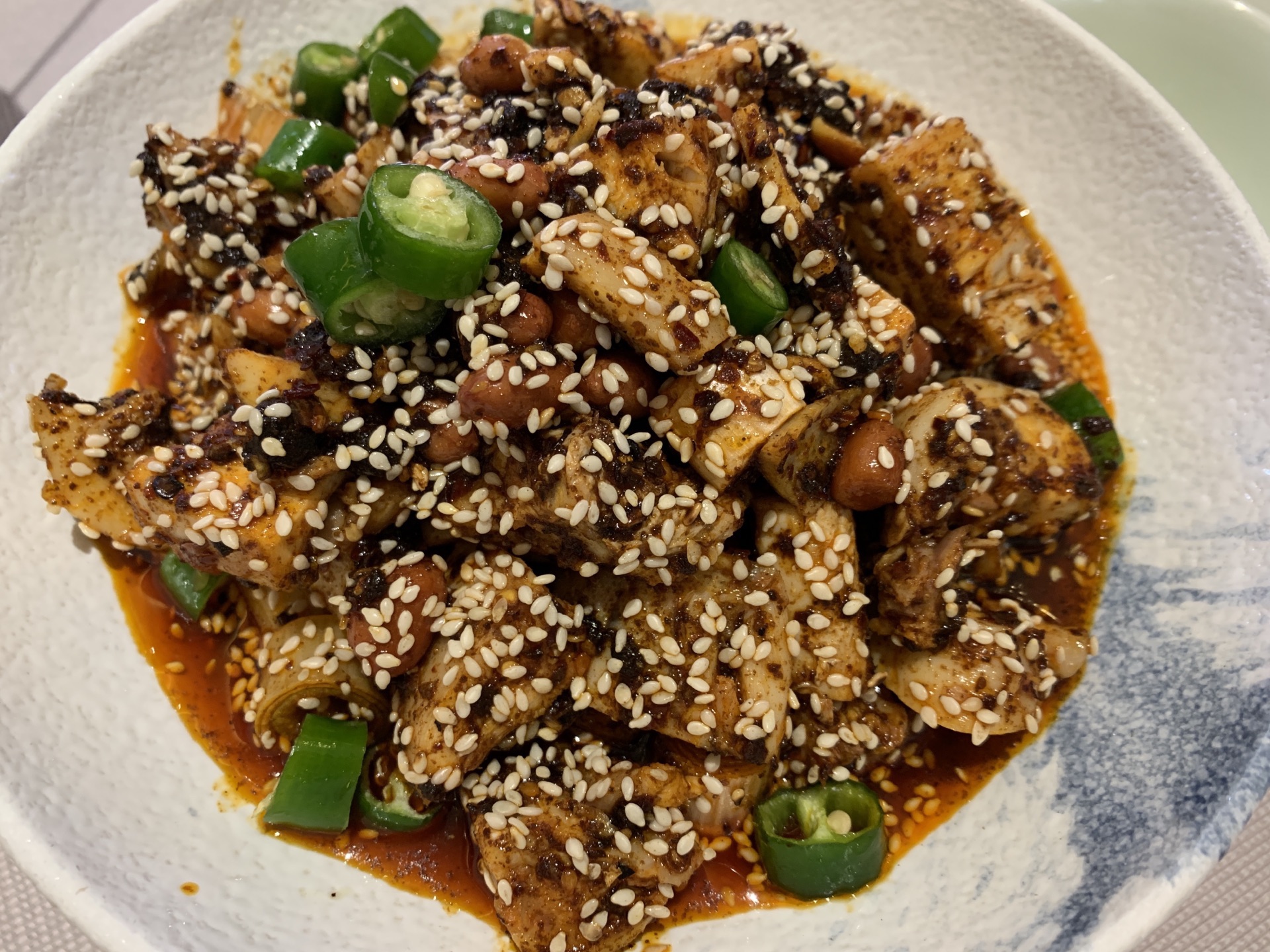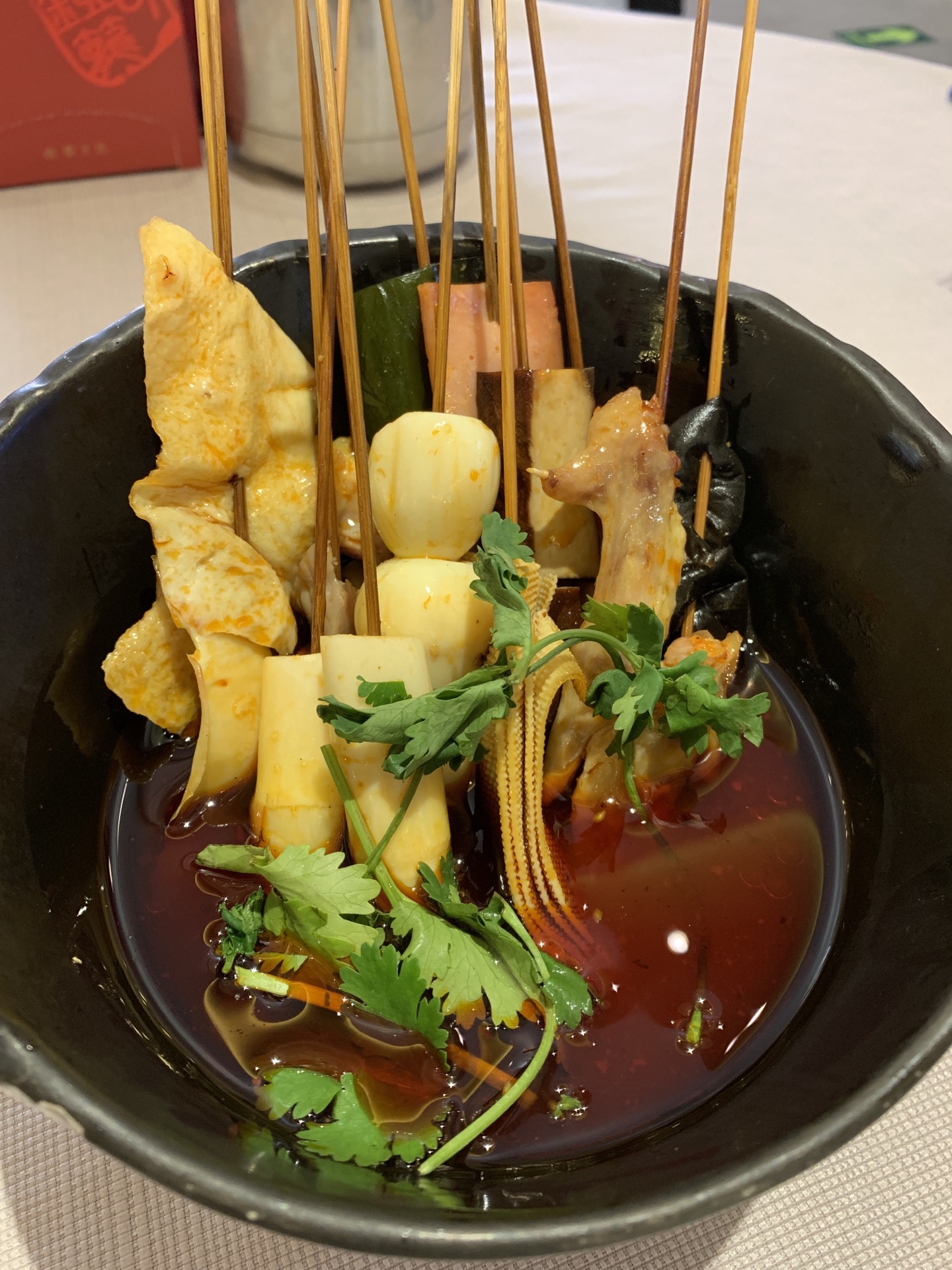 周二中午和朋友过去吃饭,幸亏到的早没有排队,我们两个人就坐在大厅吃的,点的冷串味道很好又香又辣的,麻辣香肠感觉太肥了,全是肥油,牛蛙做的也不错,不是很咸,就是量不是很大,兔丁也很辣,幸亏是冷吃的,感觉还好一点。整体感觉还是不错的,人多了吃比较热闹,可以多点些菜,每种都吃一点。