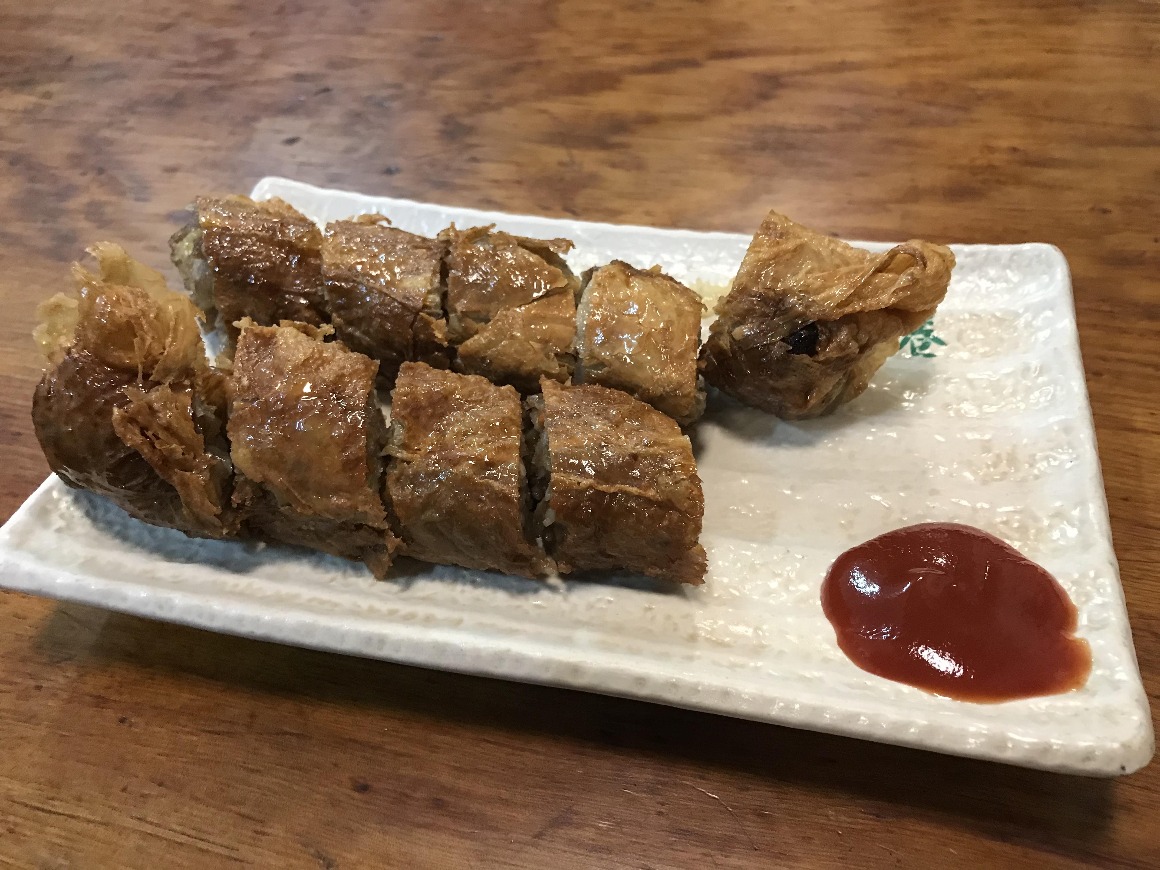 一早来到菁桐,好饿,所以去吃了杨家鸡卷。 这家店很有意思,鸡卷没有鸡,肉羹不勾芡。点了鸡卷,50台币一份。 老伯伯做好之后,给我们端上来的。份量中等,外面炸的酥脆,里面是素菜,蘸着番茄酱吃。总体很新奇,听说是曾经这边家境不殷实的人吃的,缅怀过去的古早味。