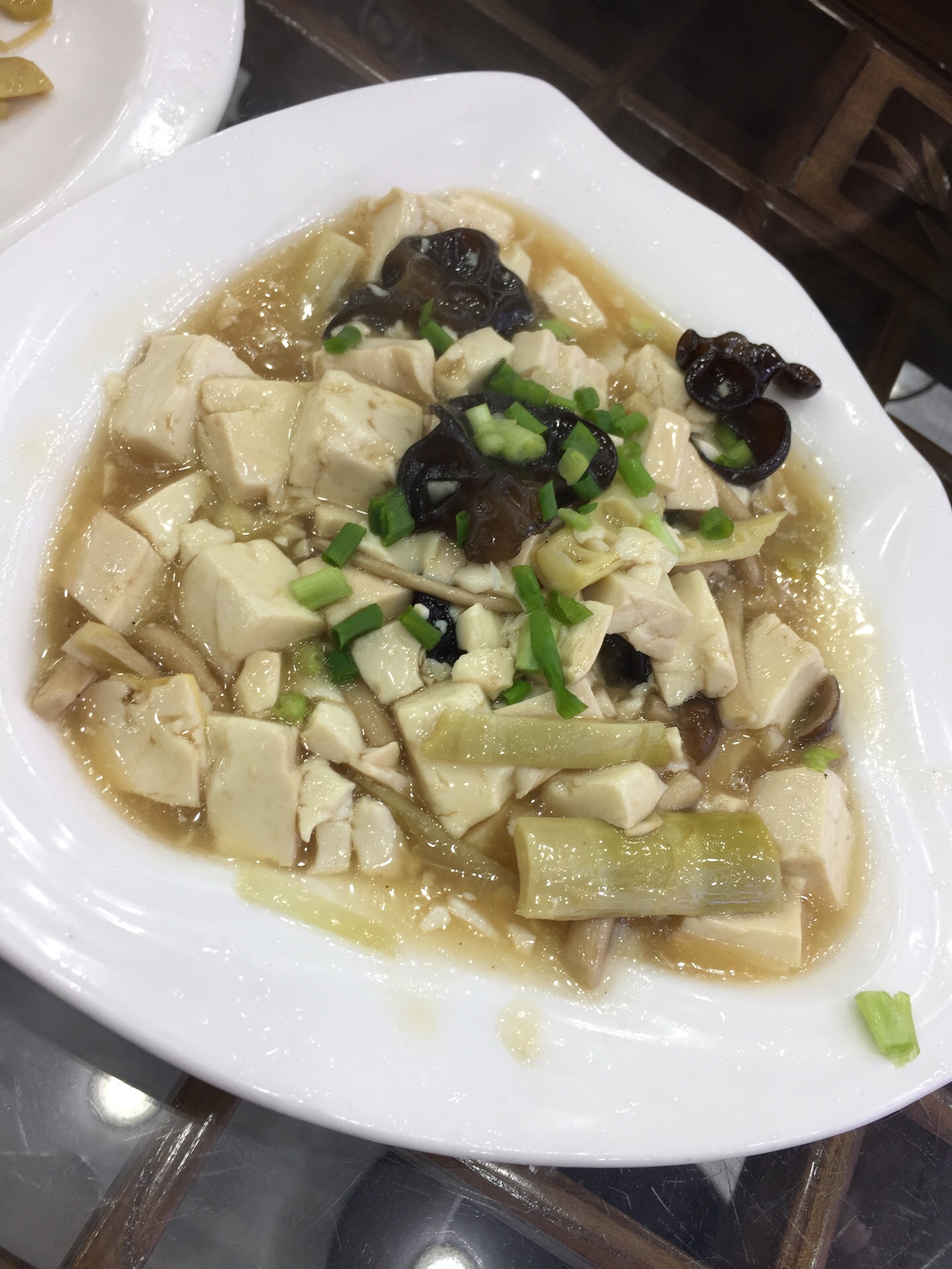 三鲜豆腐是用蘑菇、笋和豆腐一起炒的,都是鲜食材,炒出来自然很鲜,而且价格不贵,经济实惠