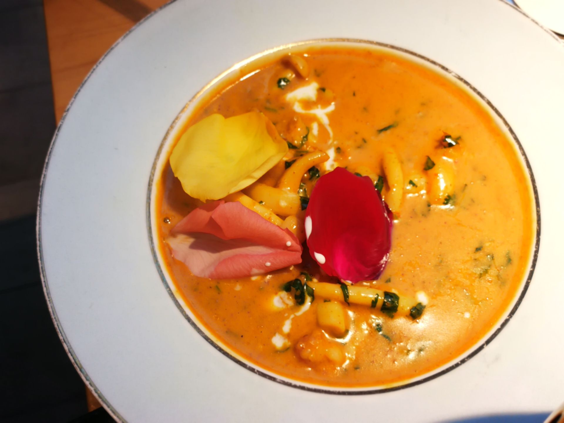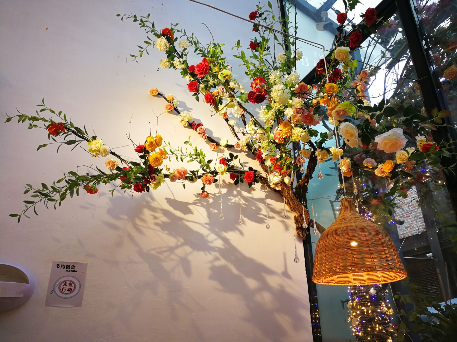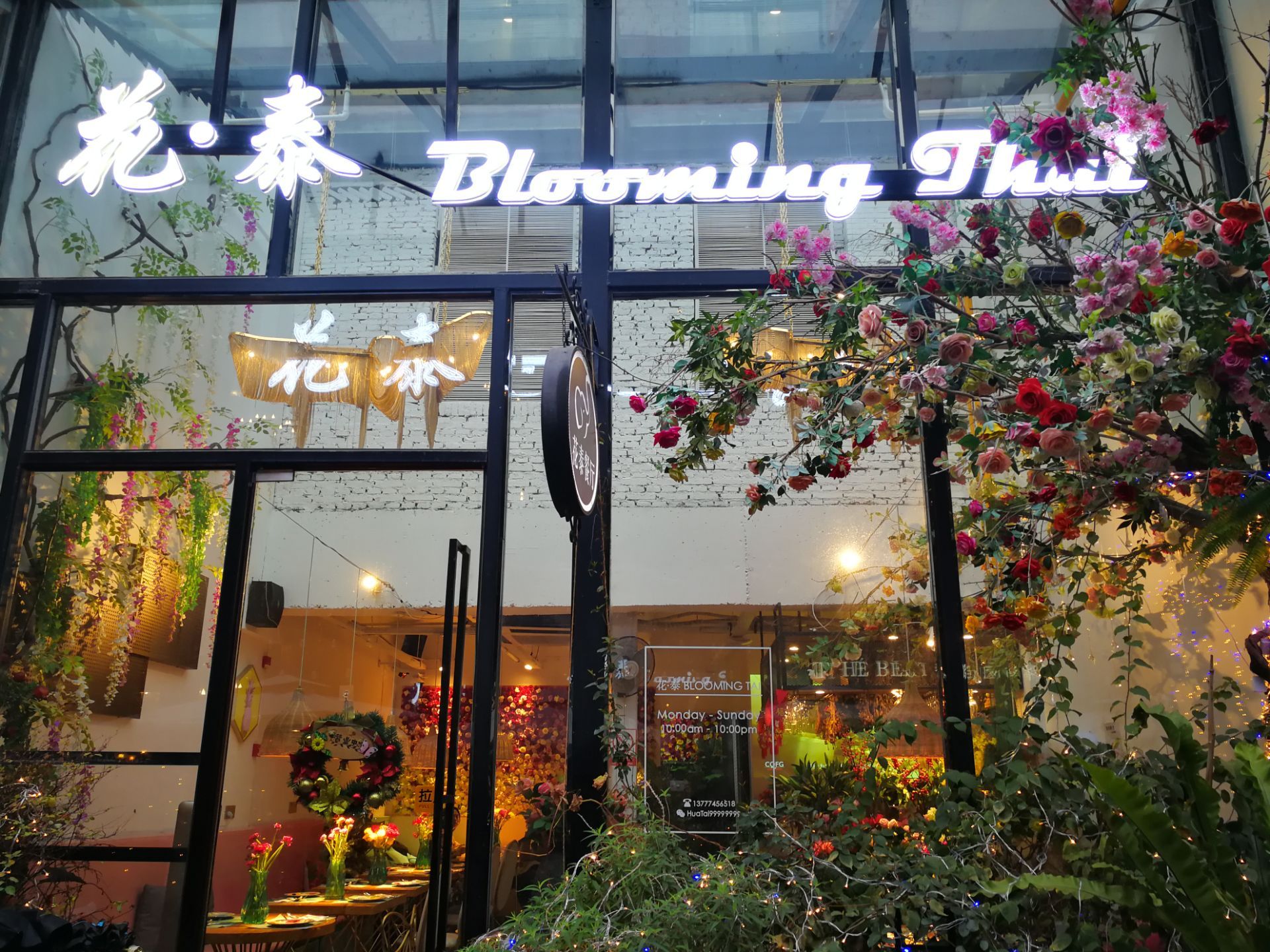 花泰,也是心心念念一直想去的一家店了。光听名字,就莫名的喜欢。 [环境] 皇后公园的深处,有一间玻璃房,这便是花泰了。门口放了很多的绿植,还有霓虹灯星星点点,春天的气息迎面扑来。 餐厅不大,餐位不多。但每张桌子上都放了新鲜的芹叶牡丹,娇艳欲滴。墙角上还挂下一支大大的花枝,虽是假花,但同样美好。 吧台有个架子,一层层放了很多各式各样的鲜切花,让我一度以为他家还卖鲜花。错了,这些都是用来装点的材料而已。 【菜品】 |冬阴功汤^ 每次胃口不开的时候,总会相当冬阴功汤。诱人的色泽,迷人的香气,酸辣的口味……光是想想就会咽口水。他家的冬阴功汤,用料也是实打实的,大虾很大只,很新鲜。还有好多白贝、菌菇。这个汤最是销魂啦,那点恰到好处的辣味,真的是激活味蕾的杠把子。而我家爪子,迷恋到把香茅草都吃了。 |香蕉烤馕^ 额外赠送了馕,看点评的推荐菜,选了香蕉味的。薄薄的馕饼,嵌着一片片香蕉,经过烤制,香味被激发了出来。香甜可口,而又不失韧性,真是不能错过的零嘴。 |芒果糯米饭^ 玫瑰花瓣的装点下,这道菜真是鲜艳无比。大半个芒果,一个紫色的心形饭团,配一叠椰浆。芒果很甜,米饭香糯,椰浆丝滑,经典的泰料! |西兰花炒大虾^ 这道菜相对比较粗放点,但用料依旧走心。西蓝花的熟度刚刚好,大虾也很入味。就是汤水略多,降低了颜值。 |马来文火虾肉咖喱^ 又是一道鲜花绽放的菜,一道有虾肉的菜。除了虾肉,还有鱿鱼等等。咖喱非常下饭,配馕饼吃也很赞哦。 |橙汁^ 饮料选了橙汁,鲜榨的哦,酸酸甜甜真滋味。 [服务] 服务也是非常的贴心了。提前打了电话,会告知大概什么时候会需要等位。吃芒果糯米饭的时候,有主动来问我要不要去皮。总体感觉真的非常棒!