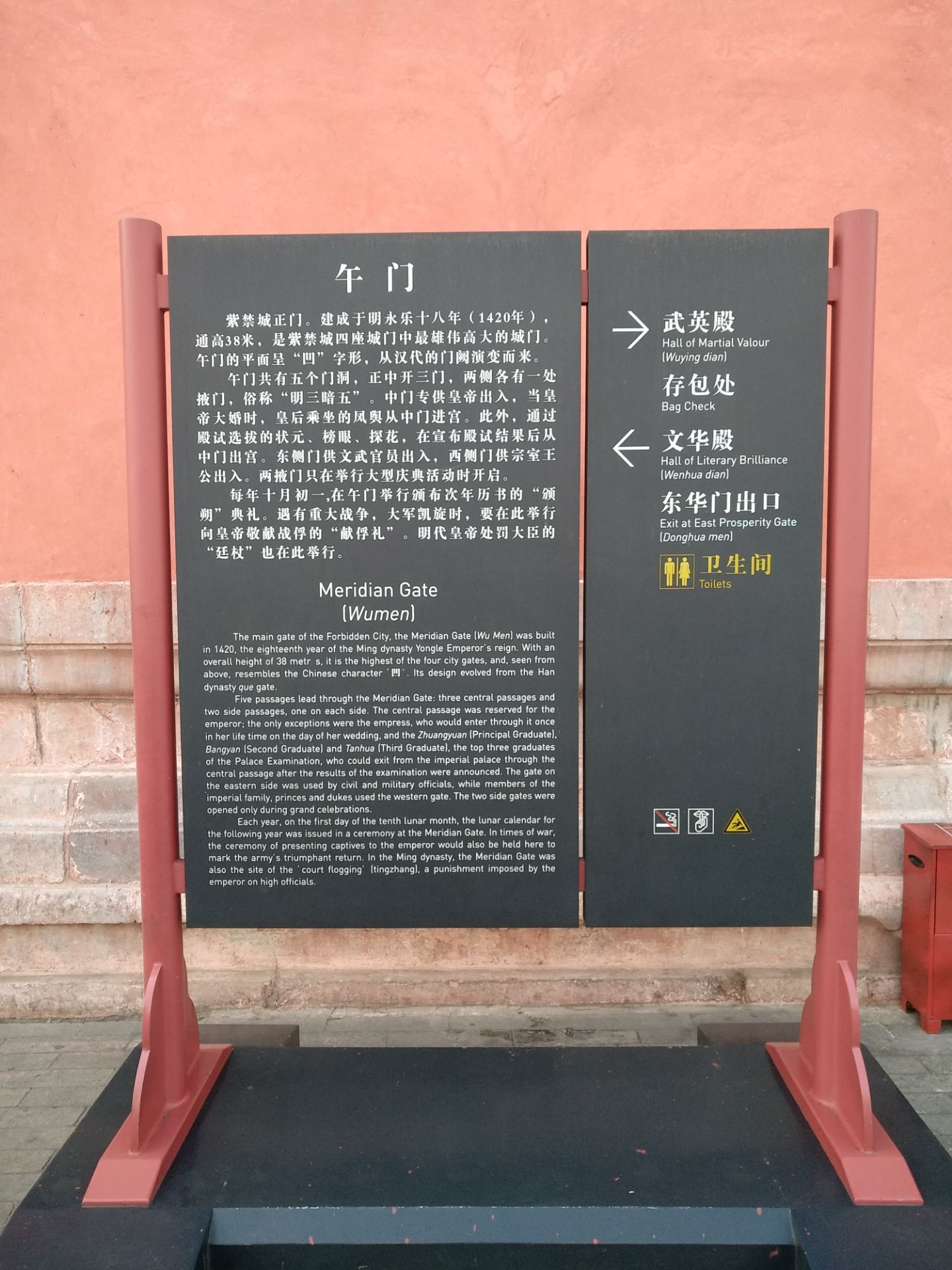 午门是紫禁城的正门,位于紫禁城南北轴线,通高37.95米,始建于明朝永乐十八年(1420年),午门居中向阳,位当子午,故名午门。自从现任故宫博物院单院长上任后,推出提前预约网上门票,现场直接刷身份证进入的便民措施。