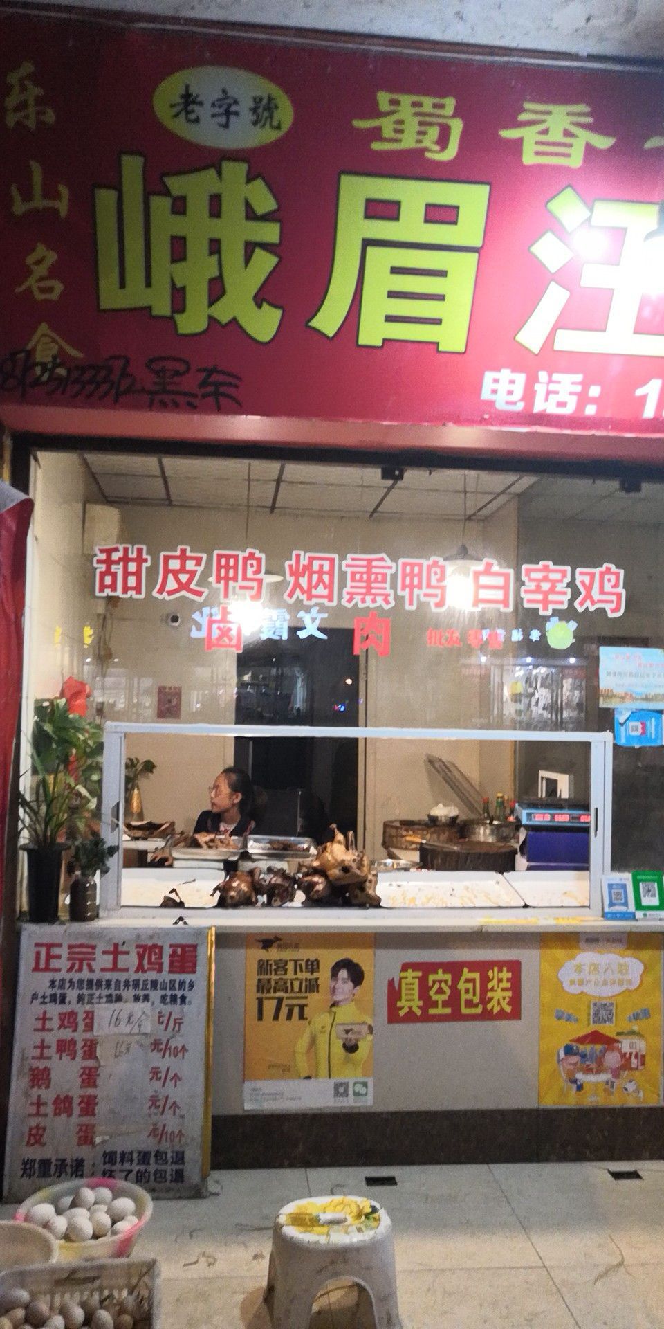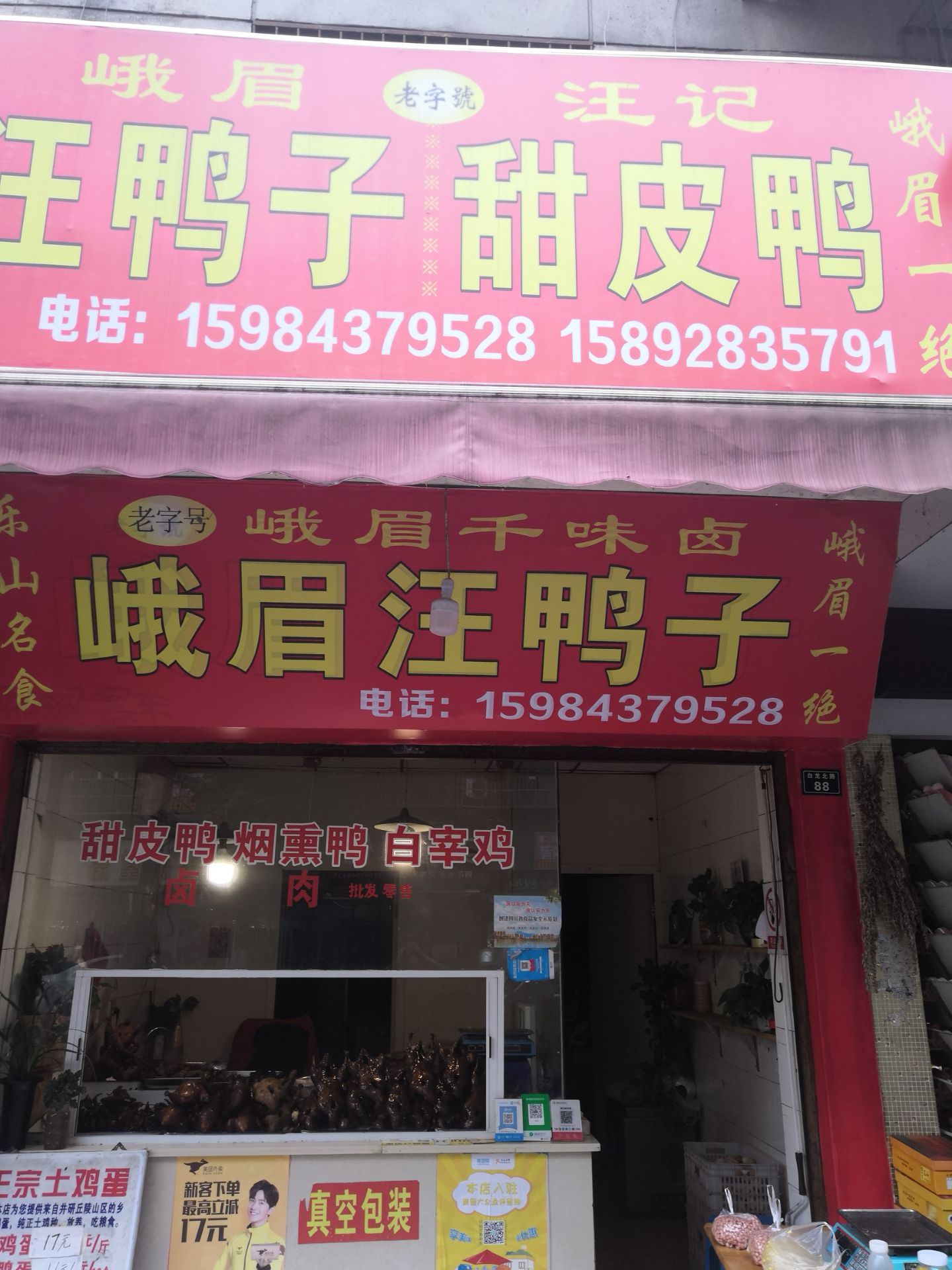 当地朋友推荐的,说是当地最好吃的甜皮鸭,来峨眉以后迫不及待的通过地图导航过来,买了一只,非常满意的一次购物,好吃不贵,才二十八一斤,一个鸭子大概俩斤左右,特别好吃,干香酥脆卤香浓郁,还有烟熏鸭也特别好吃,咸淡正好,一个人就啃了大半只,果断的一样买了几只打包带回成都,感觉比乐山那几家大店铺的好吃多了
