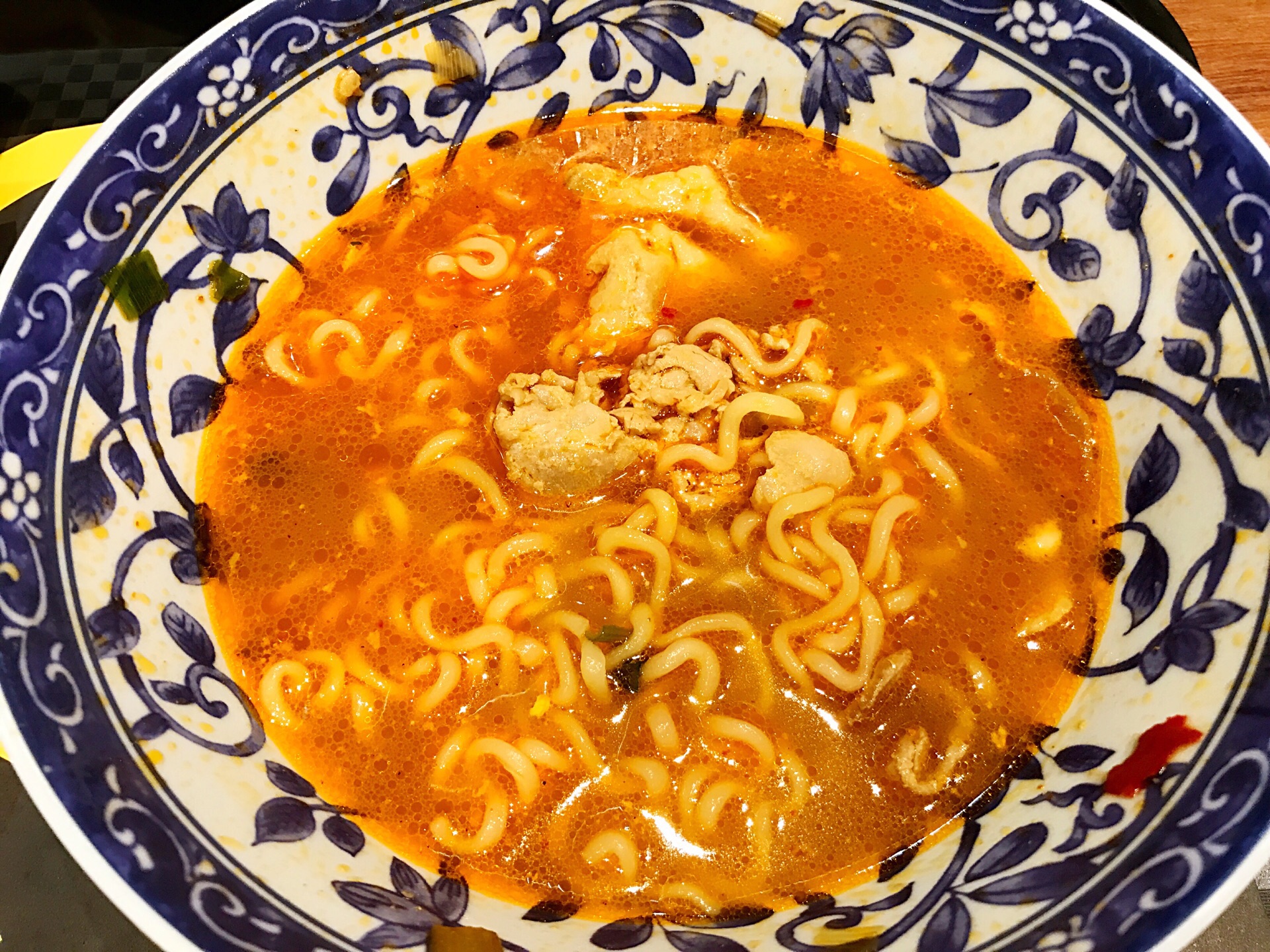 人很多,好不容易才找了能座的位置。猪腩辛拉面比较中规中矩,面就是辛拉面的味道,猪腩处理得还可以