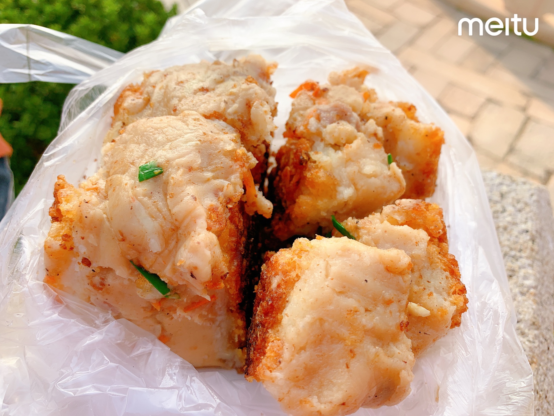 不得不说,经过这家店,即使不被排队队伍吸引,也肯定会被他们家的面煎粿的香味吸引过来。 这家面煎粿单是在古城里就有两个店啦,不过店面都很小就是,我们都是买完提在手上边逛边吃的。 面煎粿趁热吃最好,软软糊糊的,比普通咸粿好吃很多。