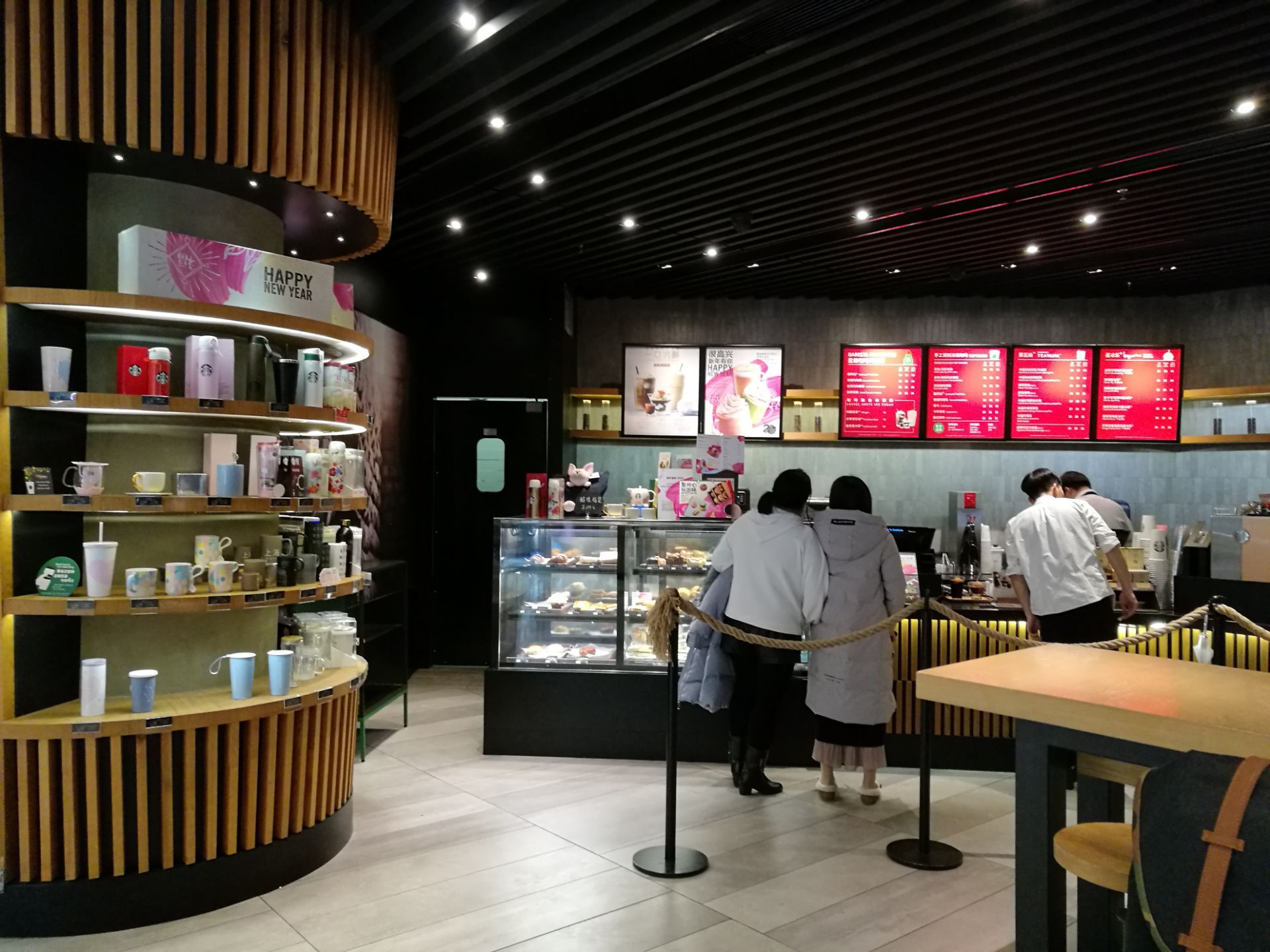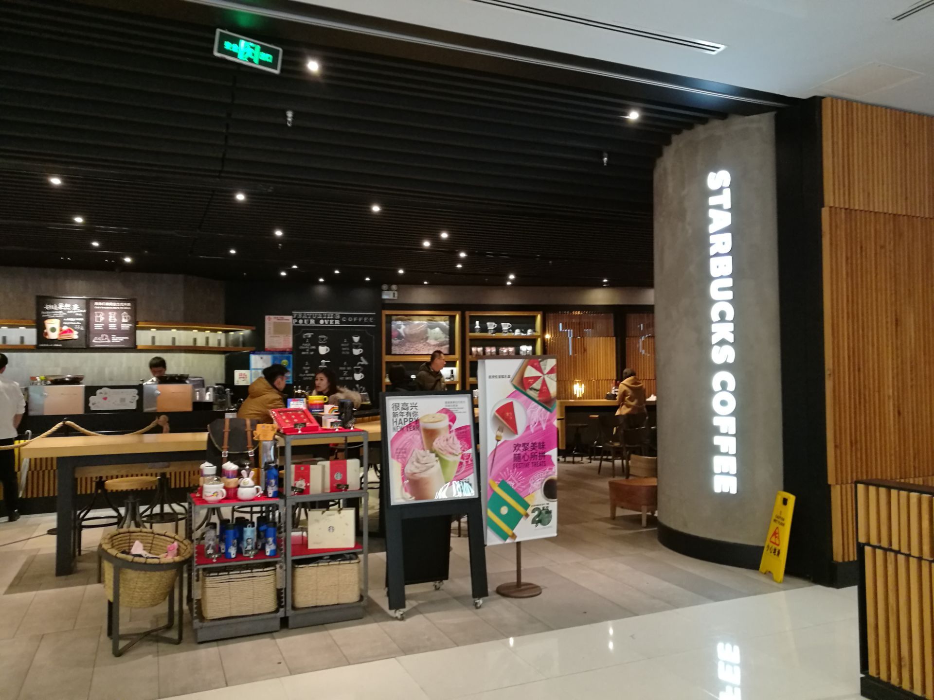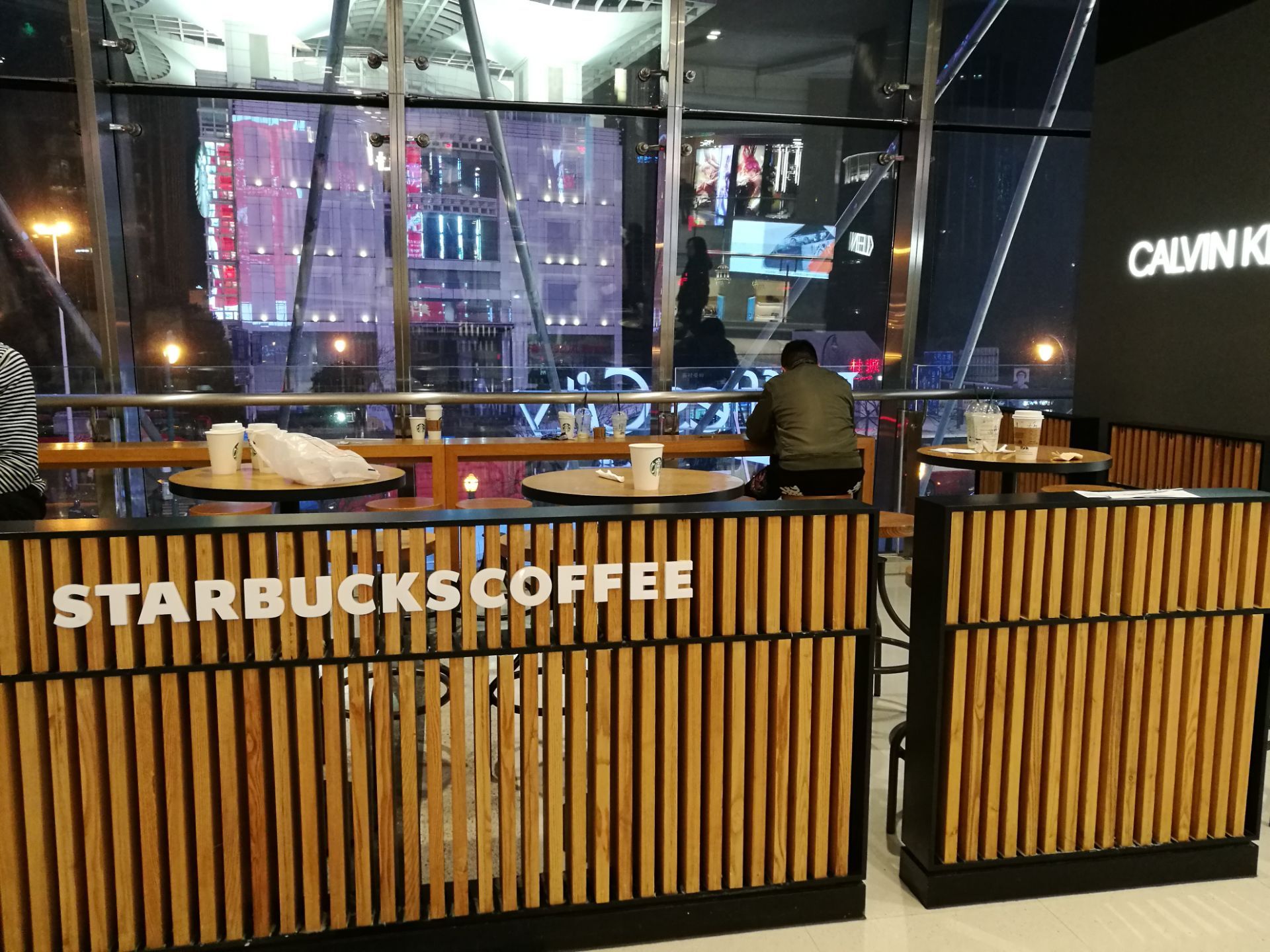 这家星巴克咖啡馆位于上海来福士广场的二层,包括一个面积较大的店面以及一个面积不大的店外用餐区。 这家来福士广场星巴克咖啡馆的配置比较经典,店面里除了点餐台和餐桌,还有星巴克咖啡杯、咖啡豆以及其他相关商品的展示台。 星巴克咖啡馆的地面位置不错,距离步行电梯的距离不远,顾客络绎不绝。