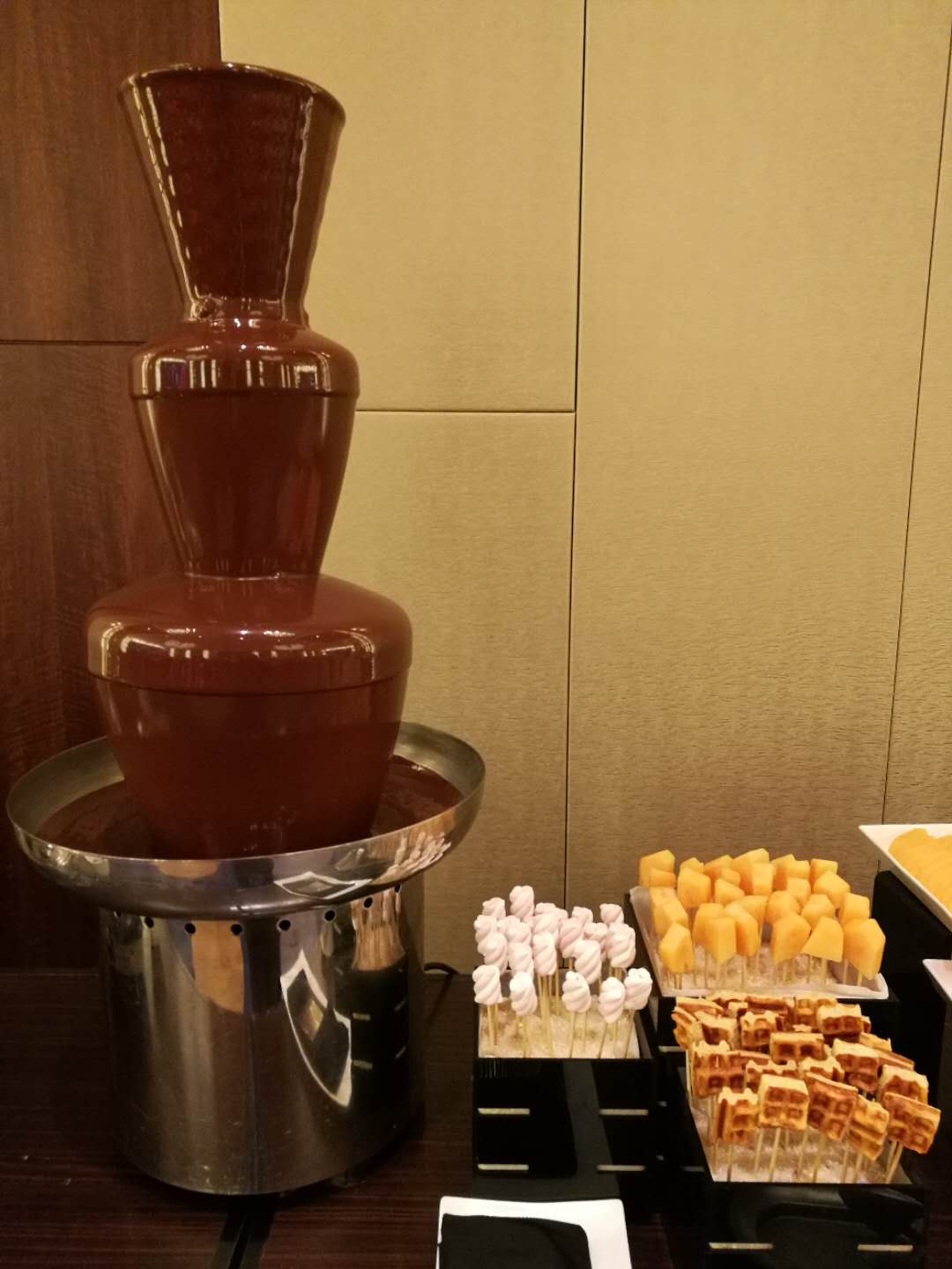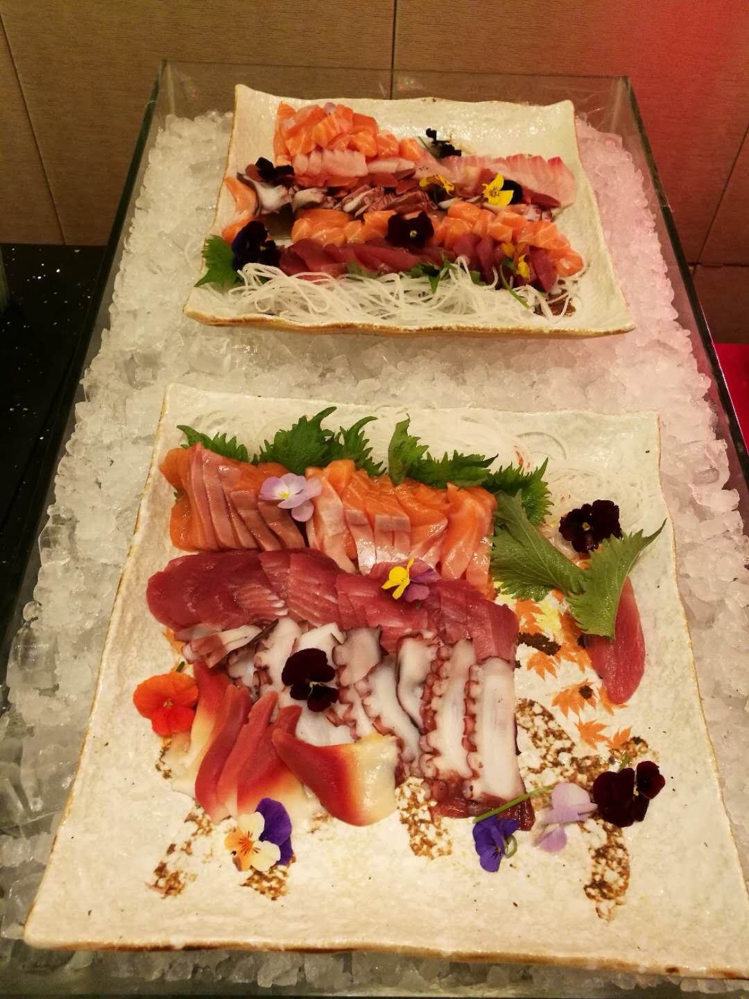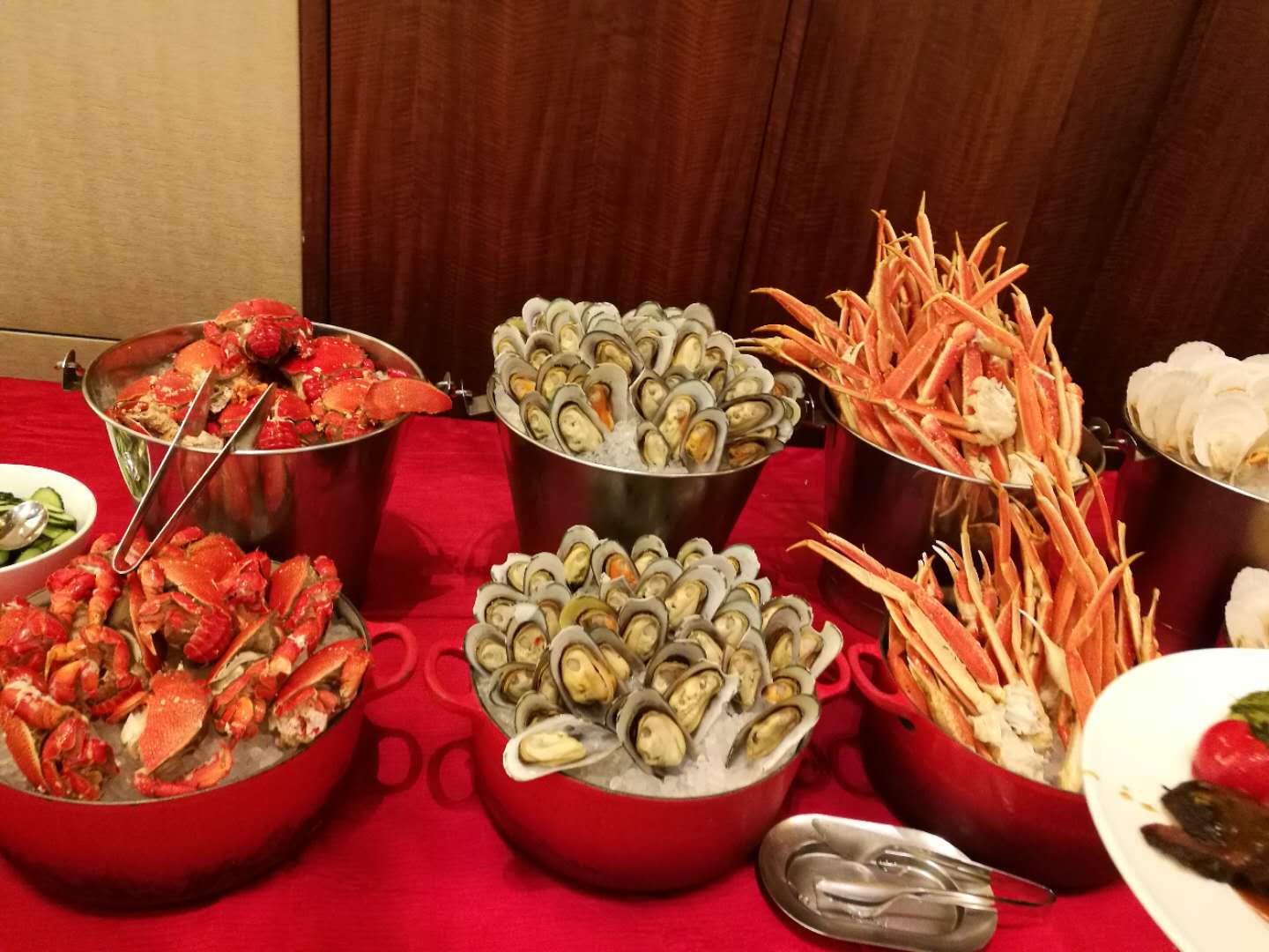 年夜饭订在这里吃,很不错,环境优雅,价格比平时要贵一倍,300一人,食材新鲜,味道也超棒。主要整个场地的两边各有一个超大屏幕直播春晚。 羊排,牛排,烤秋刀鱼都很不错。量也充足。 海鲜类的有蟹脚,青口贝,扇贝,甜虾,章鱼,三文鱼,金枪鱼,北贝贝等,个头很大又新鲜,切片厚实。 相对来说寿司的品种最少,但味道不错。 热菜类的叉烧、烤鸡、烤鸭等给人印象最深刻,切的厚实又保留好汁水。 点心有南瓜饼,春卷和饺子,南方人过年也尝尝北方的饺子,肉馅的,不错。 甜品区域非常丰富,全家都感觉甜品最出色,草莓塔美观,味道倒一般,每一颗红红的大个头的草莓外裹上了浓厚的巧克力外衣,但是草莓有些硬啦,还有些冰冰的。其他的甜品都非常可口,特别是芝士蛋糕十分的浓郁,巧克力蛋糕,芒果慕斯,布丁等,还有一款上面是酸奶底下是芝士蛋糕的甜品很有特色。 巧克力瀑布区域,是甜蜜蜜的棉花糖、华夫和蜜瓜。