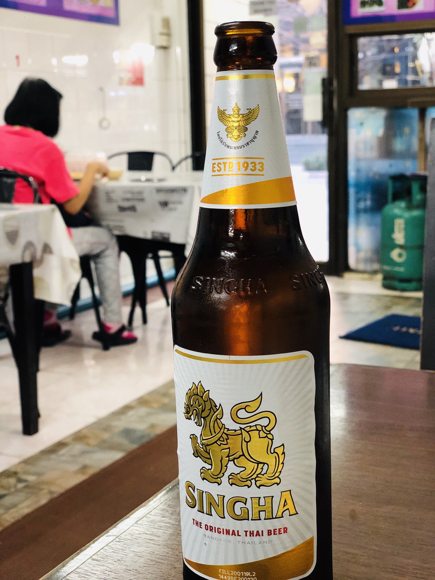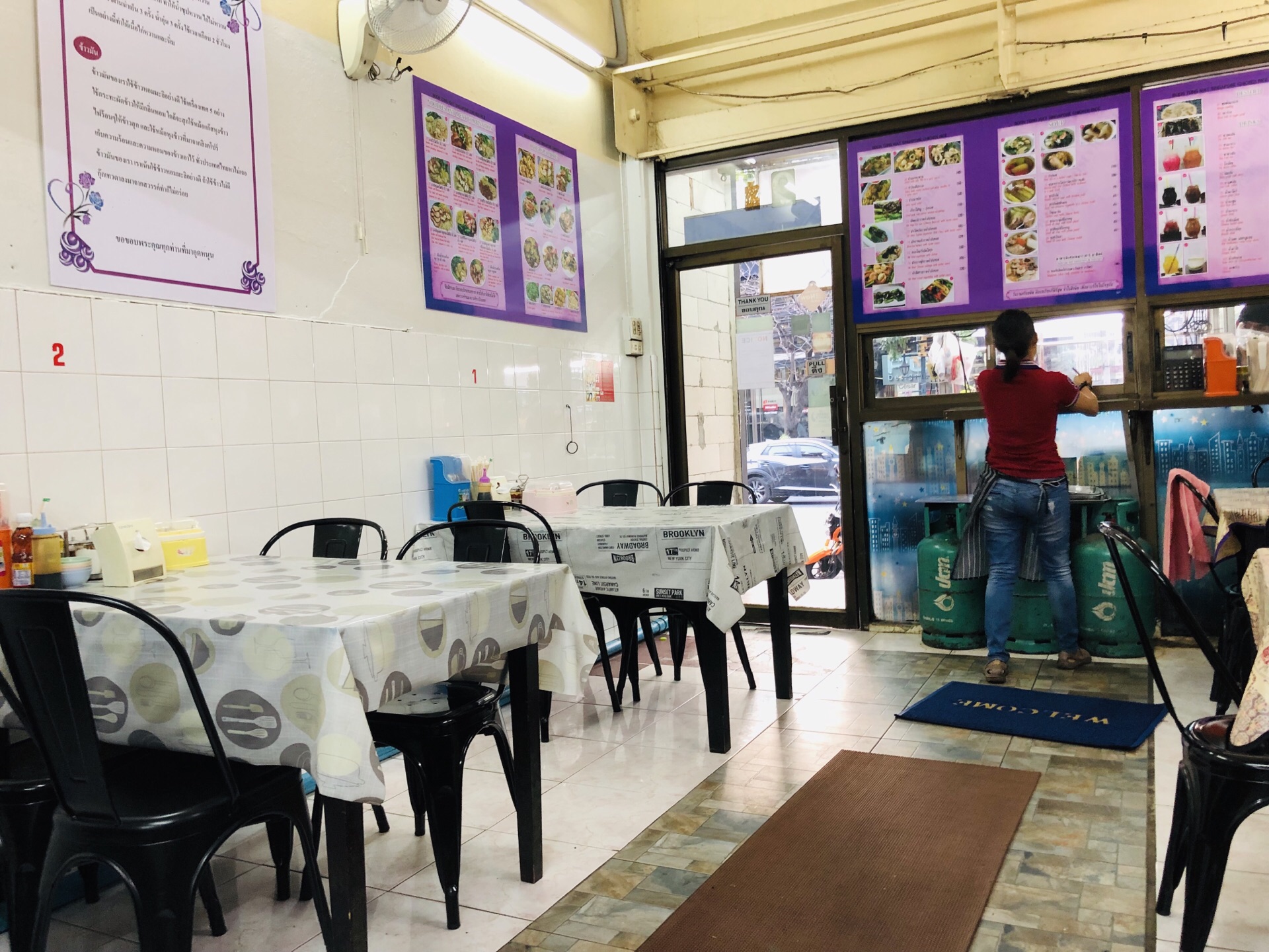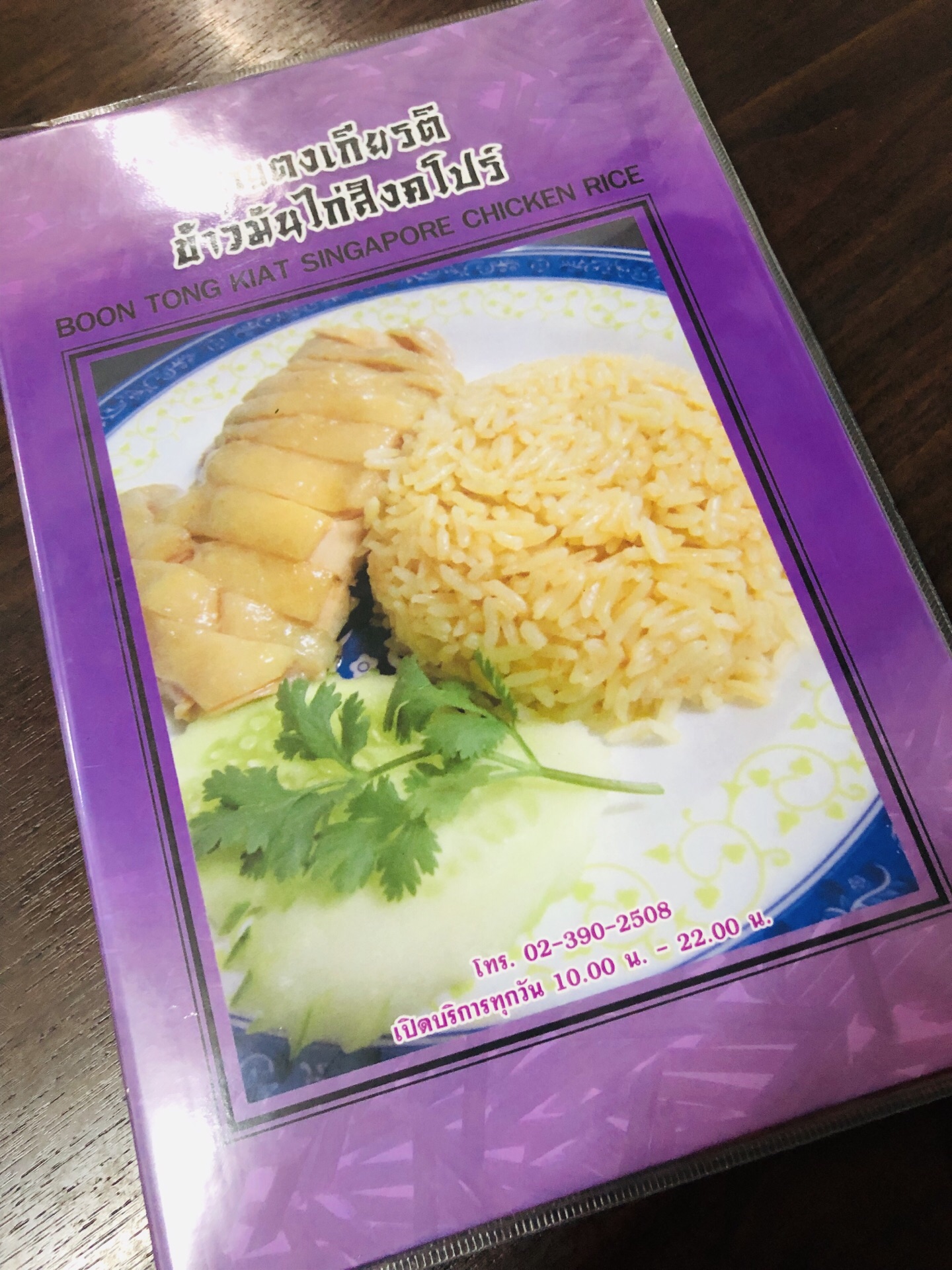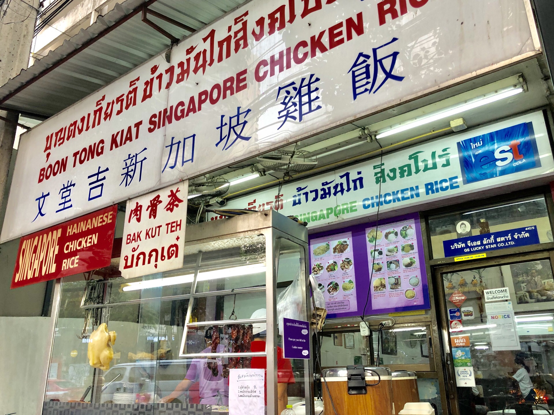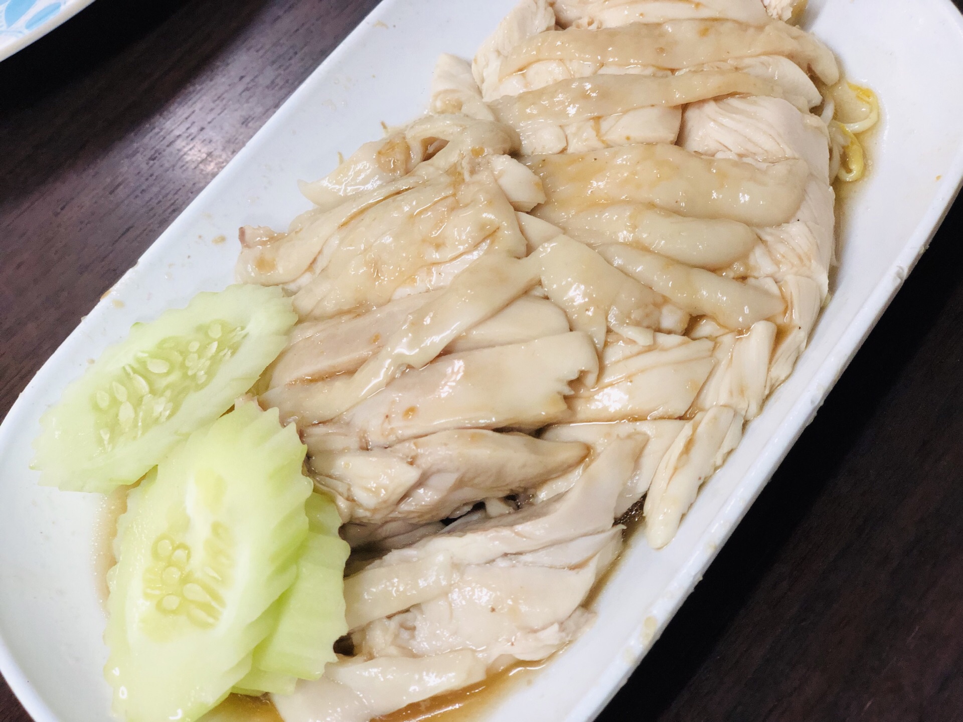 超级喜欢素坤逸这个区域,很多吃喝的地方,酒店也蛮喜欢的,所以来曼谷我一般都住这个地段,熟悉且比较方便。这家是做新加坡鸡饭的,不知道老板是不是南洋人。看看环境还行,淡紫色的,就进去吃点坡国的白斩鸡。都是调味好的,很嫩,鸡肉不错吃,点了一份不要米饭的,加了啤酒,估计这几天喝下来要啤酒肚了。 另外还送了一碗汤,没啥特别的味道,反正又不吃米饭。蔬菜就是空心菜,加了蒜头炒炒还挺好吃的。煎的香菇有点偏干,吃了一半就腻了。