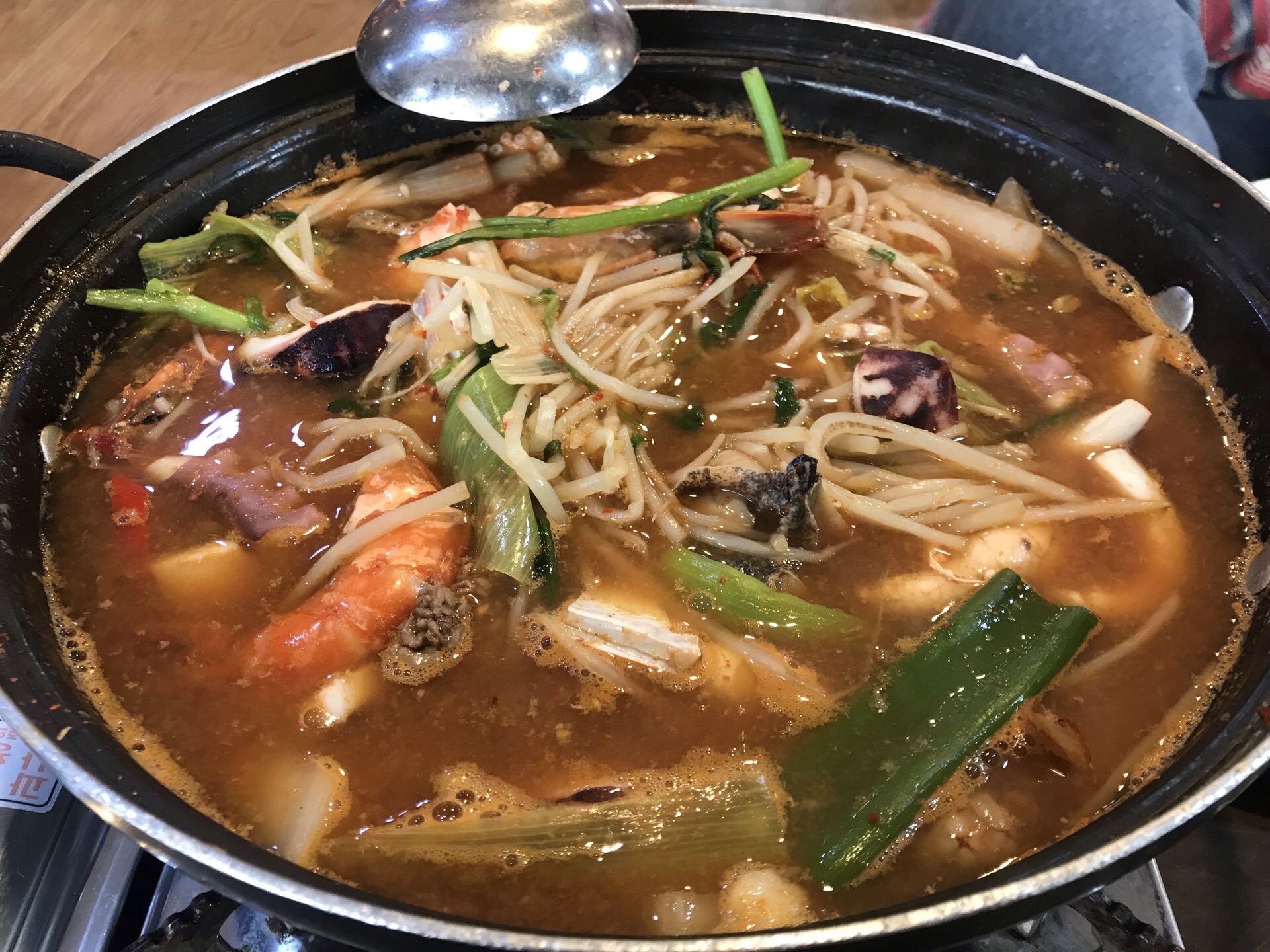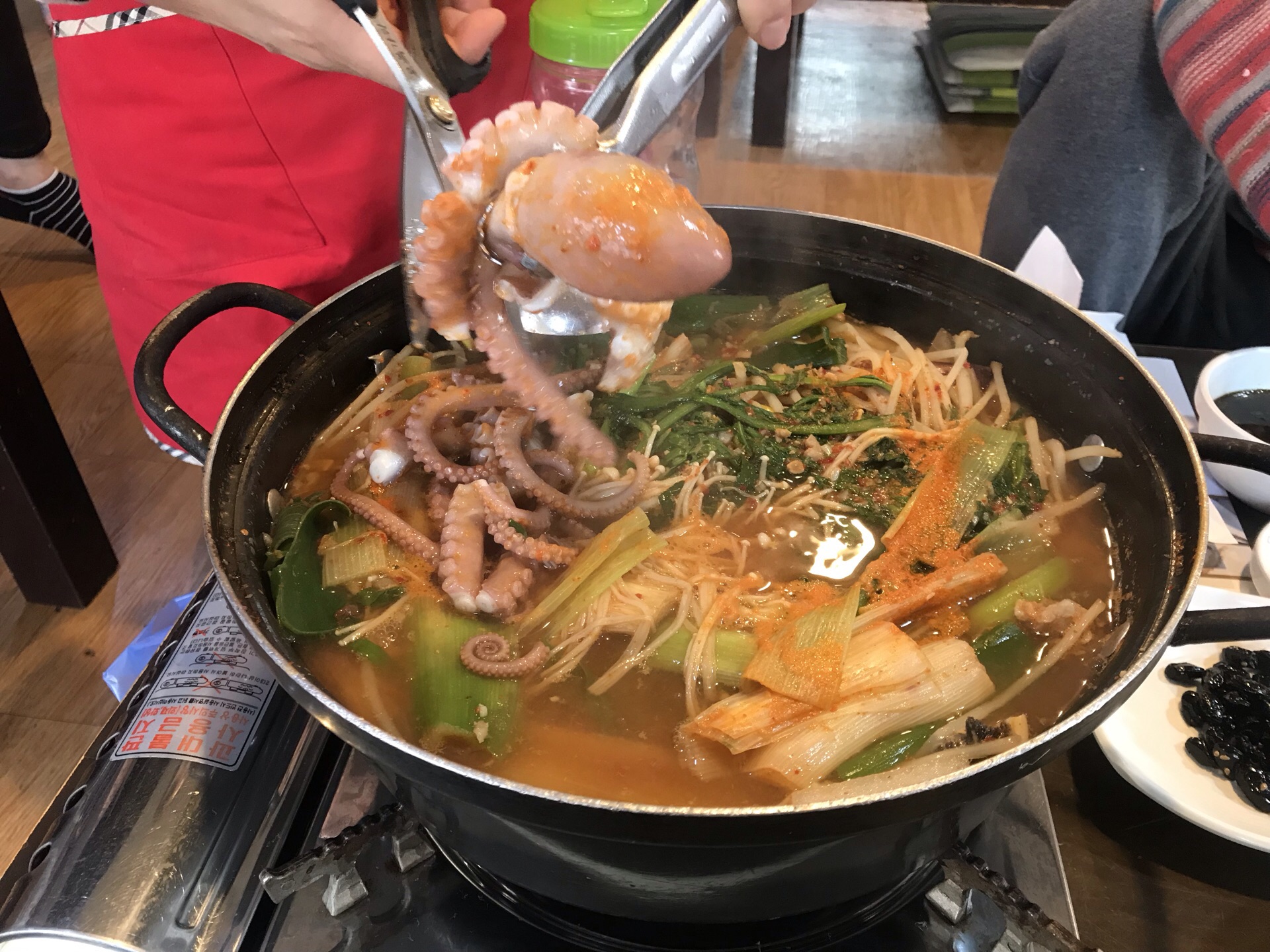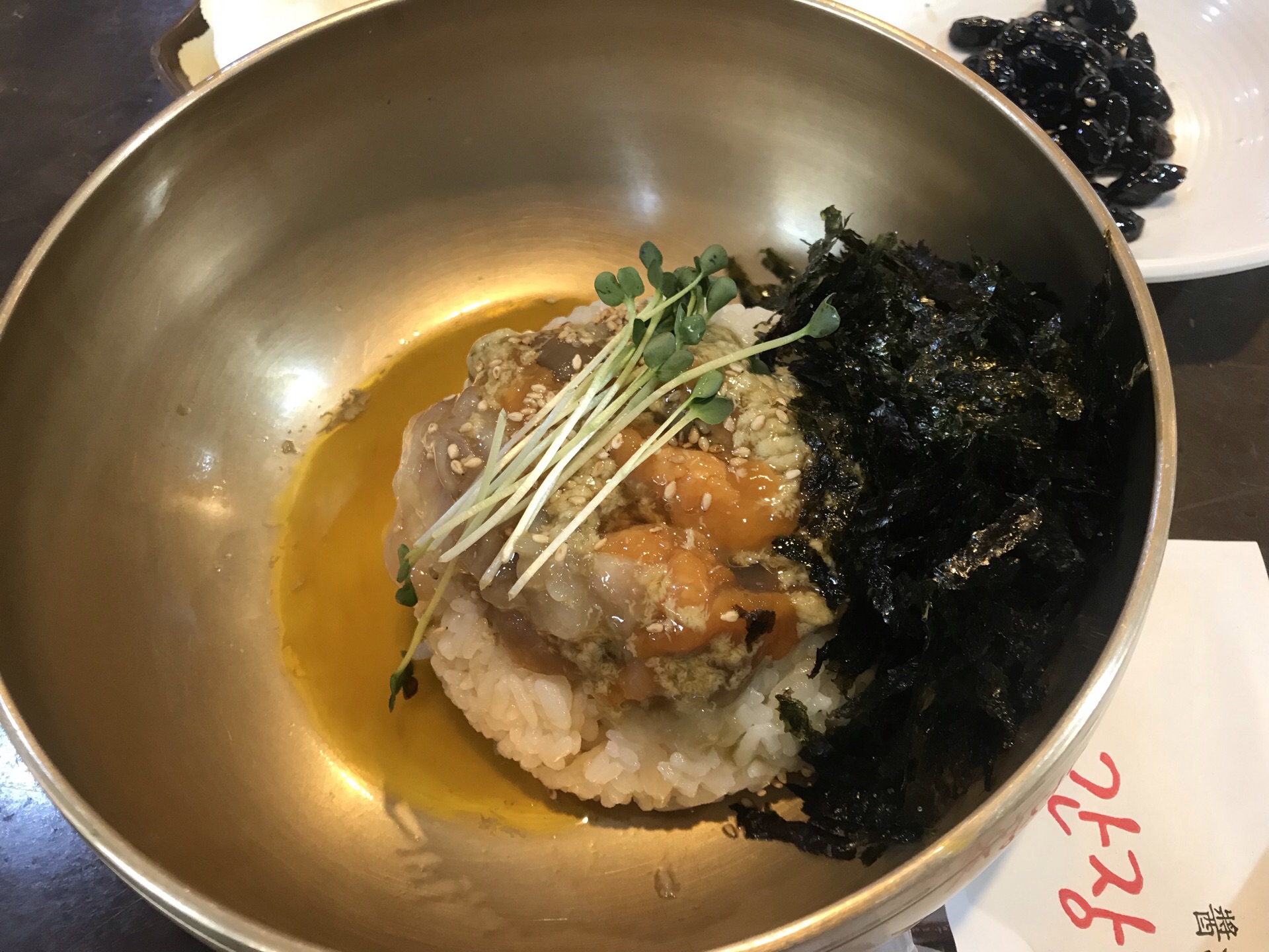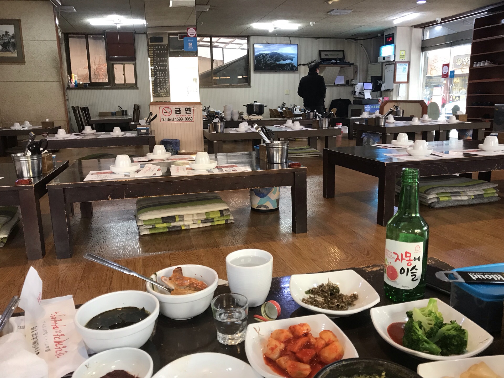 我们是过了饭点去的,居然都没人有点包场的感觉。一进店里有左边都是传统席地而坐的餐桌,右边有几桌是椅子座位。我比较喜欢传统的席地而坐的位子,因为天气冷所以没有点酱蟹,点了海鲜锅。上来一大锅里面是活章鱼,还点了蟹黄拌饭超级好吃。有个会讲中文的大妈服务很好,总体满意。