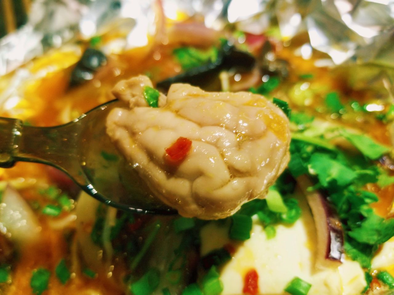 一把鸭肠,口感脆,味道好吃。 脑花味道有点接受不了,不是麻辣的,有点腥。 藕的味道一般