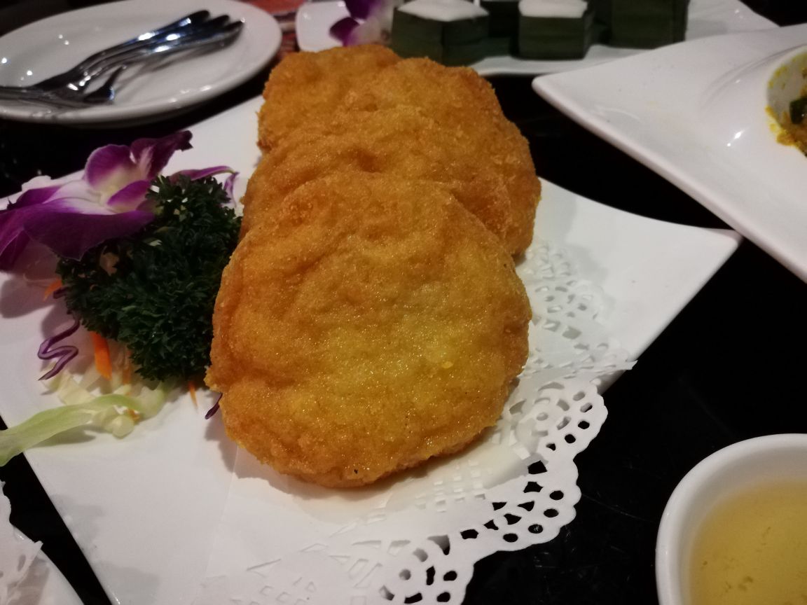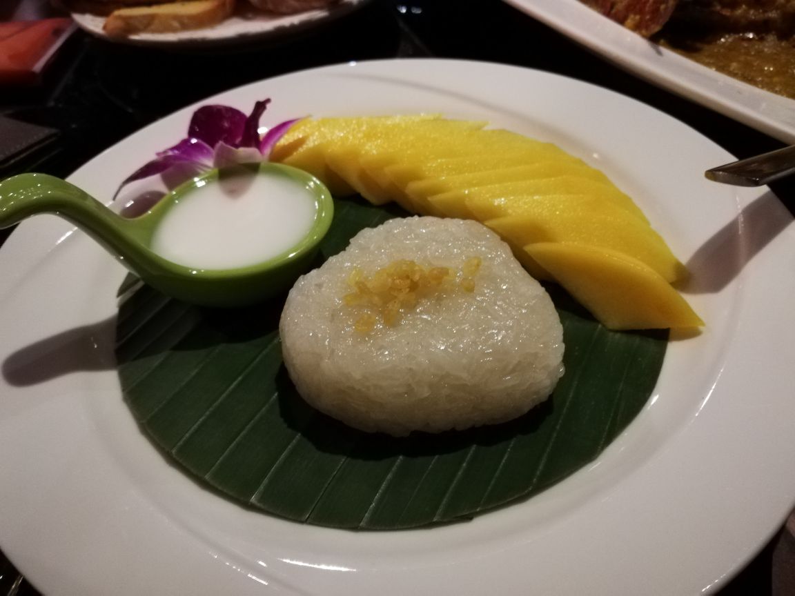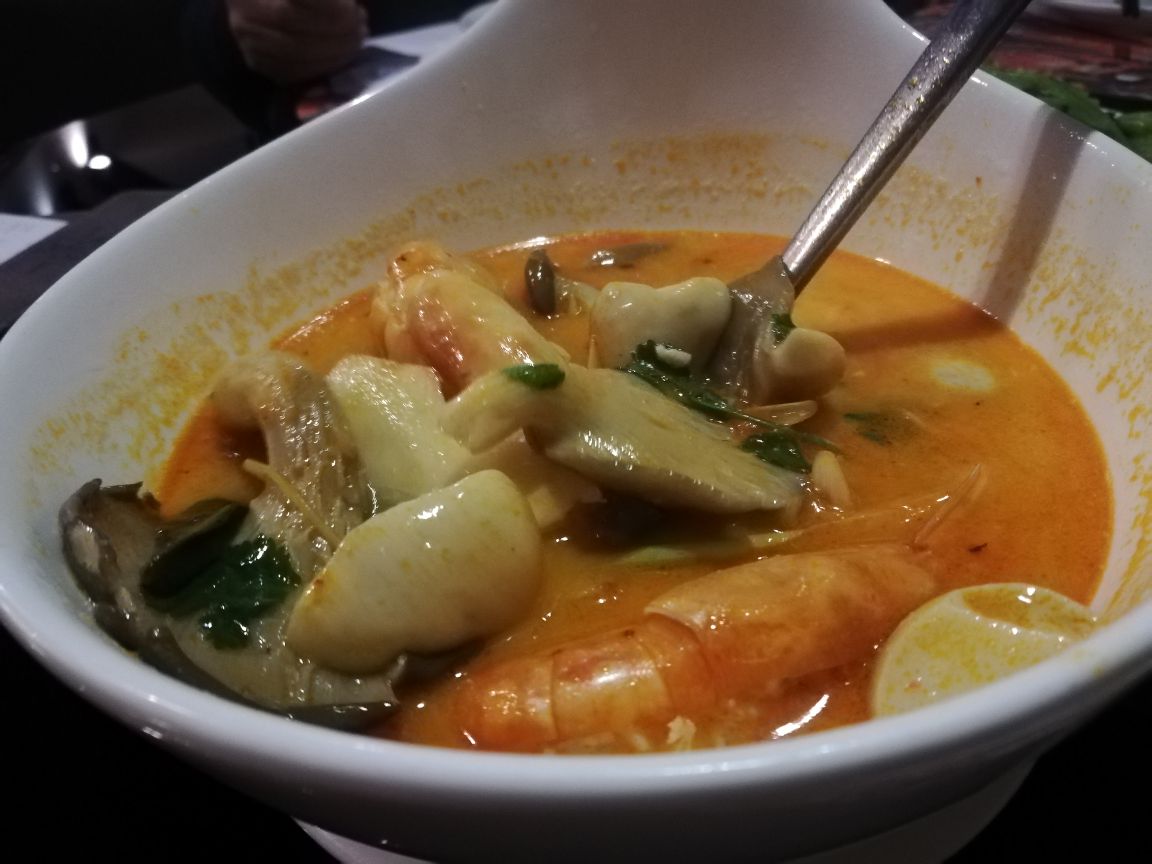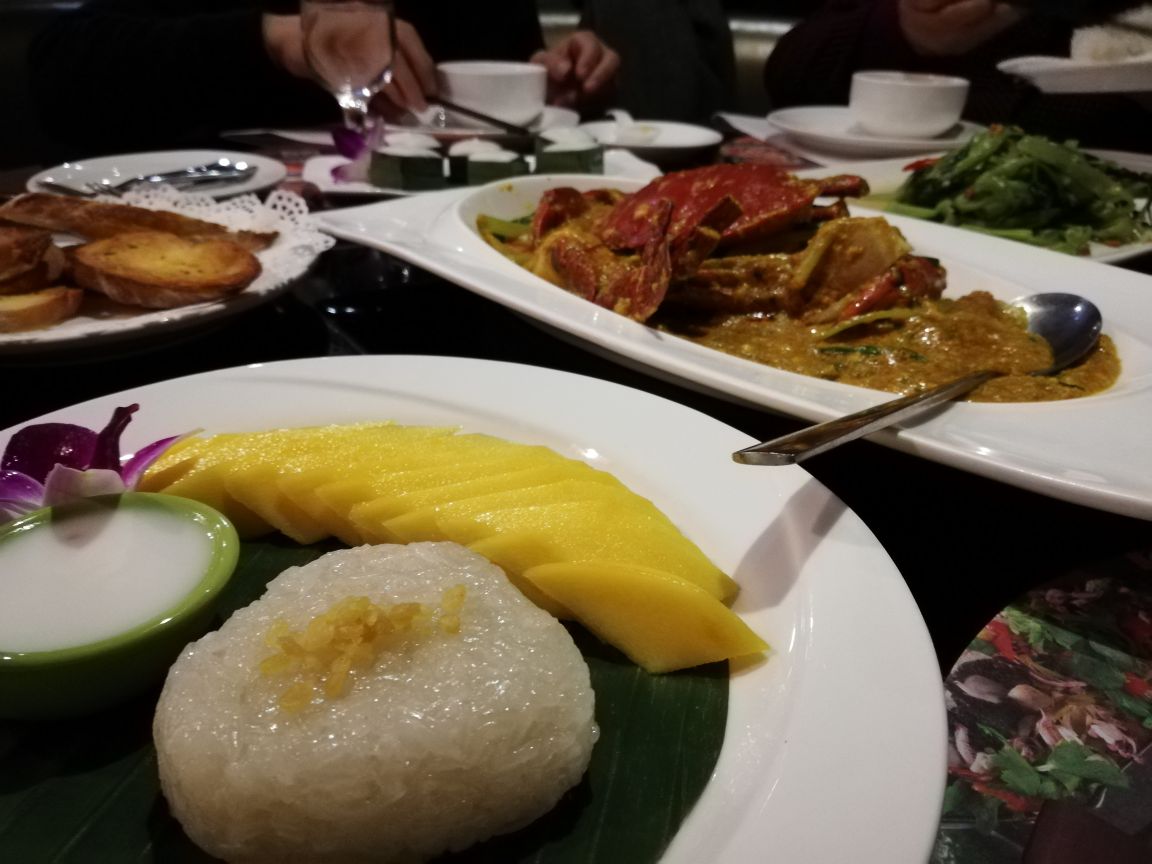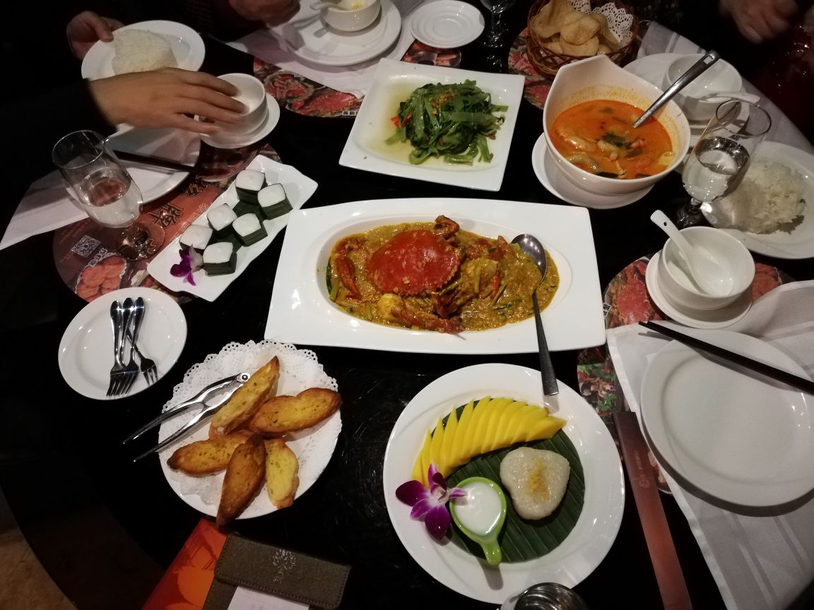 入住酒店,4楼很有名的泰国餐妥妥打卡,住客可以打折 咖喱蟹,蟹肉饱满,肉质鲜美,咖喱香味浓郁配着椰汁,适合拌饭,一口下去满足。 冬阴功汤,是泰国国汤,必点,味道酸辣,里面有柠檬叶,香茅,辣椒,虾,菇类等,集合了酸辣甜咸,浓浓香料的味道。 虾饼,满满炸肉,肉质有弹性。 如果没有泰式甜点,这顿饭就是不完整。饭后甜点都很甜,在吃完具有强烈香料和草药味道的饭后,甜品特别受欢迎。