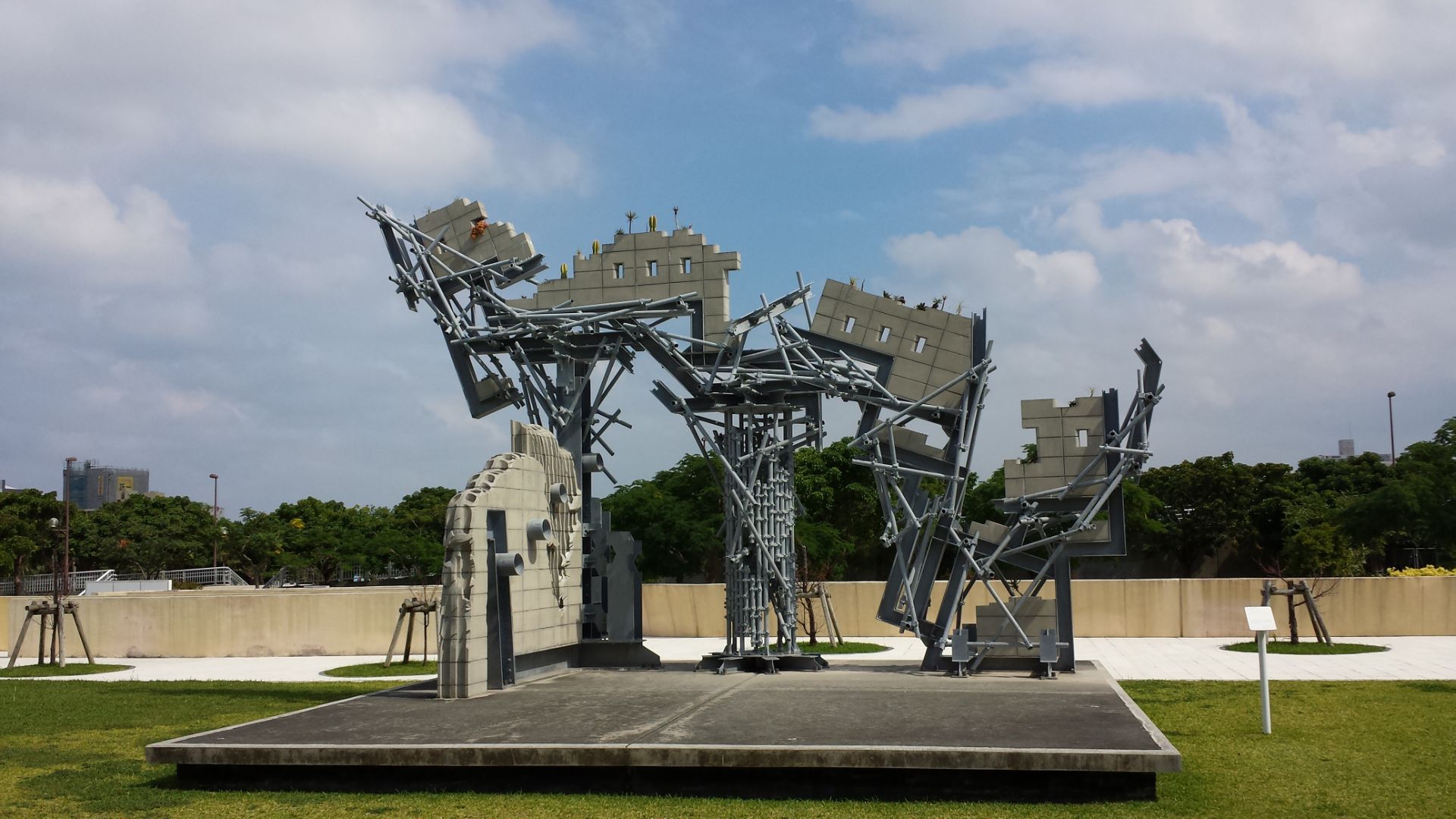 在冲绳县立博物馆美术馆的外围草地上,有2件让我印象深刻的前卫雕塑,图一,这张好像一个正在玩吉他的乐手,线条流畅,颜色鲜艳,给人一种热情激扬的感觉,有音乐韵律的感觉。图二,一尊巨大的雕像,好像是机器做的恐龙骨架,从规模上,让人觉得有视觉震撼感。