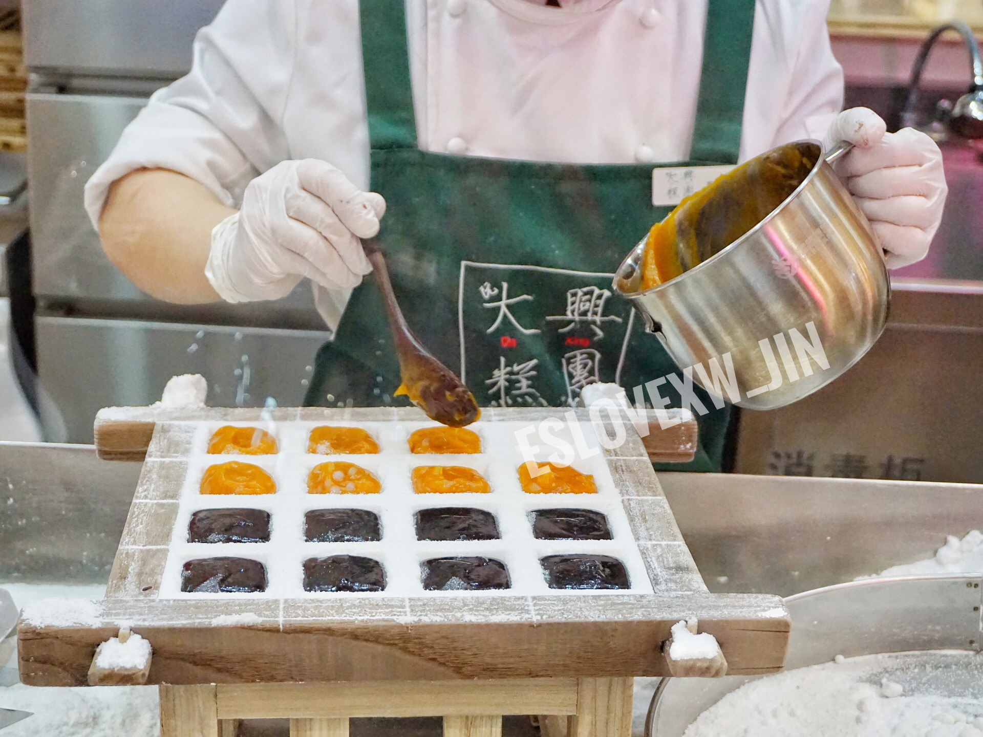 大兴糕团(湖滨银泰店) 地址:上延安路258号 湖滨银泰in77D区负一层 四色方糕 下单后要等待40分钟才能过来取 还可以看到现场制作的过程 拿到手还是热乎乎的 这次包装也是新年的包装 带回去送人挺好的 一盒有八块 四种不同的口味 内馅分别为枣泥、红豆、南瓜还有黑芝麻 我最钟意的还是枣泥的 桂花米糕 这款桂花米糕不是很推荐 和外面的没有什么差别 口感略带干涩 而且不是现场制作的 但是它是独立的小包装 存放的时间可以久一点 顺便提一下在现场吃的那个 绿豆糕和橘红糕味道不错