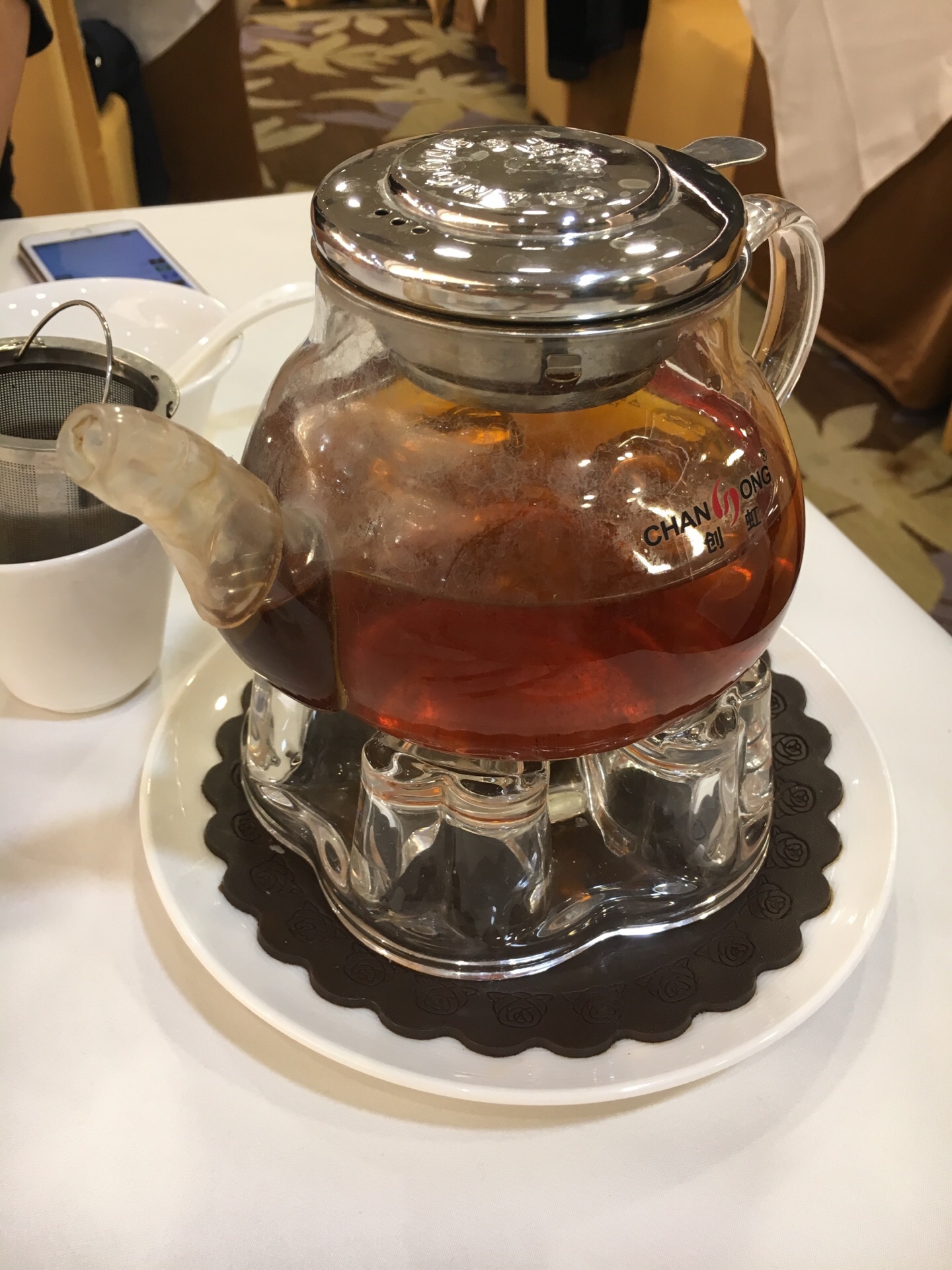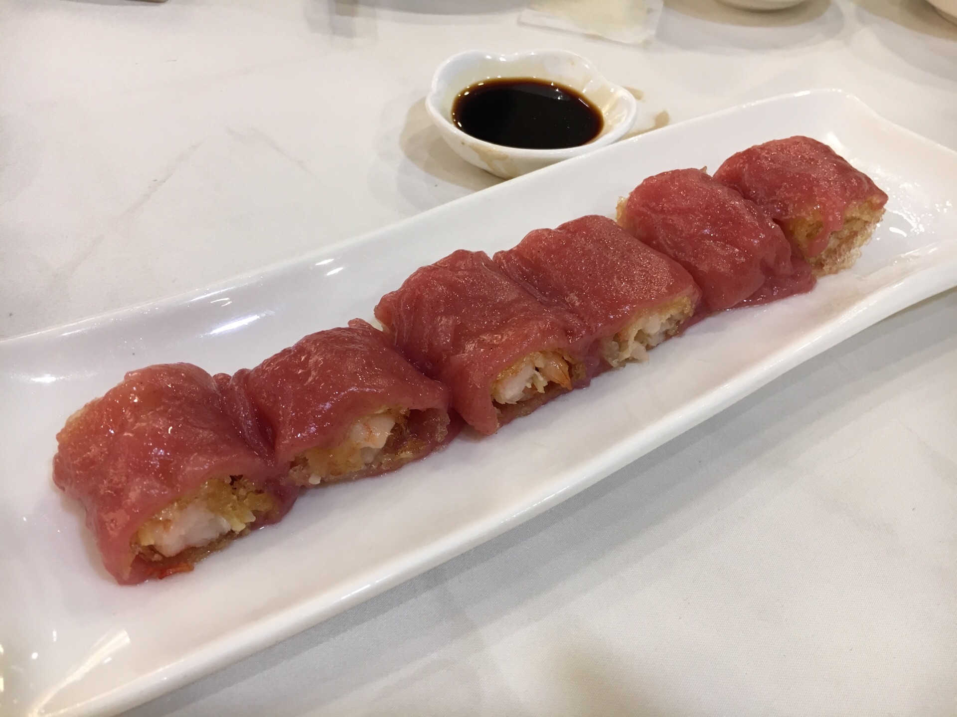 广州酒家是广州地区的知名老字号,是一家集餐饮、食品加工等为一体的大型餐饮连锁企业。这家店距离我们入住的酒店非常近,就在酒店旁边的友谊商店内。去得早,专门赶过去吃早茶,坐扶梯上到六层,酒家还没有开门,门口就已经有不少人等位了,好在里面就餐面积够大,没有遇到排队的问题。 这次主要点了五色烧卖皇、金沙红米肠、豉汁蒸凤爪、流沙包和香煎韭菜饺,茶水选择了祁门红茶,味道总体来说还是不错的。烧卖皇里面是饱满鲜香的大颗虾仁,外皮弹韧细腻。流沙包松软可口,咬开一块,里面的馅料像金沙一般缓缓流出,味道香甜绵软。豉汁凤爪软糯入味,韭菜饺煎得外皮金黄酥脆,馅料饱满。以上几样都不错,就是红米肠的水准稍差,粉皮太软,没有筋道弹韧的感觉,相比之下还是点都德的红米肠做得好。 总体来说,这家环境菜品都还是不错的,服务有时需要等待,感觉服务员还是有点少,用餐加收百分之10服务费。早茶人不少,人气还是很旺的。