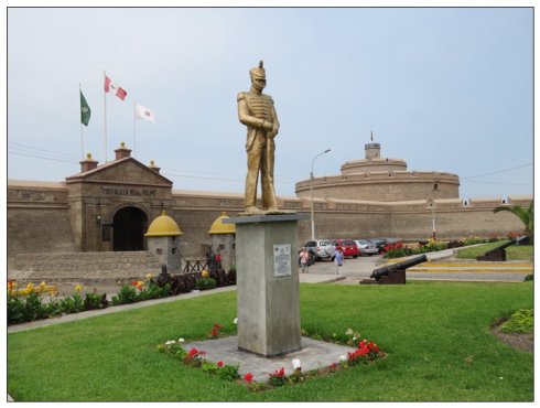 我们去的那天,到了门口被告知,今天是秘鲁建军节,免费参观,呵呵!城堡呈不等边五角形,每边上建有碉堡,分别命名为“国王”、“王后”、“圣费里佩”、“圣卡洛斯”和“圣何塞”,每个碉堡上有仓库,用于储藏火药。只有前两个堡垒上有塔楼,称为“骑士”塔楼,各有一座吊桥供出入用