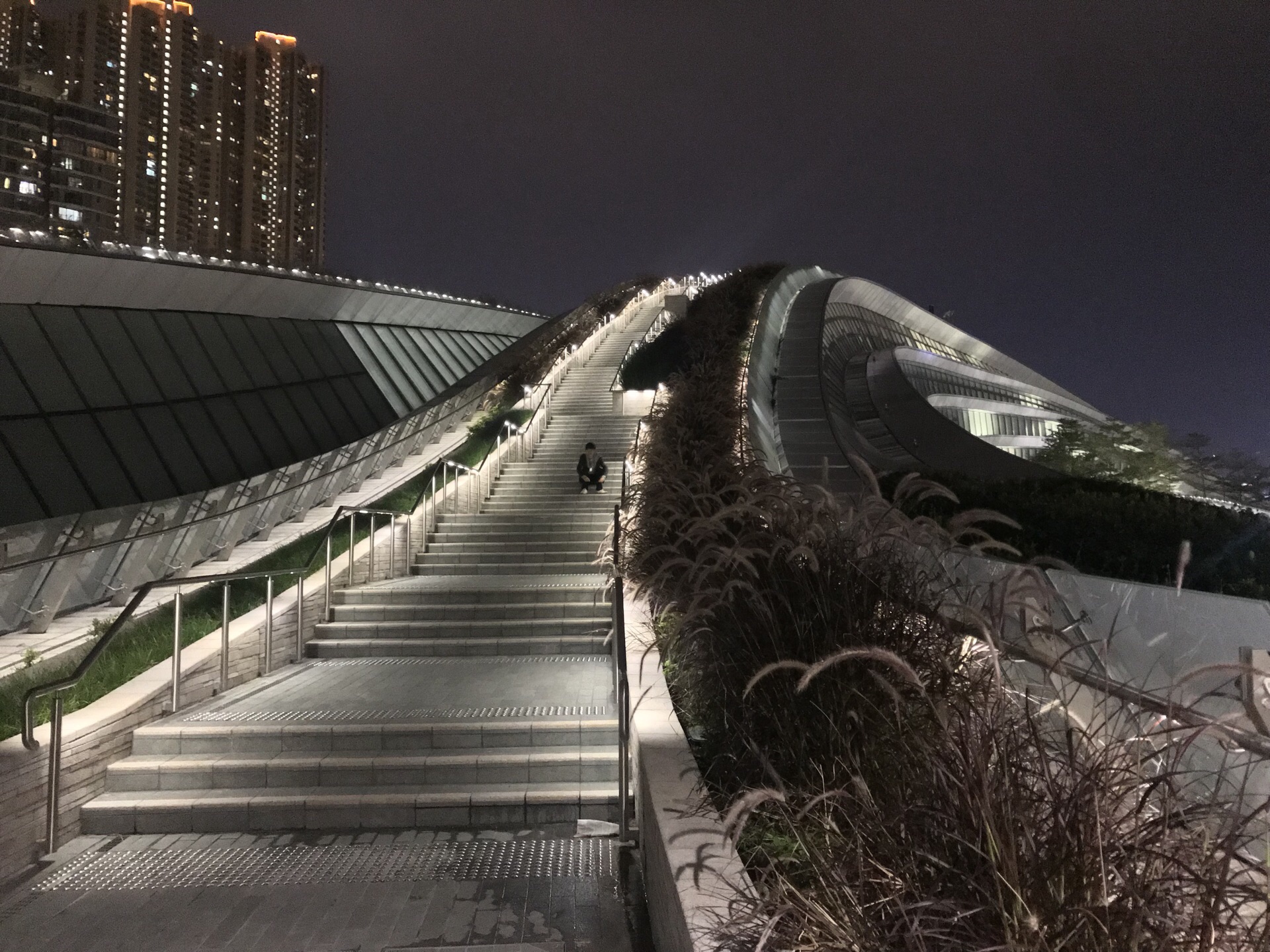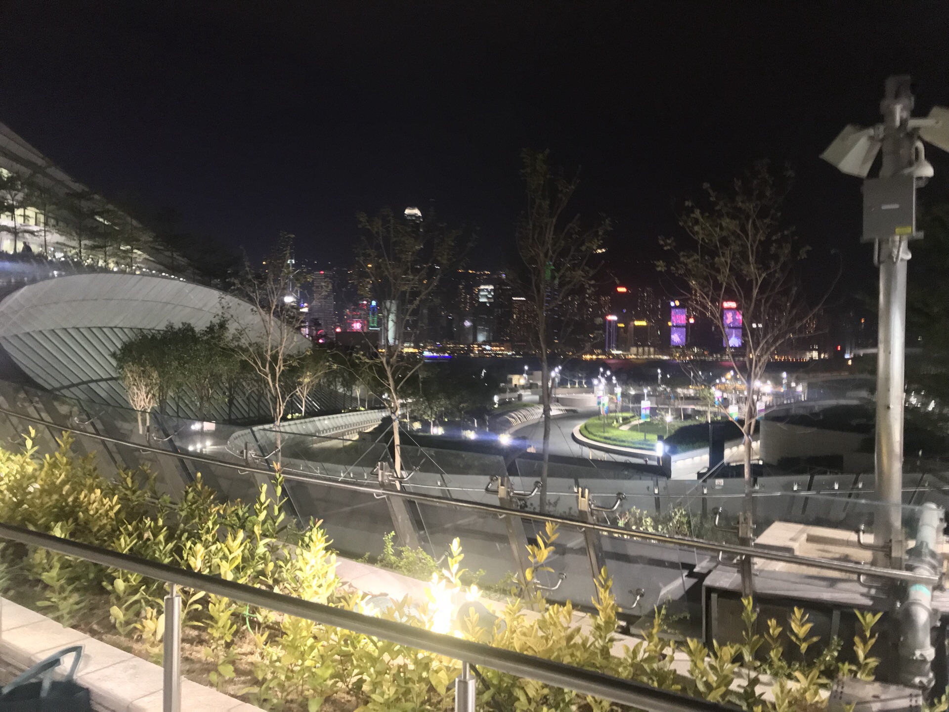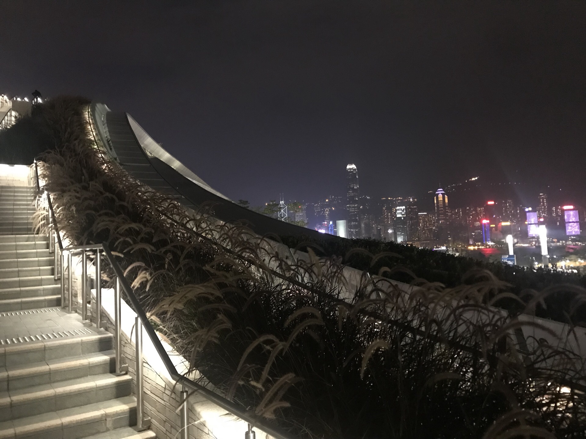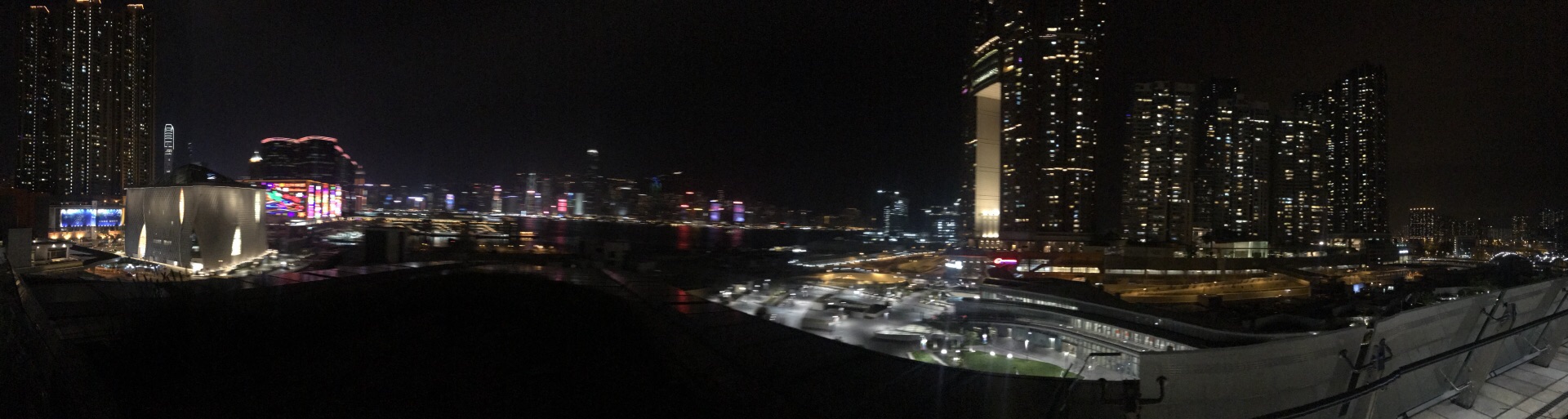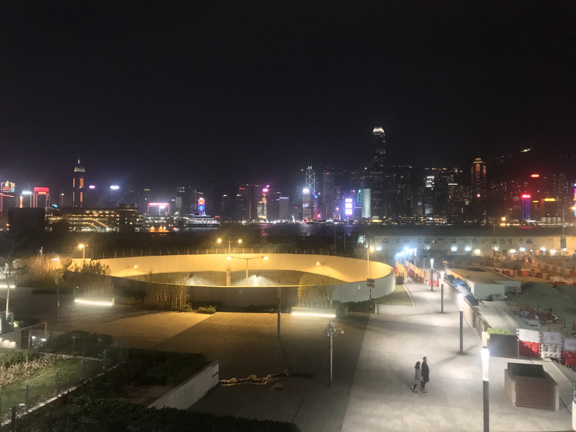 西九文化区是香港曾经希望建设成为达到悉尼歌剧院效果城市景观的填海区 可是因为预算等关系并没有将原来的天幕建筑群付诸实践 如今这里很多的地方因为没有开发甚至长满了野草 知道最近靠近海港城的第一座文化建筑-粤剧中心才建好 倒是这里成为了欣赏维多利亚港港岛的好角度 很多情侣回来这里跨年看烟花