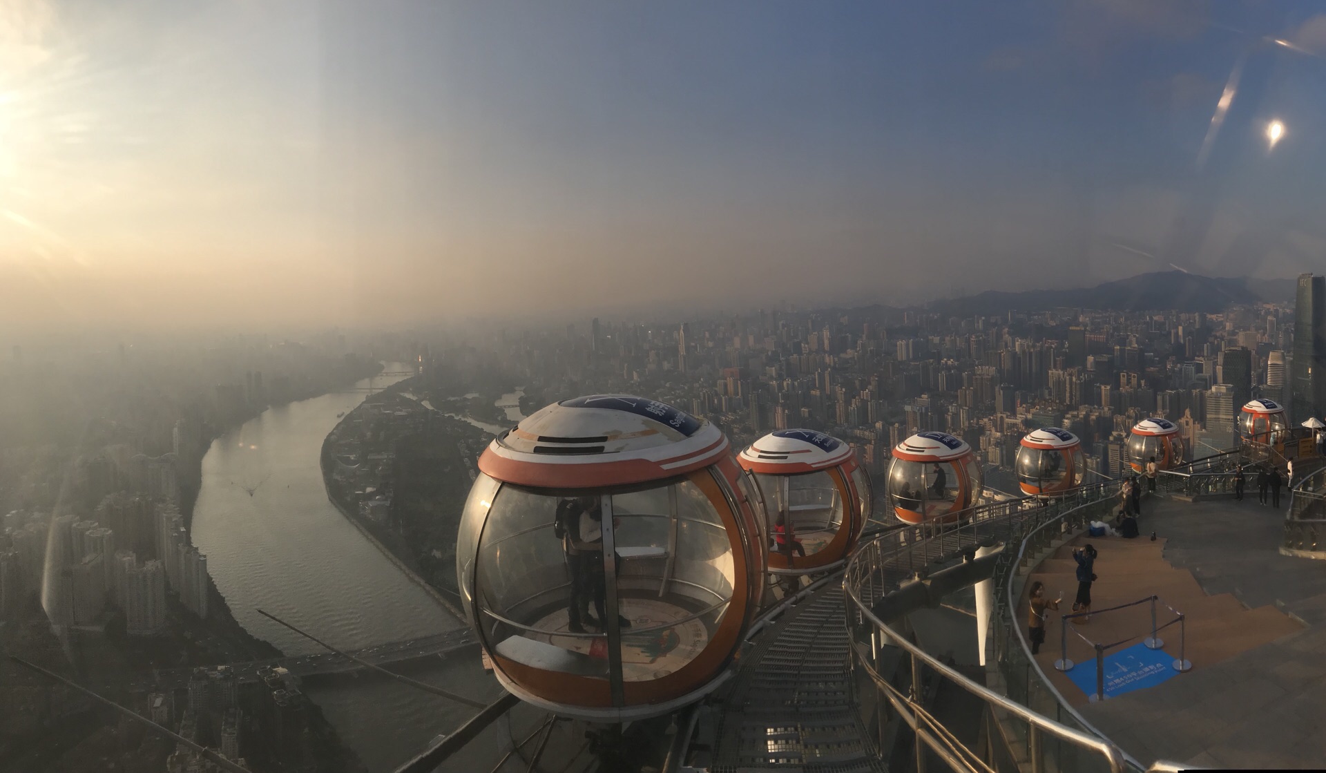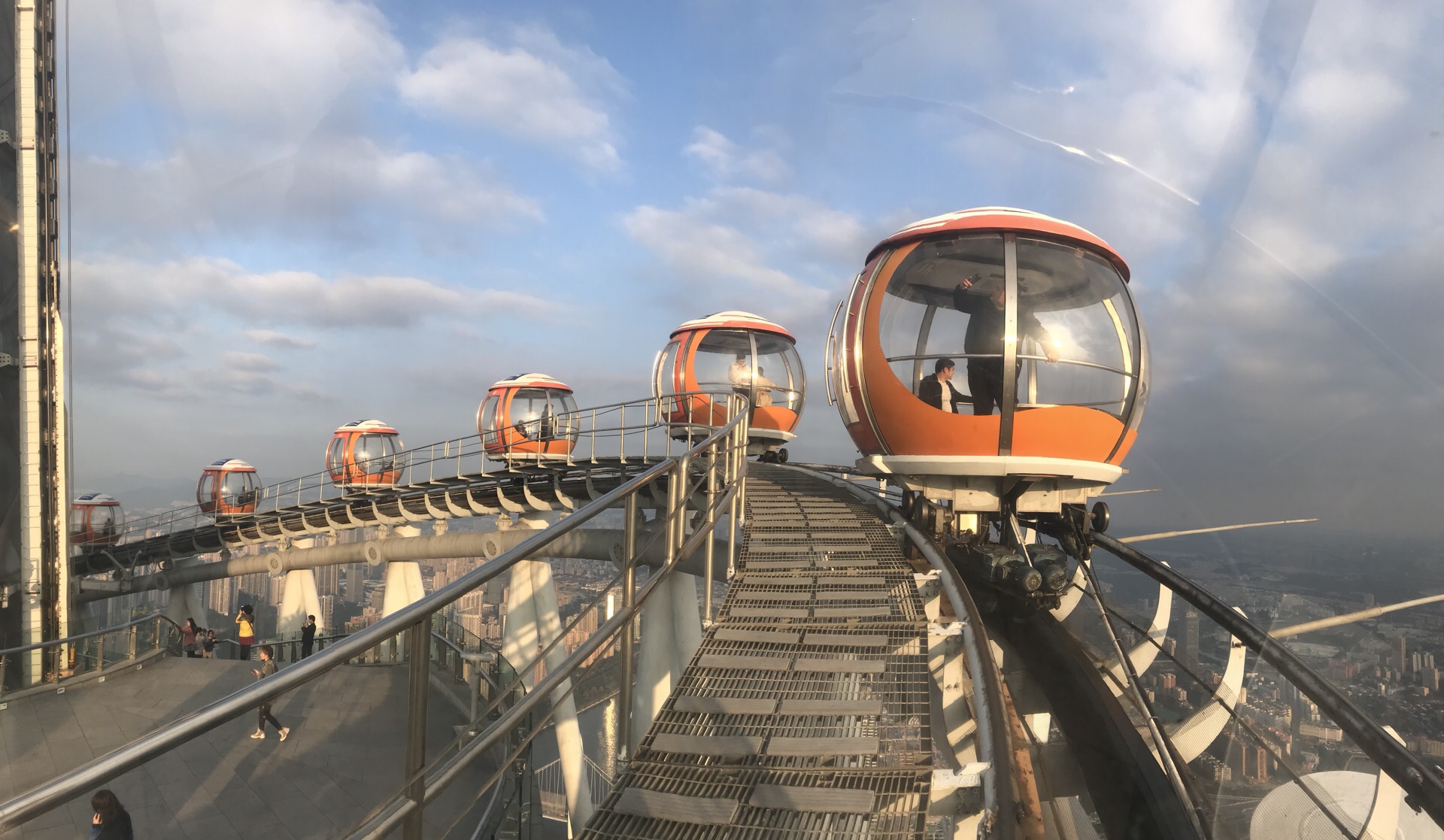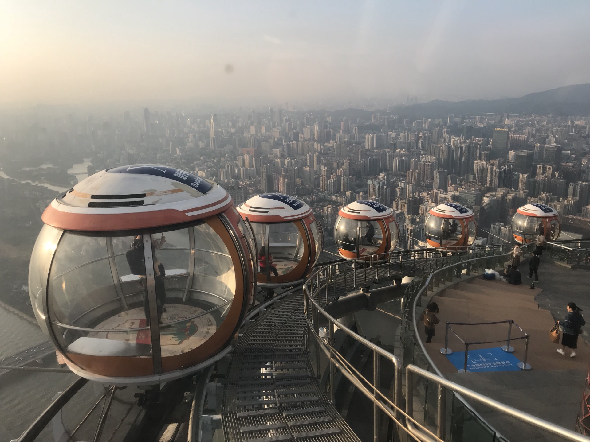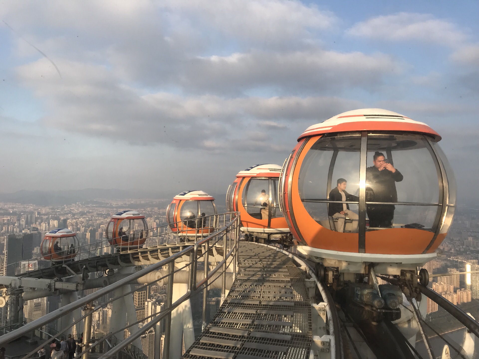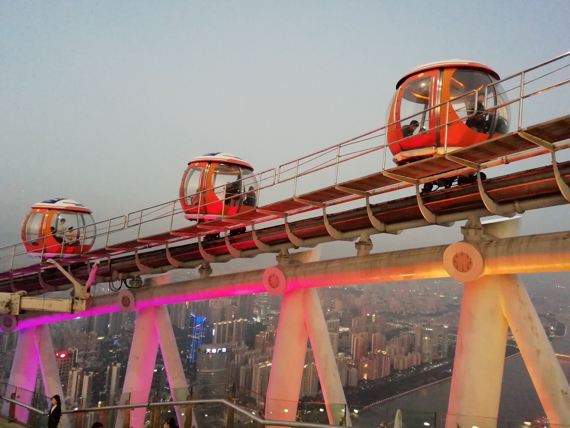 广州塔户外观光平台上有个十分有特色的横向摩天轮。第1次一个人来到广州塔,当时摩天轮在维护,没开放,我就尝试了另外一个项目,跳楼机,觉得十分刺激。这次是第2次上到广州塔,是和父母一起来的,终于坐到了这个摩天轮,感觉很有意思,在摩天轮上视野非常好。我们是接近傍晚时分上的广州塔,白天坐好摩天轮,等到晚上看完夜景才离开的。夜晚摩天轮在变幻的灯光下显得十分梦幻,父母也玩得十分开心。晚上户外平台上很冷,风很大,需要注意保暖。白天坐摩天轮的人不多,几乎不需要排队,但是到了晚上游客非常多,要排很长时间。想来玩的话可以注意错峰,当然如果刻意想要坐摩天轮感受夜景的话就要做好长时间排队的准备,摩天轮转一圈差不多40分钟左右。