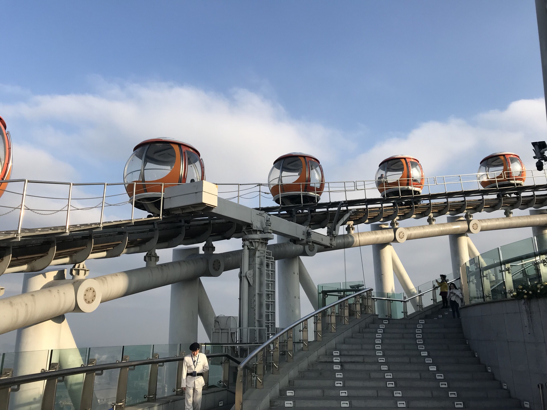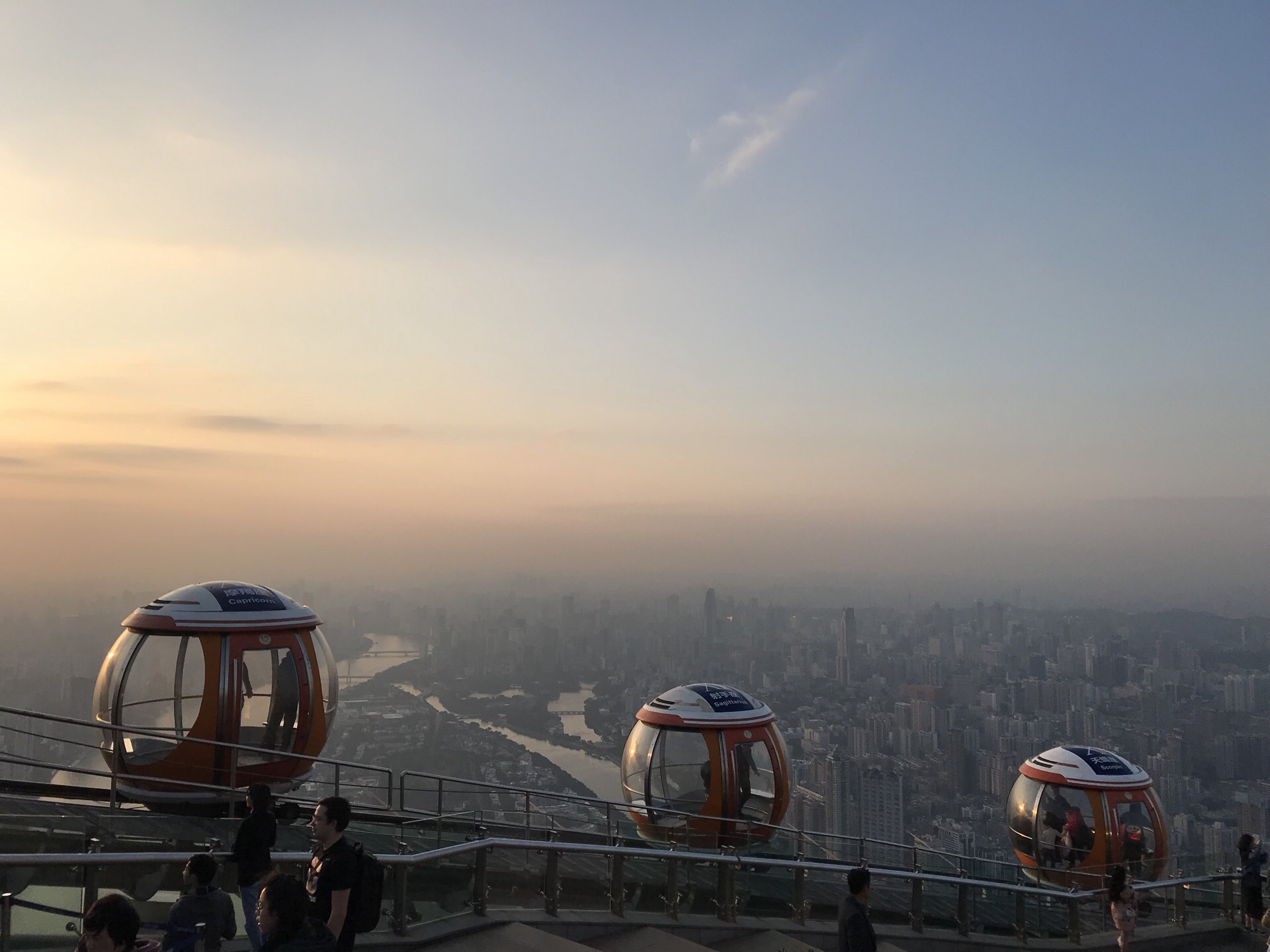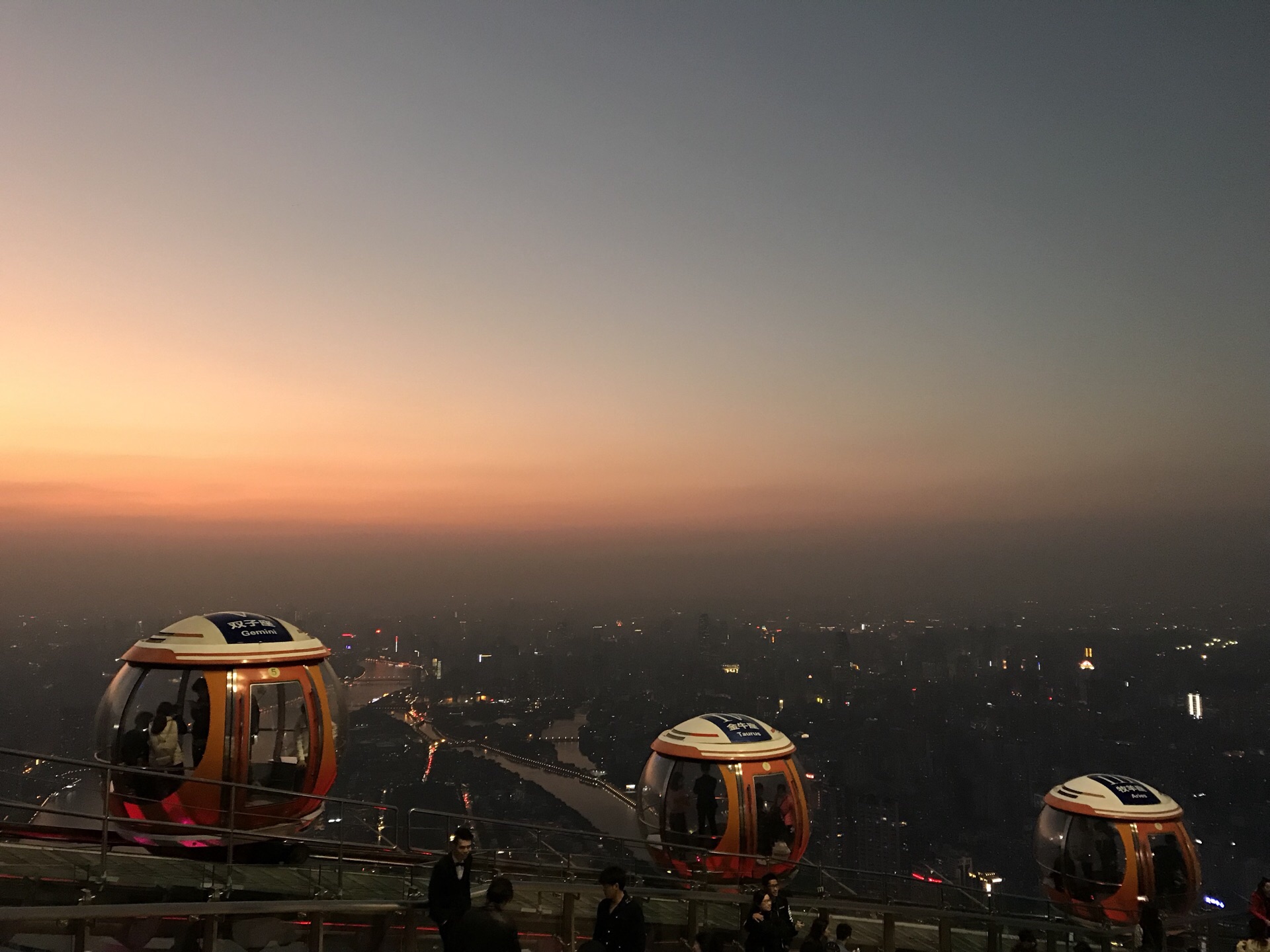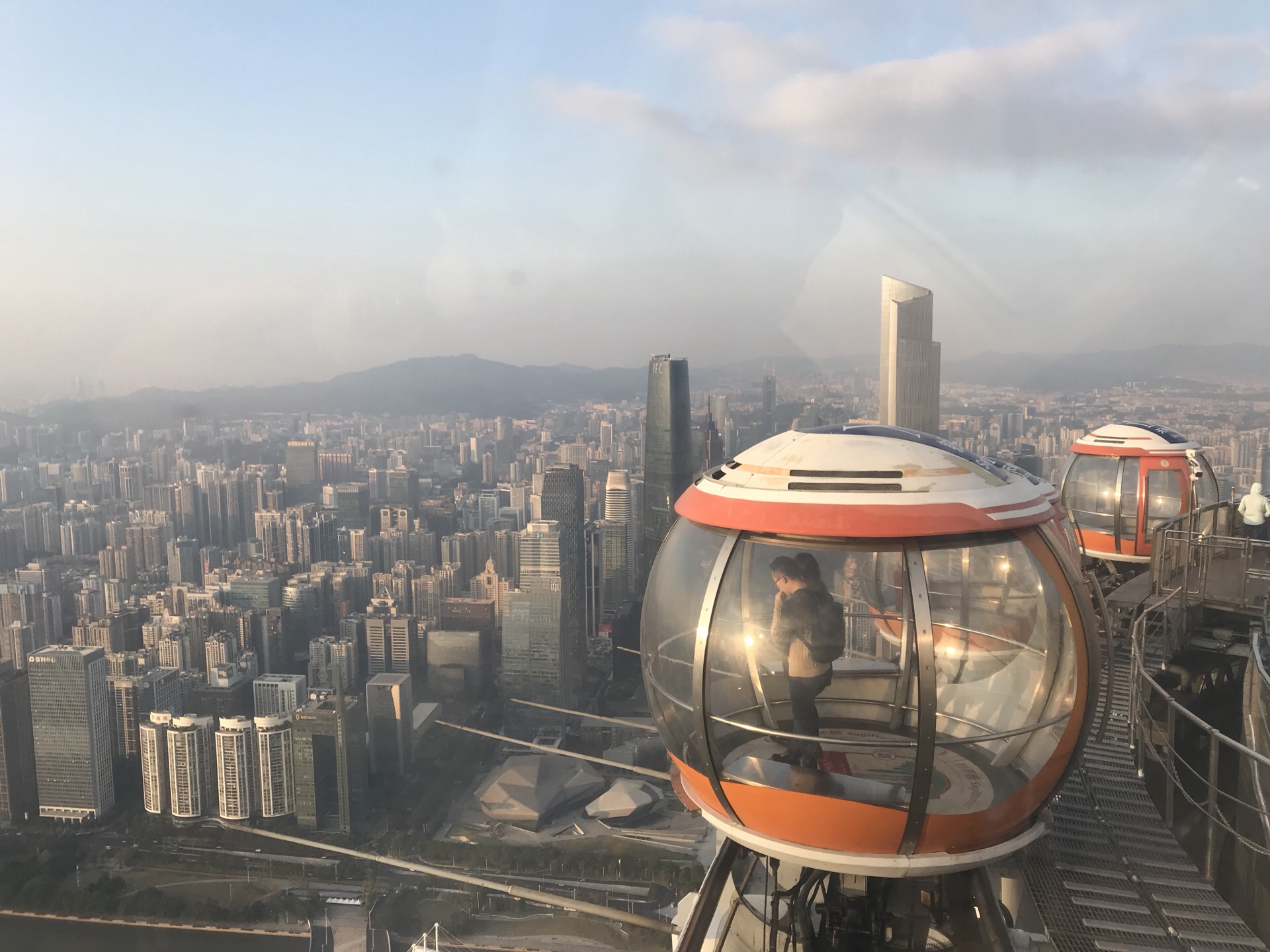 广州塔户外观光平台上有个十分有特色的横向摩天轮。第1次一个人来到广州塔,当时摩天轮在维护,没开放,我就尝试了另外一个项目,跳楼机,觉得十分刺激。这次是第2次上到广州塔,是和父母一起来的,终于坐到了这个摩天轮,感觉很有意思,在摩天轮上视野非常好。我们是接近傍晚时分上的广州塔,白天坐好摩天轮,等到晚上看完夜景才离开的。夜晚摩天轮在变幻的灯光下显得十分梦幻,父母也玩得十分开心。晚上户外平台上很冷,风很大,需要注意保暖。白天坐摩天轮的人不多,几乎不需要排队,但是到了晚上游客非常多,要排很长时间。想来玩的话可以注意错峰,当然如果刻意想要坐摩天轮感受夜景的话就要做好长时间排队的准备,摩天轮转一圈差不多40分钟左右。
