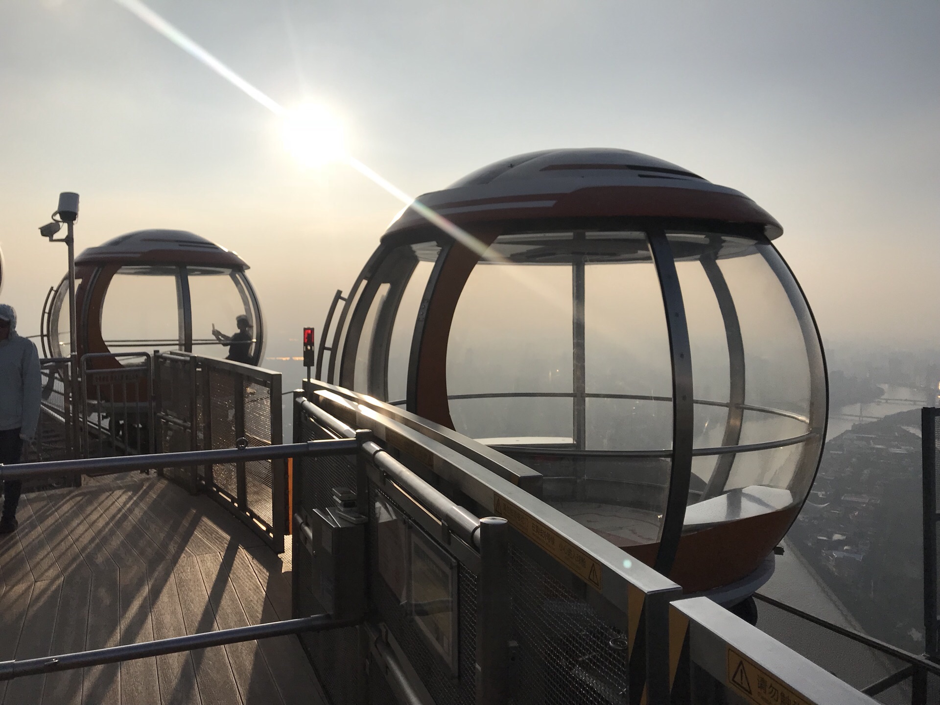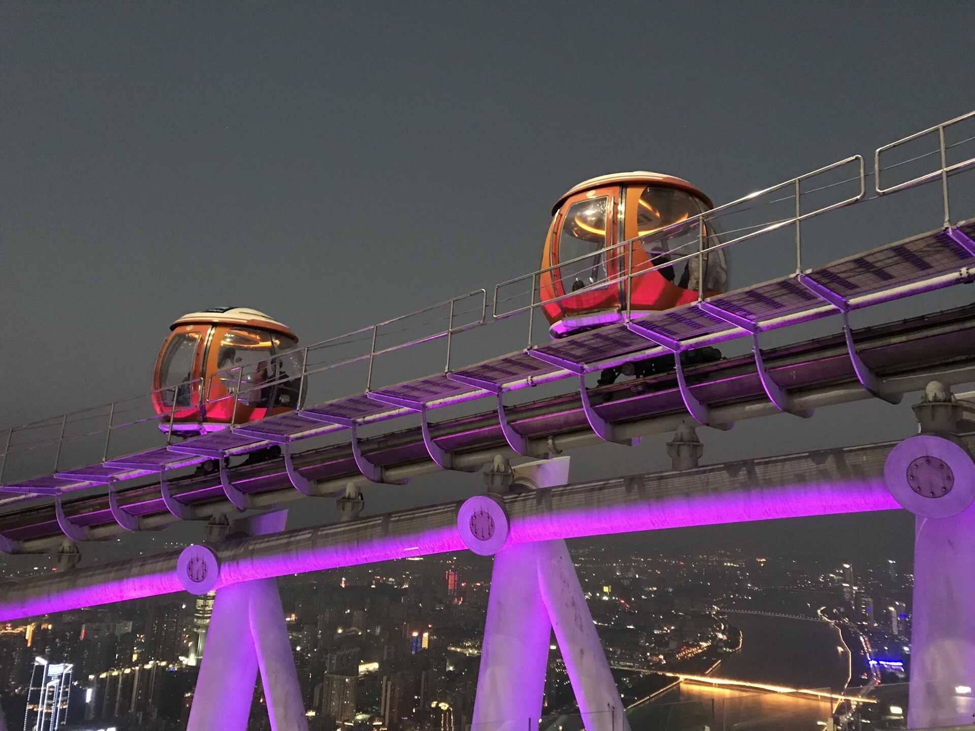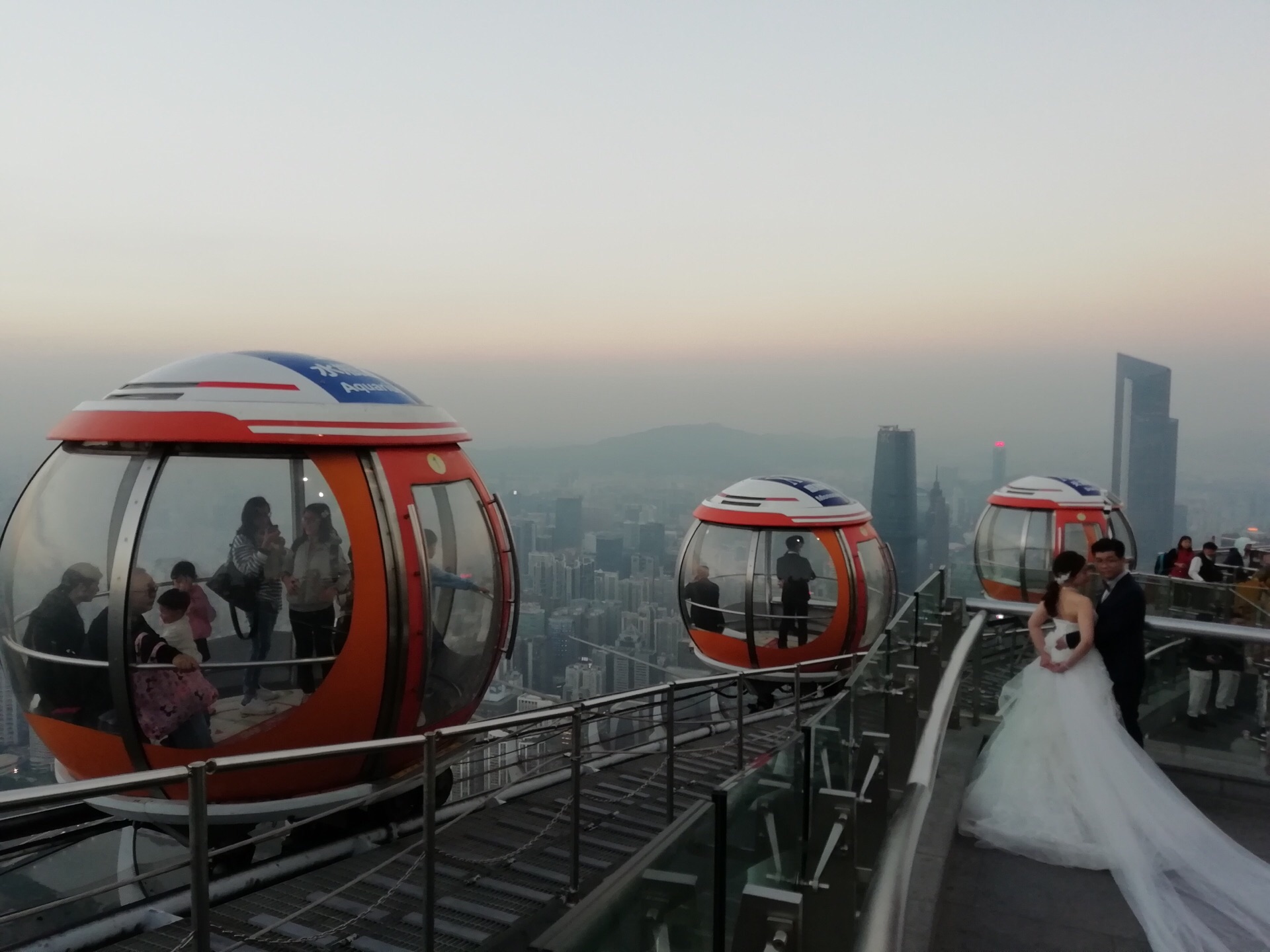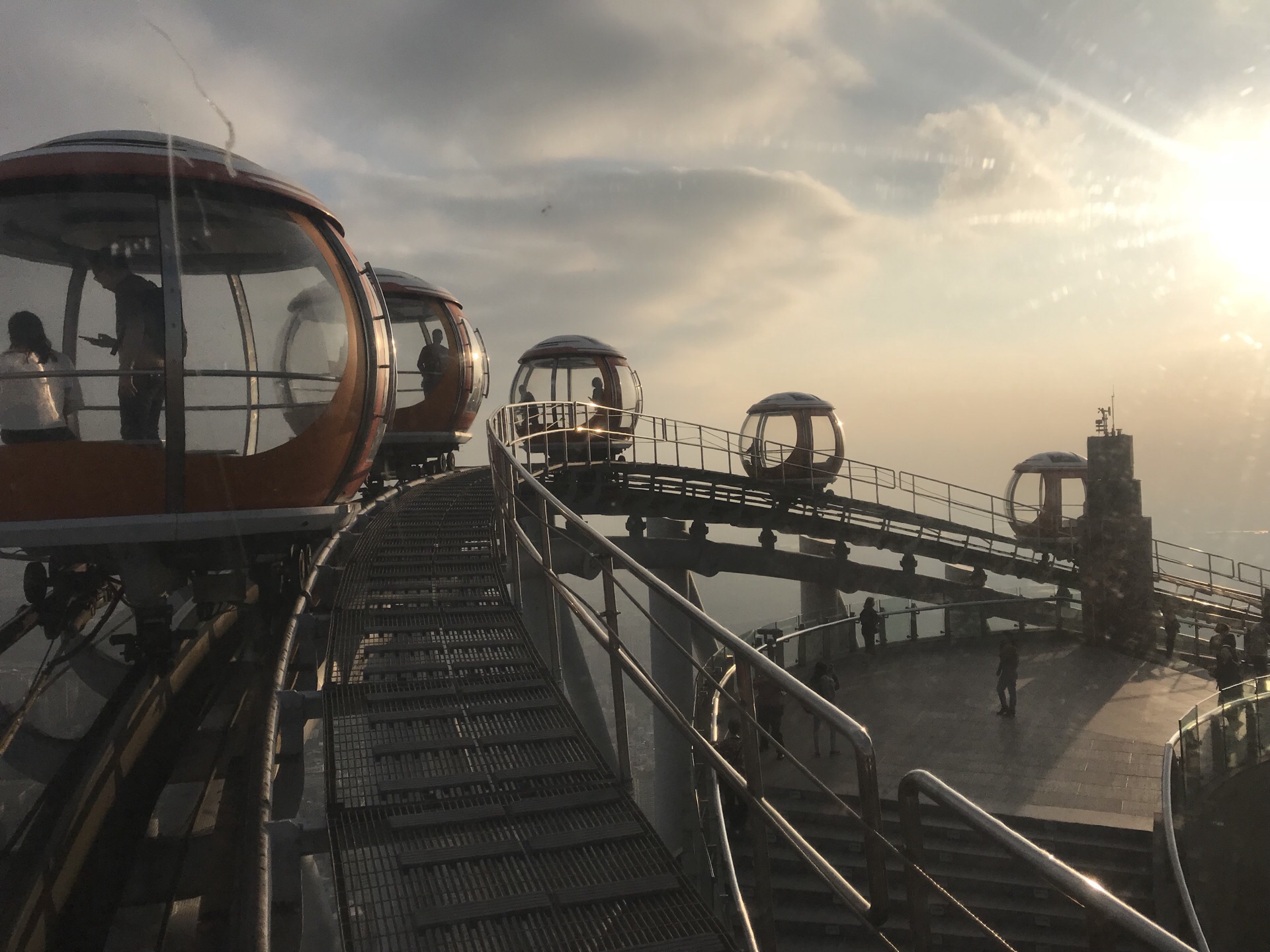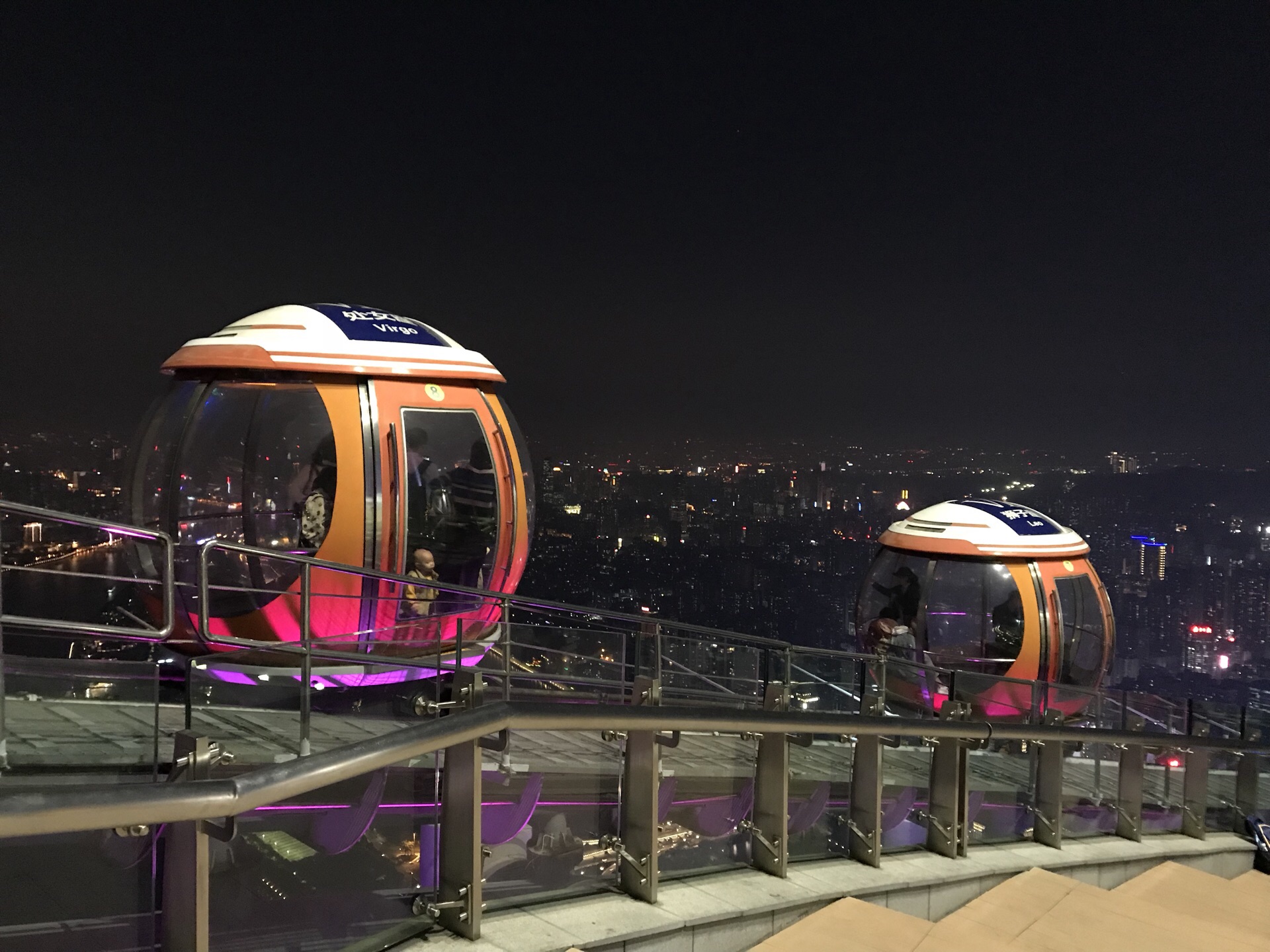 广州塔户外观光平台上有个十分有特色的横向摩天轮。第1次一个人来到广州塔,当时摩天轮在维护,没开放,我就尝试了另外一个项目,跳楼机,觉得十分刺激。这次是第2次上到广州塔,是和父母一起来的,终于坐到了这个摩天轮,感觉很有意思,在摩天轮上视野非常好。我们是接近傍晚时分上的广州塔,白天坐好摩天轮,等到晚上看完夜景才离开的。夜晚摩天轮在变幻的灯光下显得十分梦幻,父母也玩得十分开心。晚上户外平台上很冷,风很大,需要注意保暖。白天坐摩天轮的人不多,几乎不需要排队,但是到了晚上游客非常多,要排很长时间。想来玩的话可以注意错峰,当然如果刻意想要坐摩天轮感受夜景的话就要做好长时间排队的准备,摩天轮转一圈差不多40分钟左右。