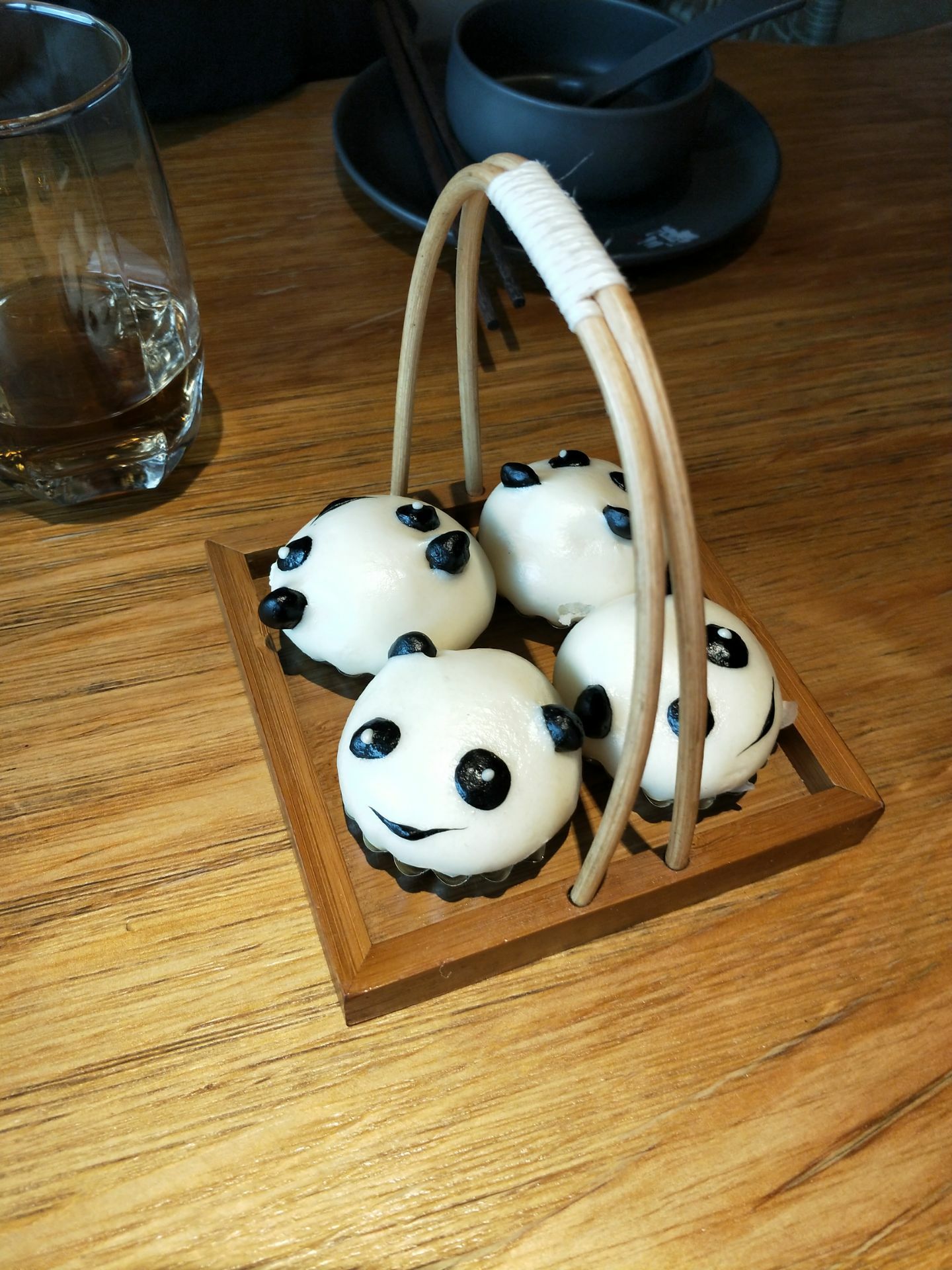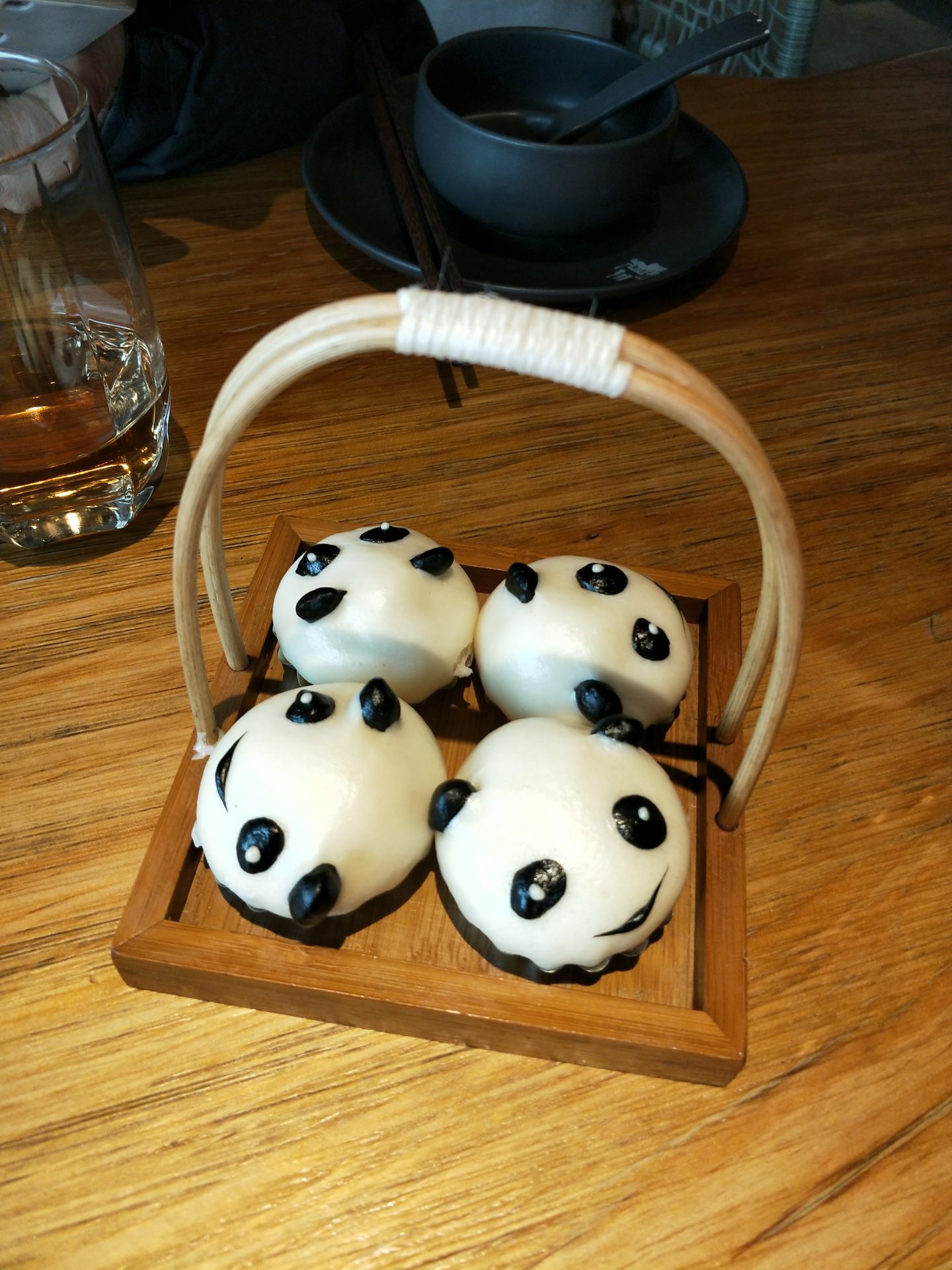 逛完大慈寺,已经是中午了,附近想找家店吃点点心垫垫饥,抬头就看见了它家的招牌,就远了他家。 进店后,选了靠窗边的位置,算得上是景观位。 它家标榜是创意川菜,菜单上的菜品不是很多,看上去摆盘都很漂亮精致。点了最受欢迎的天府熊猫和鸡汁锅贴。据介绍天府熊猫是会流沙的包子,实际就是很普通的奶黄包,鸡汁锅贴摆盘也没得说,但是没有包汤,淡而无味。