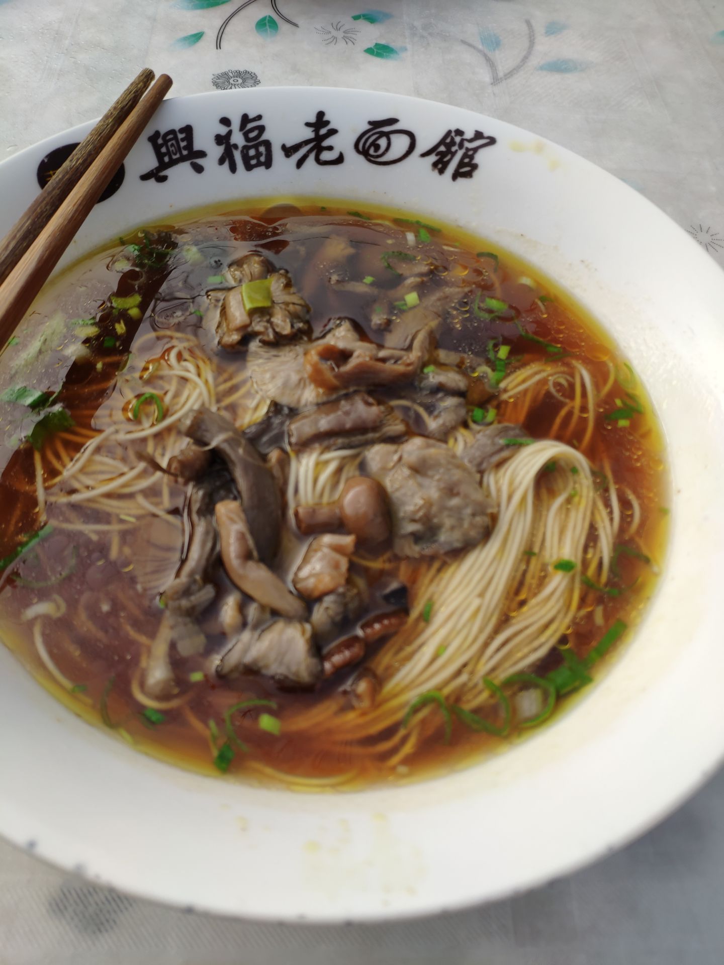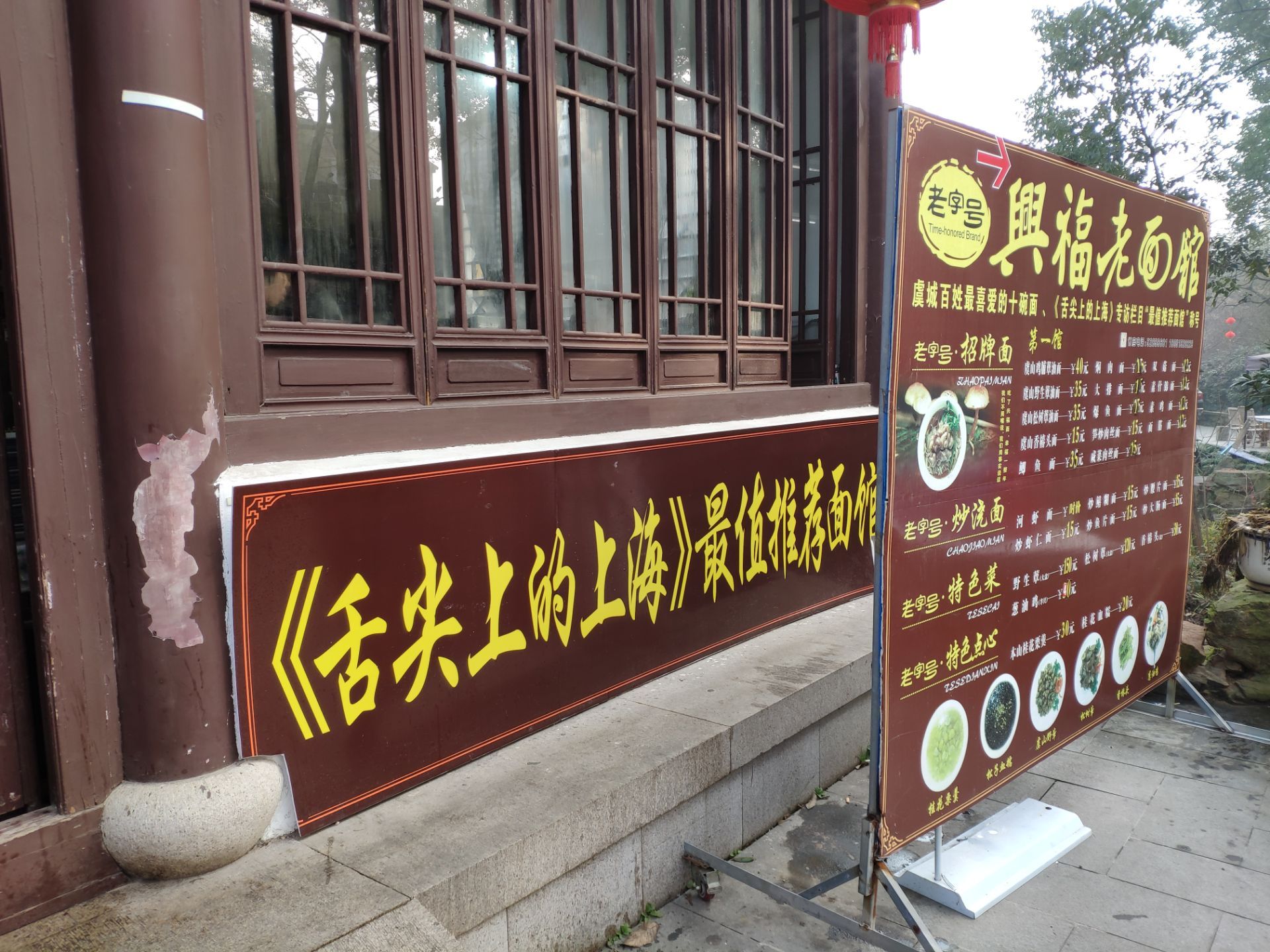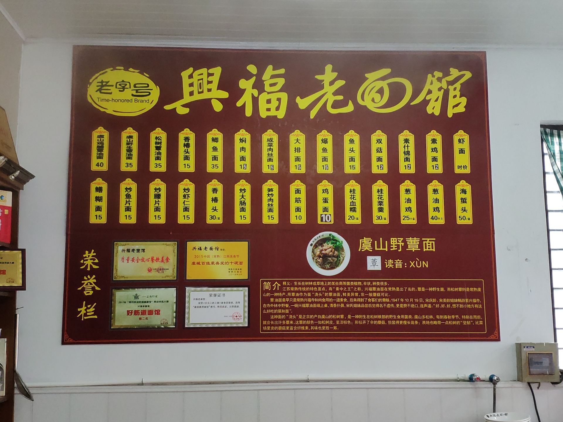 虞山山脚下的面馆 招牌上写着入选舌尖上的上海,什么鬼[呲牙] 除了室内面馆有着一大片露天的座位,貌似与周围其他餐饮店共享的广场,传统的建筑连同周边树木林立的鸟语花香给出很特别的氛围,喜欢! 中国文化博大精深,问了才知道这边的特色是野蕈面,这是只长在虞山上的一种菌菇吧,虽然是贵了些不过当地特色还是可以尝试一下的。