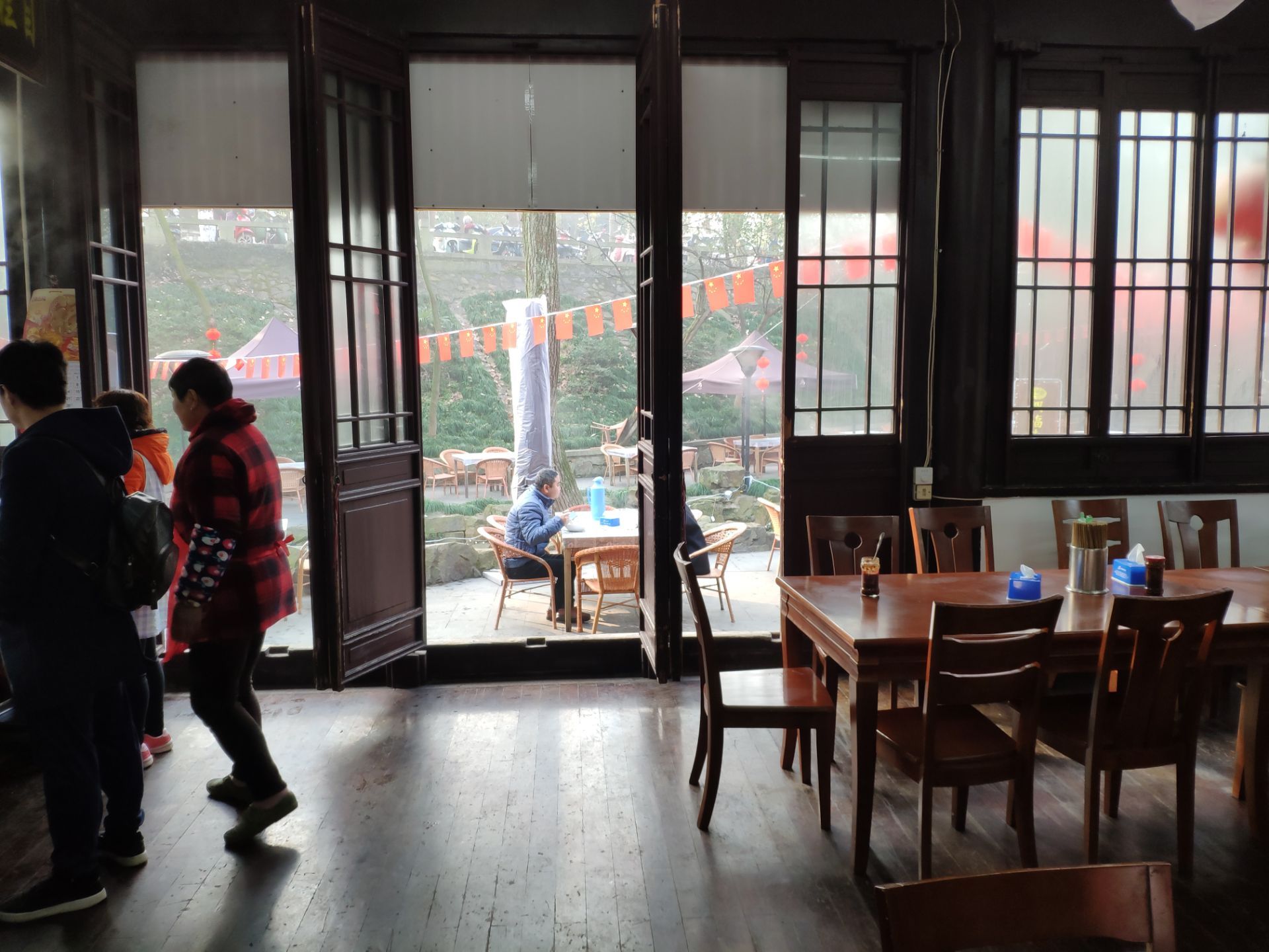 ...位,貌似与周围其他餐饮店共享的广场,传统的建筑连同周边树木林立的鸟语花香给出很特别的氛围,喜欢