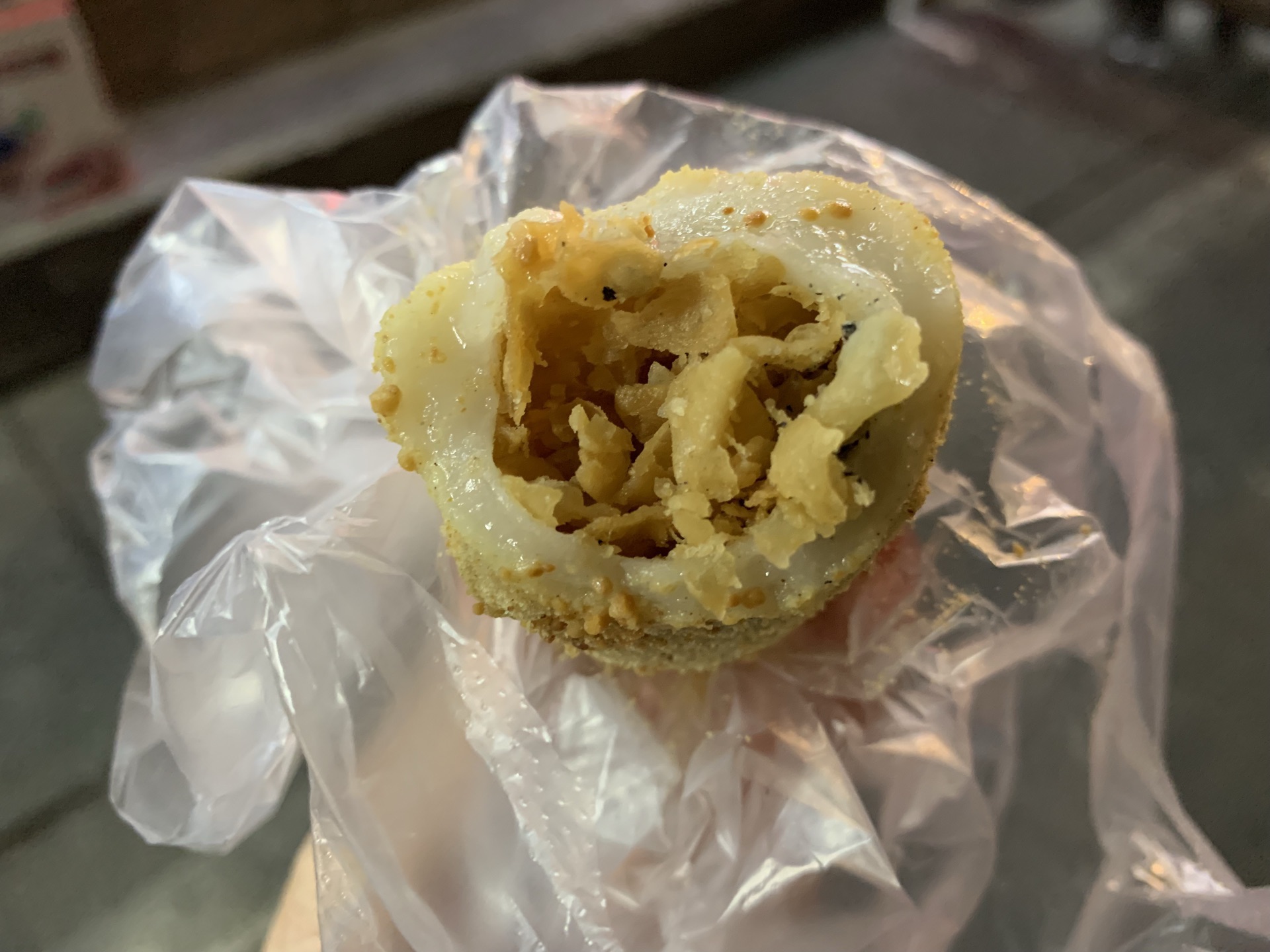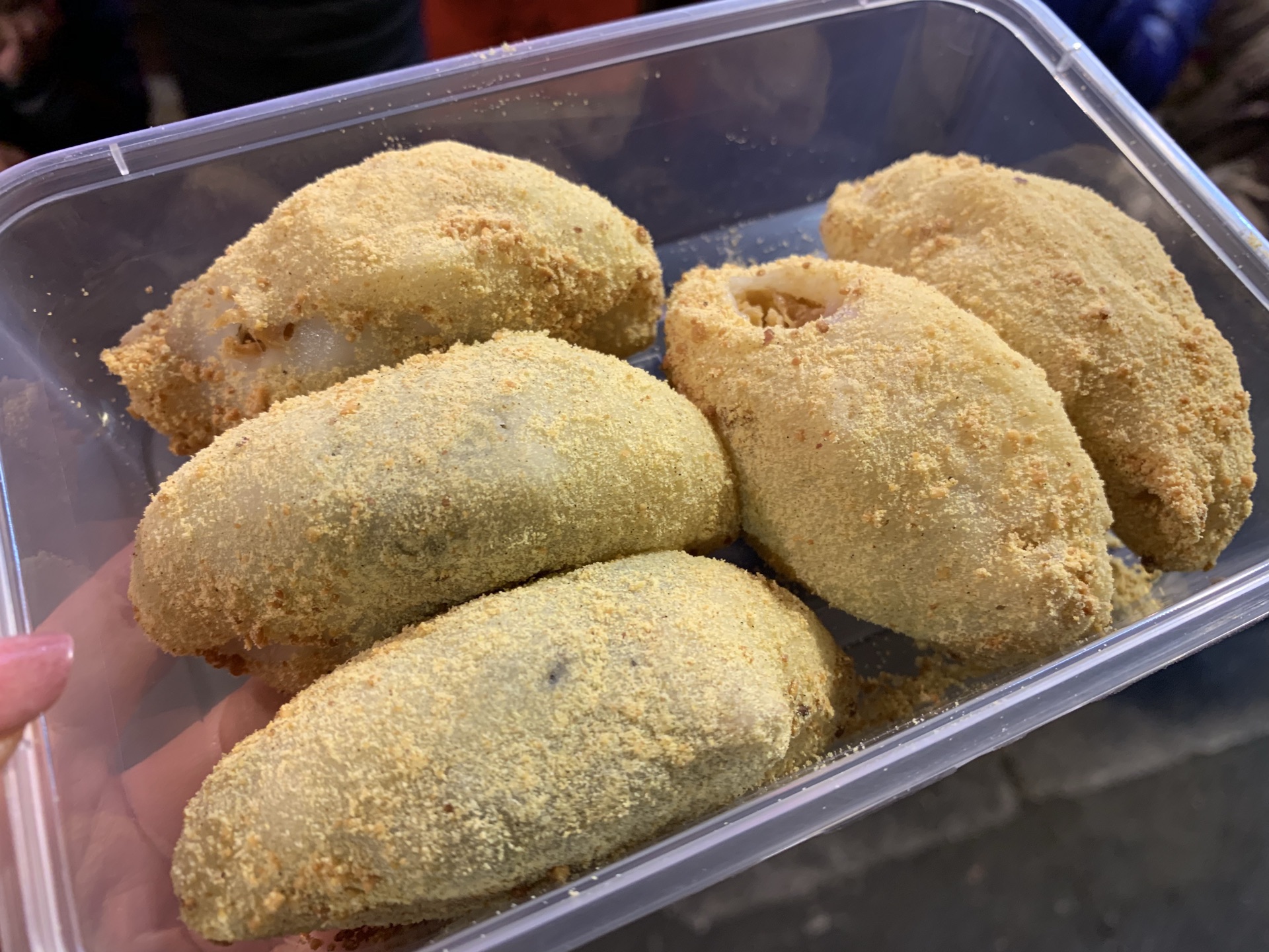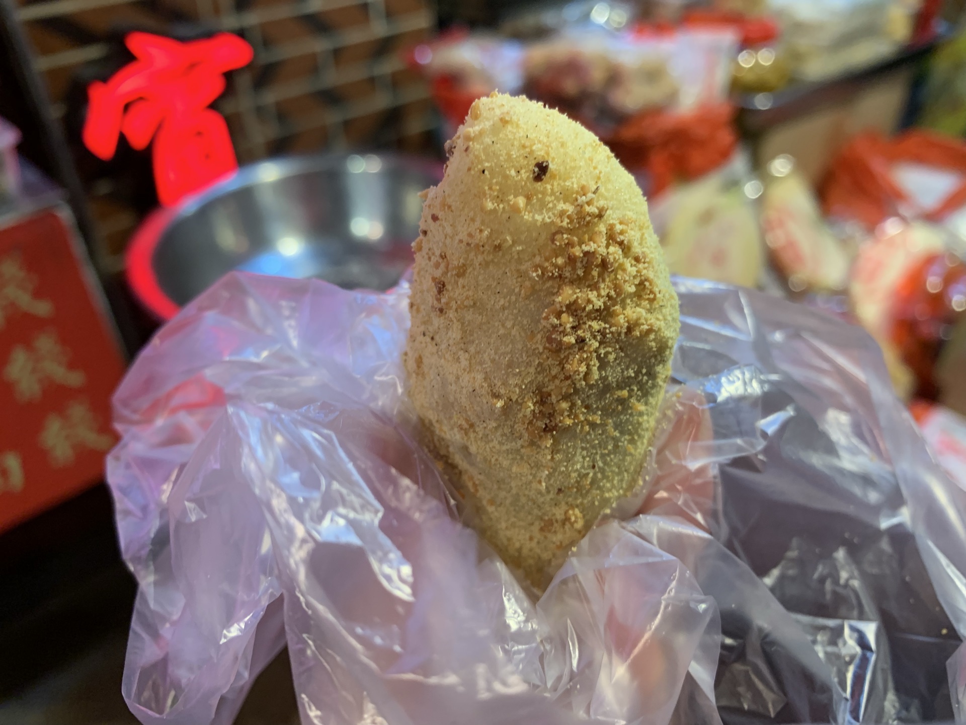 对于糯米星人来说,怎么能错过这么好吃的麻糍! 吴氏手工麻糍,位于泉州最古老的西街上。小小的门面,门口排着长长的队伍。老夫妻一起经营,一个包麻糍,一个帮忙收钱、打包,配合很是默契。 店里只卖三样东西:麻糍、秦粿和无骨凤爪。不过大家几乎都是奔着麻糍来的。 麻糍,2元一个,5个起配盒子。 糯米皮很糯很Q,里面包着芝麻粉和脆饼,外面裹上花生粉,不太甜,很好吃。
