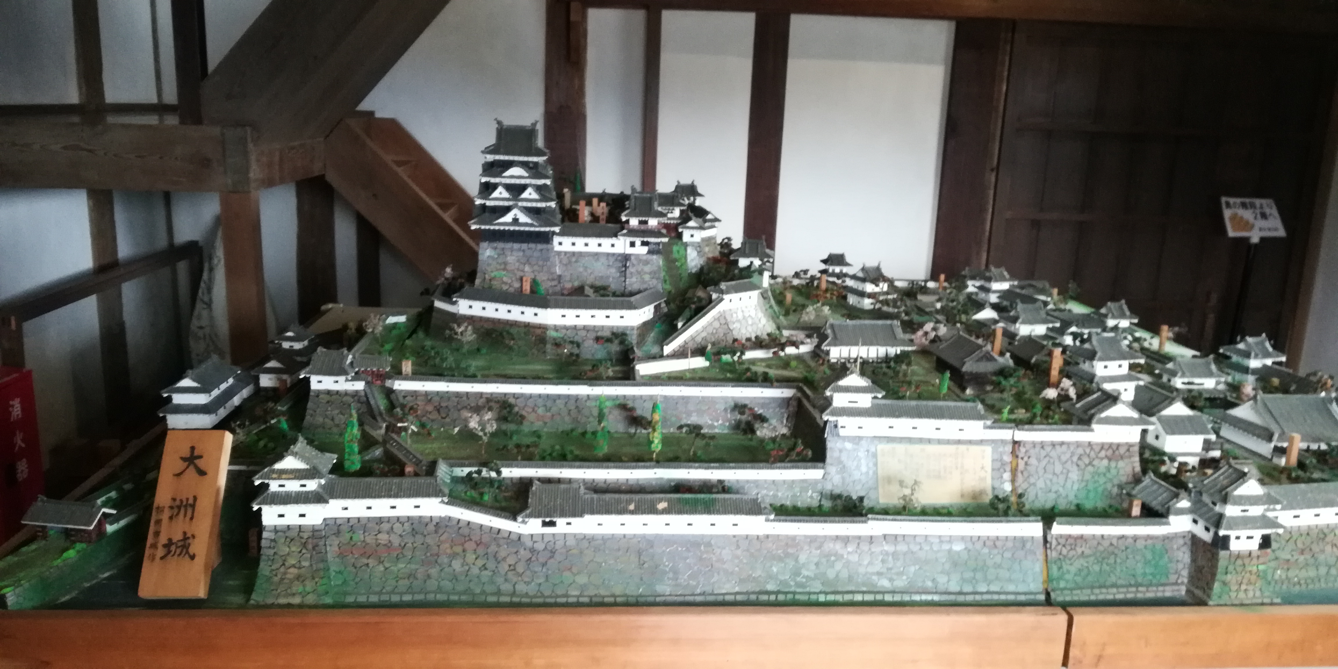 大洲城离JR大洲不远,走走就到了,路上还能看看远景。大洲城是后来复建的,远看还可以,里面不大。有个瞭望楼是老建筑。通票800日元还是不贵的。来看看还是挺不错的,景点工作人员也挺热心的,老远就打招呼了,有中文版介绍宣传册。