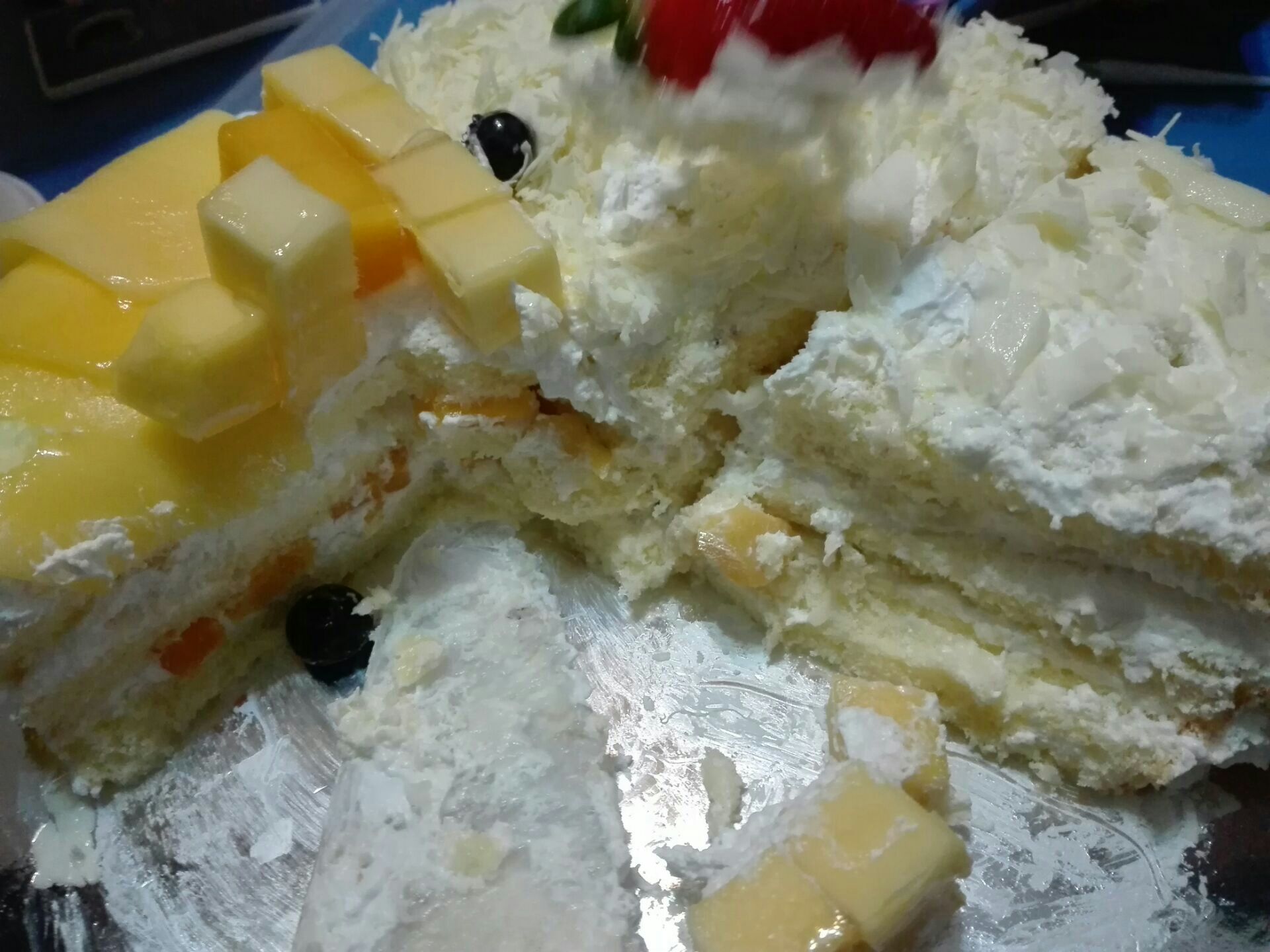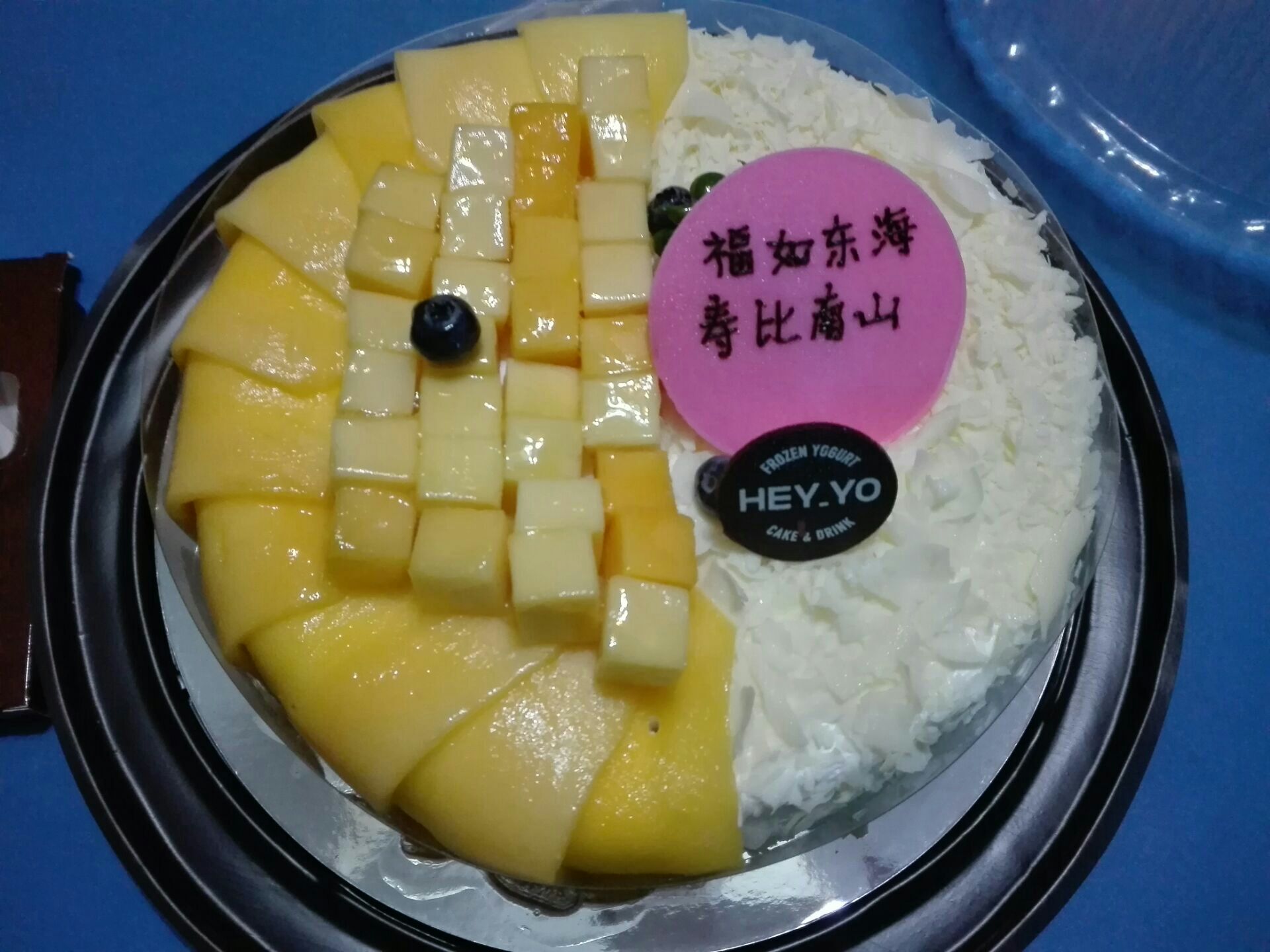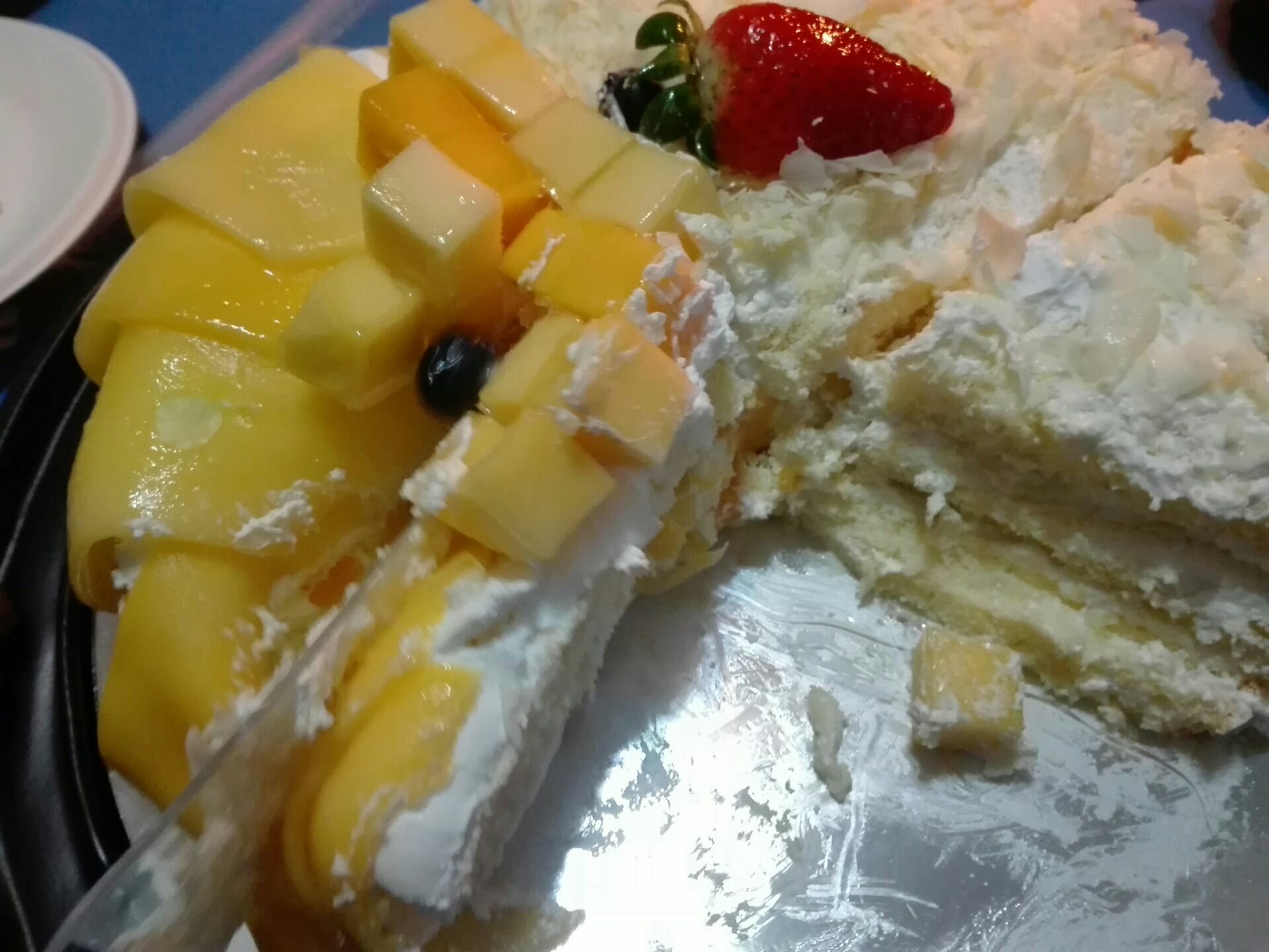 ...”的多一些,所以最终在这里订了一个“榴芒双拼”生日蛋糕,味道不错,真材实料,得到大家的一致好评