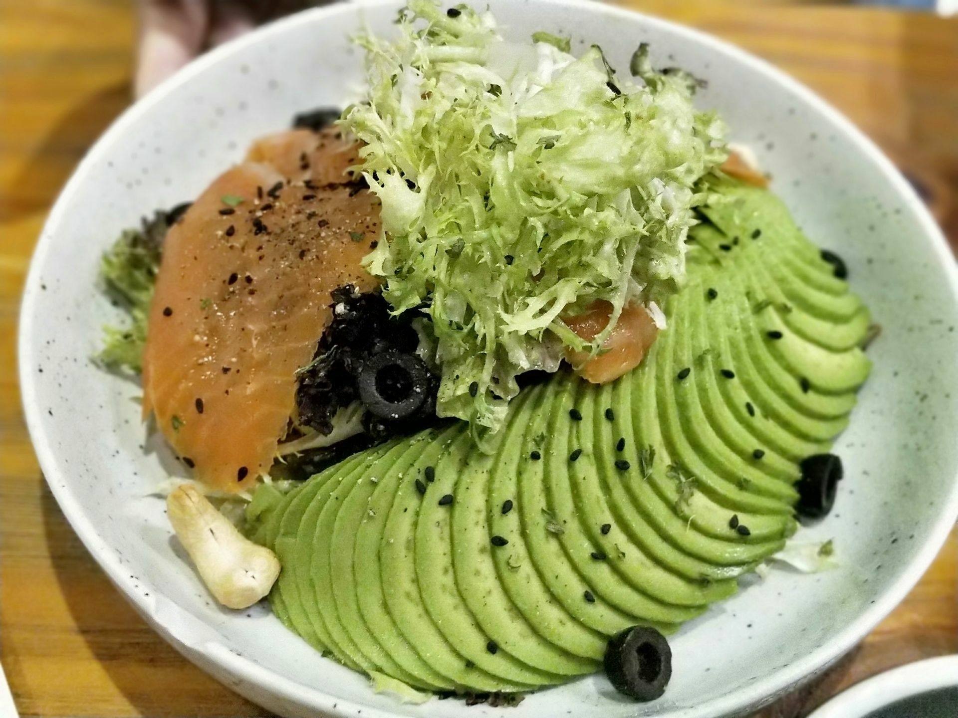 咖啡厅面积不大,装修风格是应该也是属于工艺风吧,简约之中带点小资。 特意点了店里很受好评的牛油果烟熏三文鱼沙拉,摆盘一边是红色的三文鱼片,一边是翠绿的牛油果,红绿相搭颜色鲜艳让人食指大动。沙律一大盘份量足,还有甘蓝、生菜、芹菜、橄榄等。烟熏咸味爽口的三文鱼片,搭配糯粉的牛油果,还有酸甜的菜,味道搭配得很好,名不虚传。 主食选了招牌牛肉酱意大利面,菜单介绍肉酱是用新鲜牛肉熬制,还不错吧。 华夫饼是店里的招牌糕点,我点了草莓忌廉的。每块饼单看有点像圣诞节堆的雪人,8块围成一圈又像是几位小人在盛装起舞,很漂亮。 饮品点了不含咖啡的抹茶拿铁,在绿色的抹茶上拉出树叶的花纹,真的很漂亮,味道不算太甜淡淡的带点茶的苦涩。