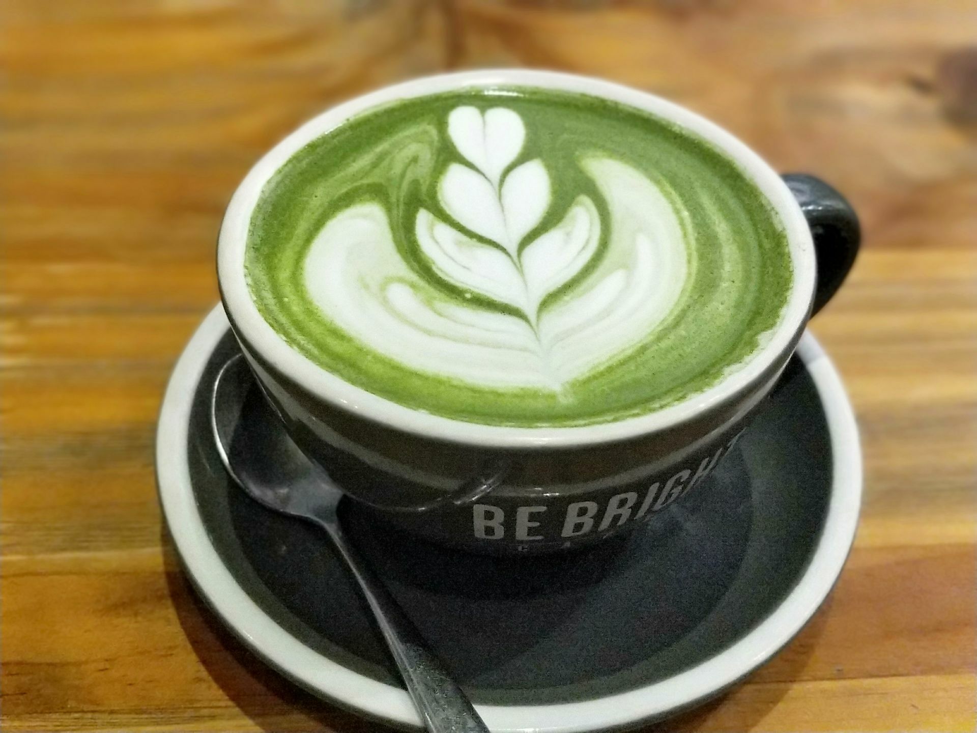...了不含咖啡的抹茶拿铁,在绿色的抹茶上拉出树叶的花纹,真的很漂亮,味道不算太甜淡淡的带点茶的苦涩