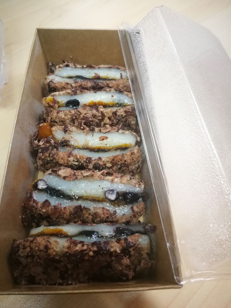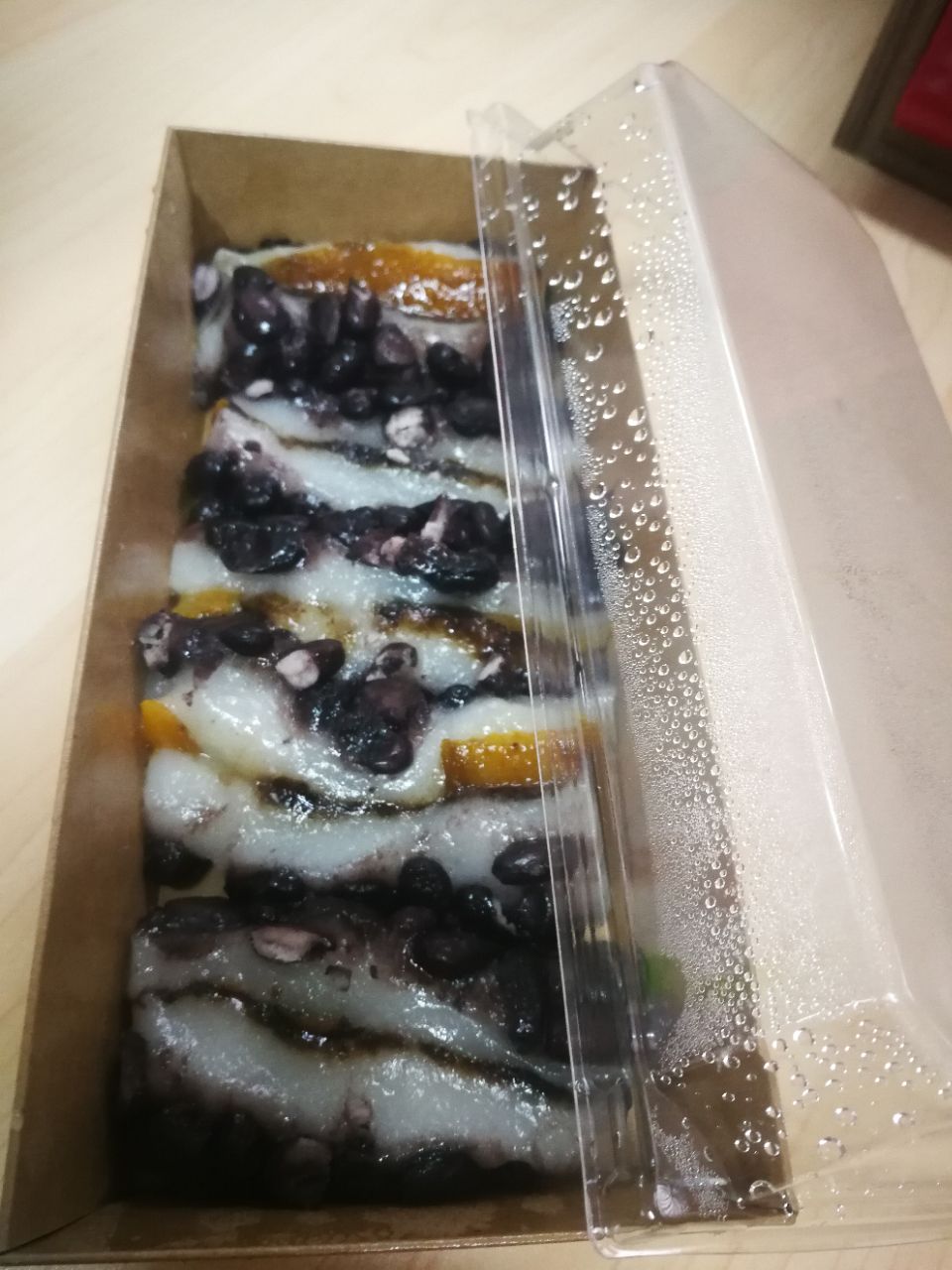 糕一到手就乘热吃了二块,糕切成薄薄的,一盒有六块左右,很软糯,微微甜的口感,挺好吃的