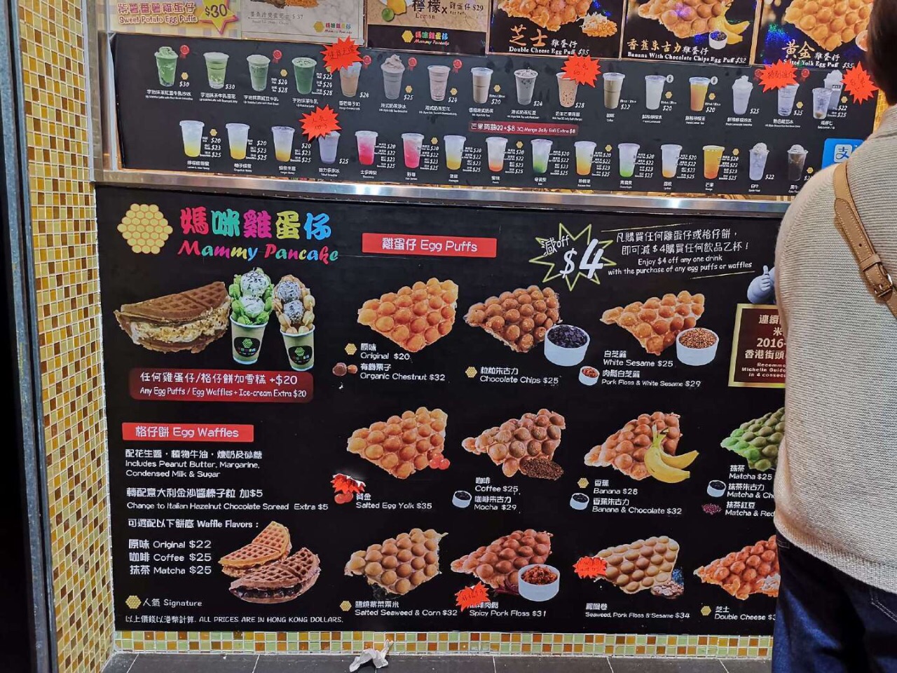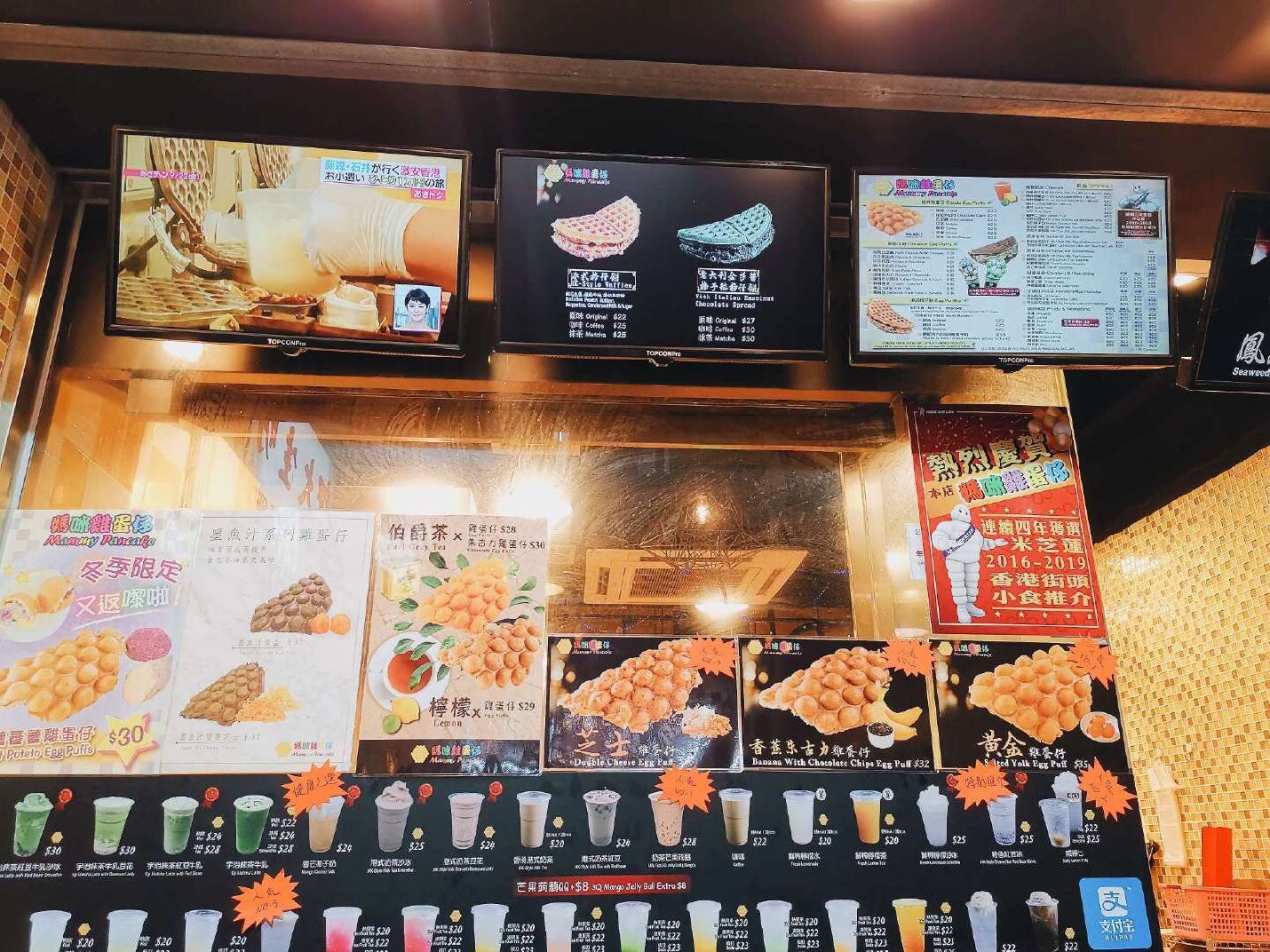 妈咪鸡蛋仔-佐敦店 据说是连续四年登上米其林小食推荐榜 闭着眼睛就点了「人气No.1」和「一试难忘」的「黄金鸡蛋仔」 芝士 绿茶红豆 抹茶 粒粒朱古力 紫薯 有机栗子 肉松芝麻 樱花紫菜…突然觉得黄金鸡蛋仔输了 和以前吃的鸡蛋仔偏软不同它的口感更硬更酥脆些 掰开就是咔吱咔吱脆 咬开能看到实在的咸蛋黄 原料加了薯粉口感是糯的 就算凉了也能波波脆