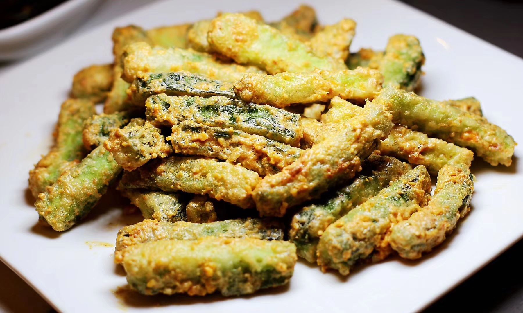 咸蛋黄炒凉瓜这个菜很有意思,软的苦瓜外面挂一层咸蛋黄,口感和香味都有