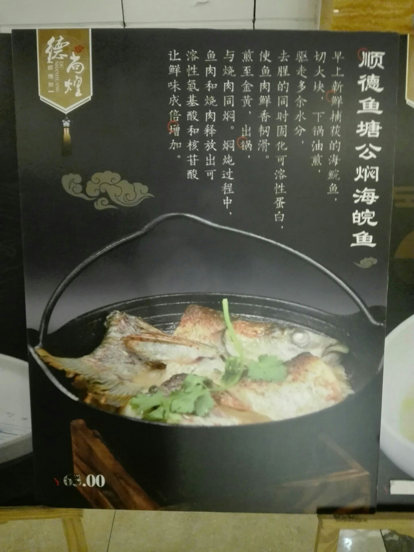 店家在赤岗“四季天地”首层,位置比较偏里面,如果不是有推荐很难找到这里来吃饭。店铺装修还是不错的,古香古色,就是感觉空间不够大,人员穿梭走动很容易就碰到。 店里菜式以“顺德菜”为主,一进门就有“顺德味道”的招牌,在我的印象中顺德菜一般以吃鱼为主,这里也不例外,门口竖着招牌介绍的菜式系“|顺德鱼塘公焖海鲩鱼^”,还有“|盐炊连山土鸡^”,霸王餐也是一道“|大锅生焖瘦身鲩^”和一煲“|沙姜焗鸡^”,此外还有一份顺德著名小吃“|大良炸牛奶^”。坐下后,服务员手脚麻利地摆设好炉具,接着端上一大锅鲜汤浸鲩鱼,点火开焖!说是瘦身鲩,但一大条足有三四斤,够三四个人吃了!汤里有番茄、白贝、鲜虾,焖出好味道,非常鲜美!略有不足的是鲩鱼比较多刺,吃得不够畅快。另一道菜“|沙姜焗鸡^”就非常赞!沙姜铺底,再放上鸡块、芹菜,盖上锅盖计时焗7分钟,当时钟响起,揭开锅盖,一股浓香扑鼻而来,正啊!鸡肉鲜嫩,味道浓郁,好一煲“|沙姜焗鸡^”!“|大良炸牛奶^”系著名的顺德美食,这里出品也是不错。总体觉得这里的出品不错,可以吃到比较正宗的顺德美食,以后有机会可以再来~
