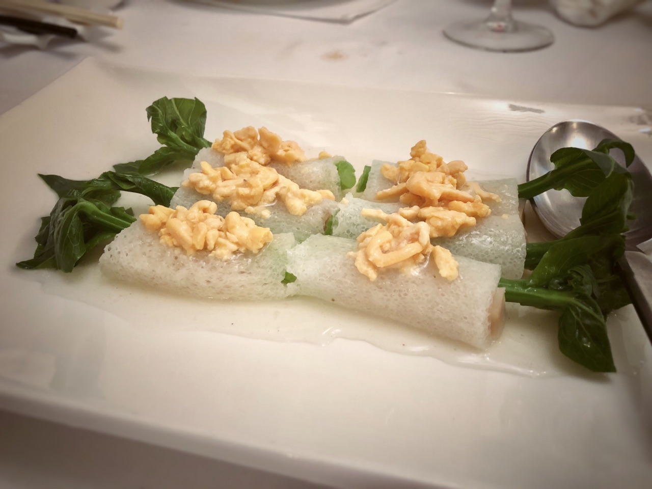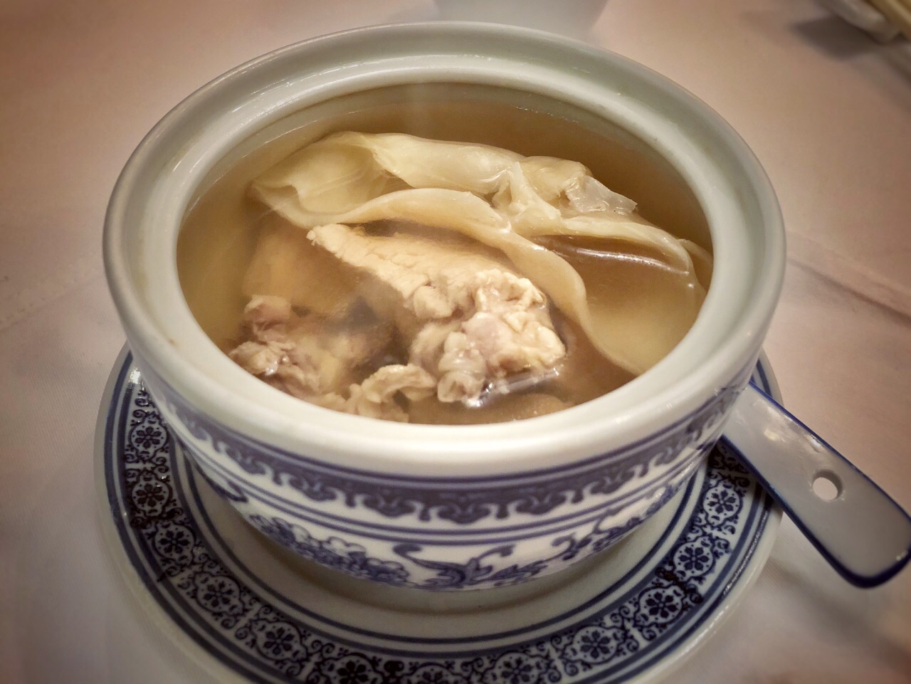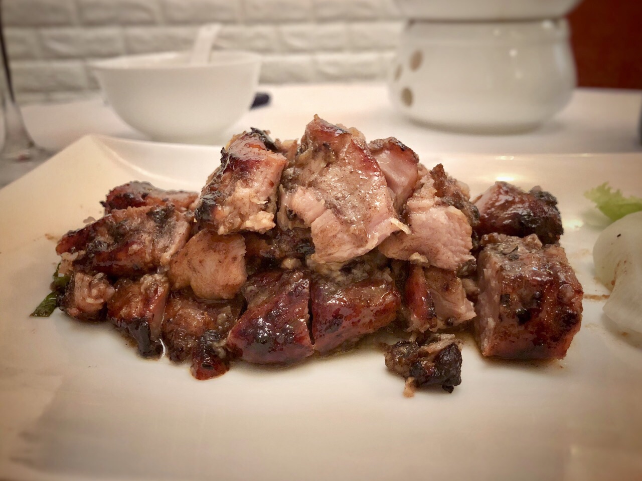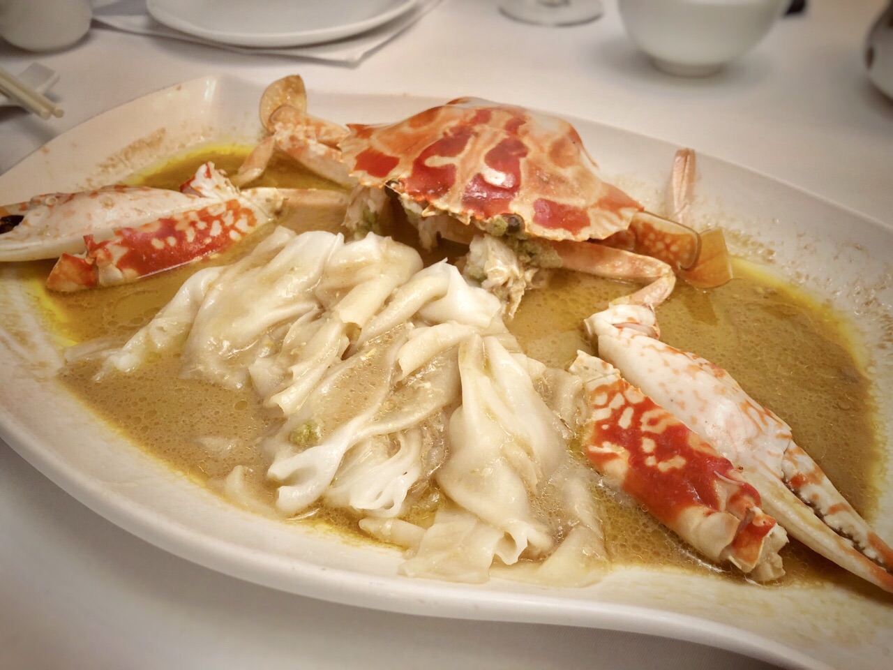 上次跟朋友吃完天一阁一直念念不忘,一道羊腩煲让人流连忘返。这次春节期间知道长辈爱吃羊肉,特地定了天一阁。提前预定了羊腩煲和花雕蟹陈村粉两道菜。 当晚第一道菜是西班牙黑毛猪叉烧,味道特别好,一口咬下去非常juicy,有着不让人反感的幸福的油腻感,搭配清口的萝卜片,非常满足。其实我不是一个叉烧爱好者,天一阁的叉烧却可以吃好几块,实属不易。 花胶螺头炖鸡,味道非常鲜,不过花胶和螺头的质量很普通。花胶非常薄,质感不软糯;螺头也是小小一片。 绍兴花雕蟹配陈村粉,这道非常喜欢,花雕的味道极其浓郁,沉入蟹肉的一丝一毫。陈村粉捞汤汁,可以吃下好多。 椒香焗大虎虾,花椒加辣椒焗的虾,香气十足,我连虾头都唆的干干净净。 济公羊腩,药膳煲的羊腩,搭配香菇和山药,羊肉味道十足,但是完全不膻。汤汁味道浓郁不咸只鲜,羊肉煲的软嫩,口感极好。热气腾腾的吃完羊肉后,再加些蔬菜入锅,蔬菜浸在羊肉煲汤汁里面,美味极了。搭配的香菇、山药、栗子也好吃。同行的朋友说,别的菜都不用上了,给自己来这么一份羊腩煲加米饭就足够了!只是这道一上来就赶紧抢着吃,忘记照相了。 接下来是姜汁炒芥兰,味道中规中矩。 第二道蔬菜是竹笙时蔬卷,又是芥兰,跟上一道菜重复了。上次因为肉菜太多,这次特地嘱咐少一道肉菜多一道蔬菜,但是两道蔬菜食材一样,感觉有点应付。 主食是虾子虾油葱油捞面,这道没什么配料,但是葱油和虾油的味道非常浓郁。其实吃到这里已经很饱了,但是还是不由自主地吃了两碗。 椰汁枣蓉糕,我很喜欢的一道甜品,上次吃得极饱后对这道甜品赞不绝口,今天也是一样。 花雕红枣饮,去花雕蟹的寒气。 整体分量非常足,两次来吃都感觉很撑,扶着墙出门。味道方面,整体发挥稳定,叉烧、花雕蟹、羊腩煲一直让人记忆犹新;食材方面略显普通,如果只看食材甚至觉得性价比普通。总体还是觉得天一阁挺不错的,日后可能会带爱吃羊肉的朋友再来。