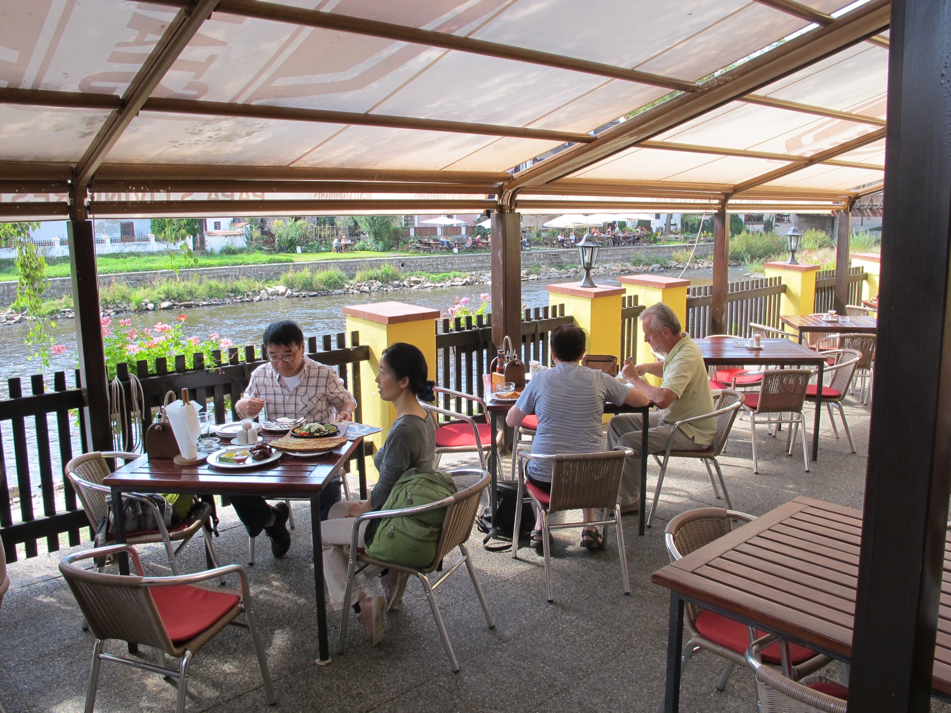 可以说克鲁姆洛夫只要是沿着伏尔塔瓦河边的餐厅景色都不错,但是我们特别喜欢这一家爸爸的店,因为它就在彩绘塔的脚下,靠近Jost教堂,逛完克鲁姆洛夫城堡下来刚刚好就在这家店用餐。最吸引人的是河边的室外的座位,坐在这里凉爽的风,看着河里一艘一艘的小船飘过去,轻松的享受着美食,这种感觉格外的度假。