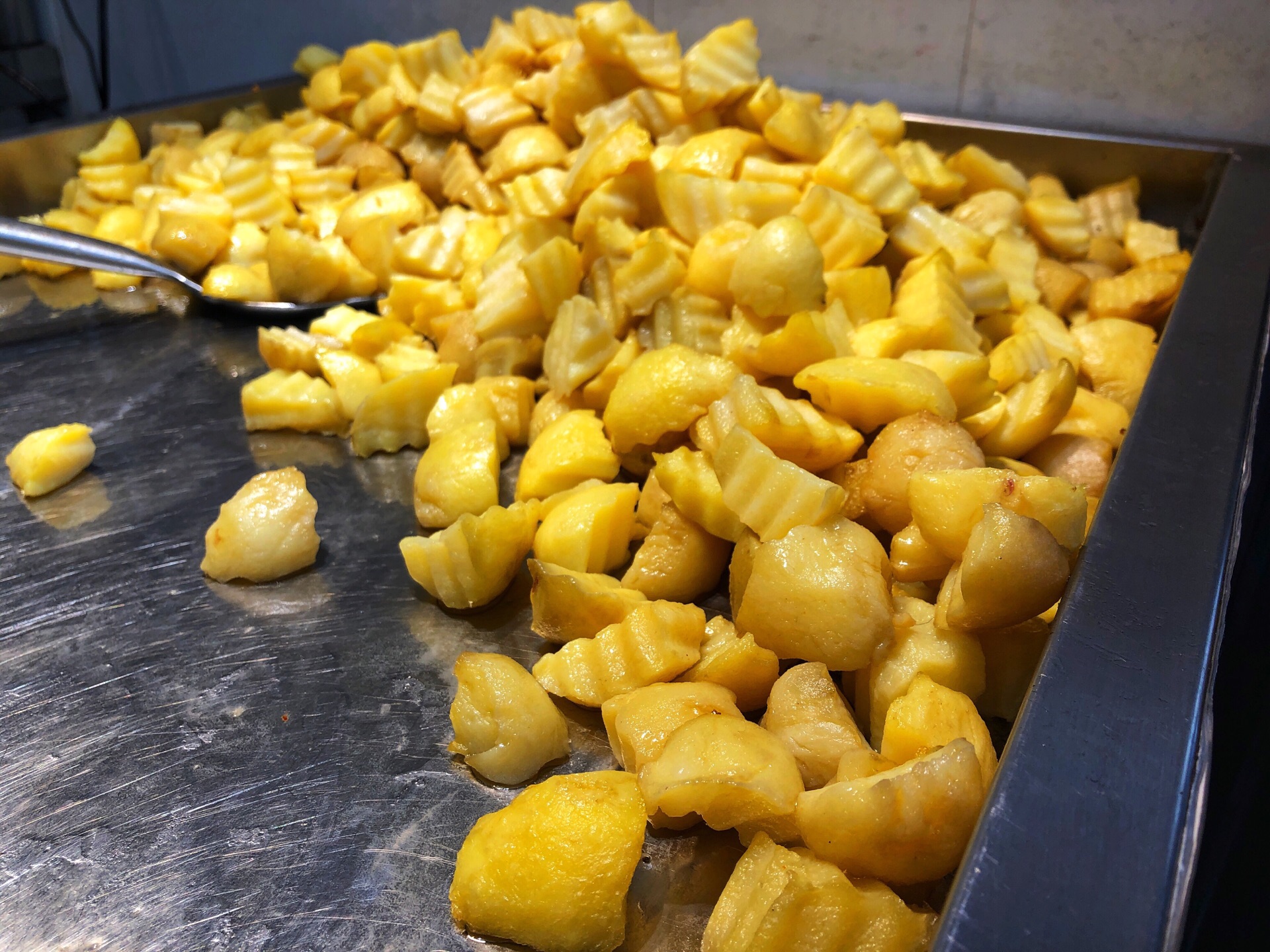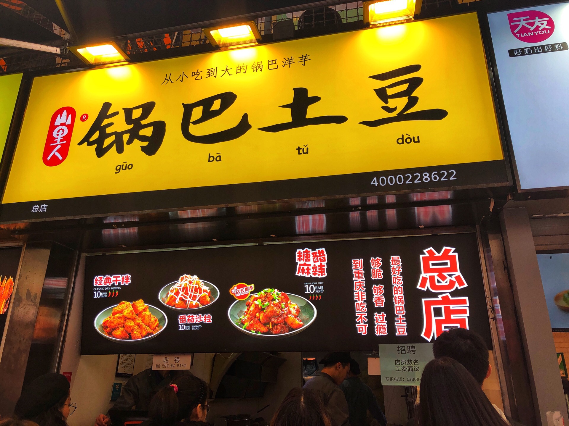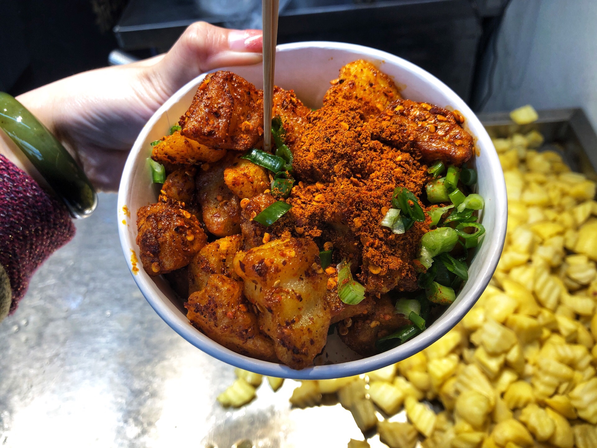 看排队那么多,所以也跟着排了,结果有点失望呢 第一 没有吃到锅巴那种脆脆的口感 第二 土豆太大太厚,不入味,可以再软一点点。 点的干拌,只因为糖醋土豆四个辣椒不敢挑战,极度后悔中。。。撒的辣椒也不算辣,更像是盐[大哭] 吃了几块然后都扔了