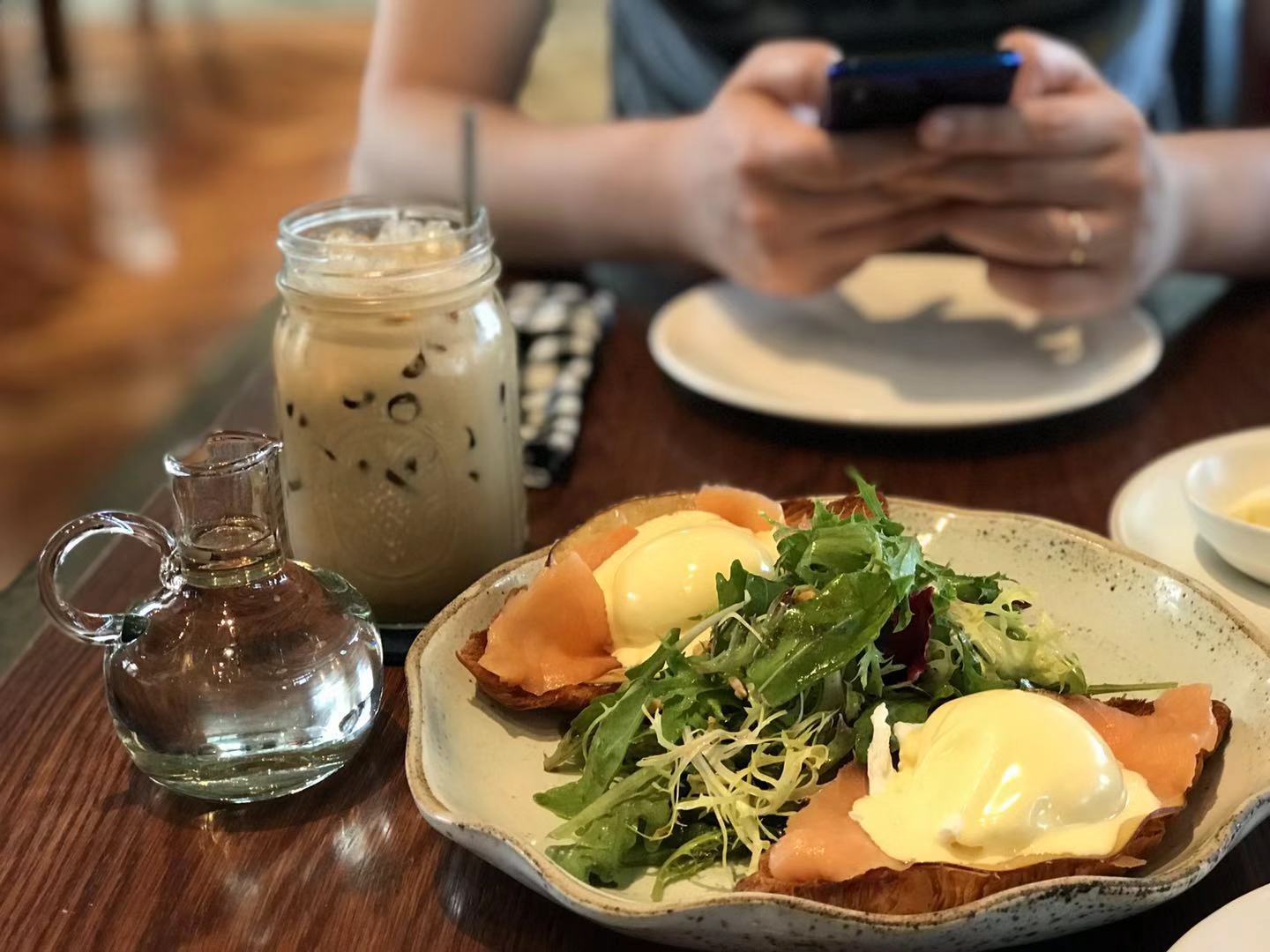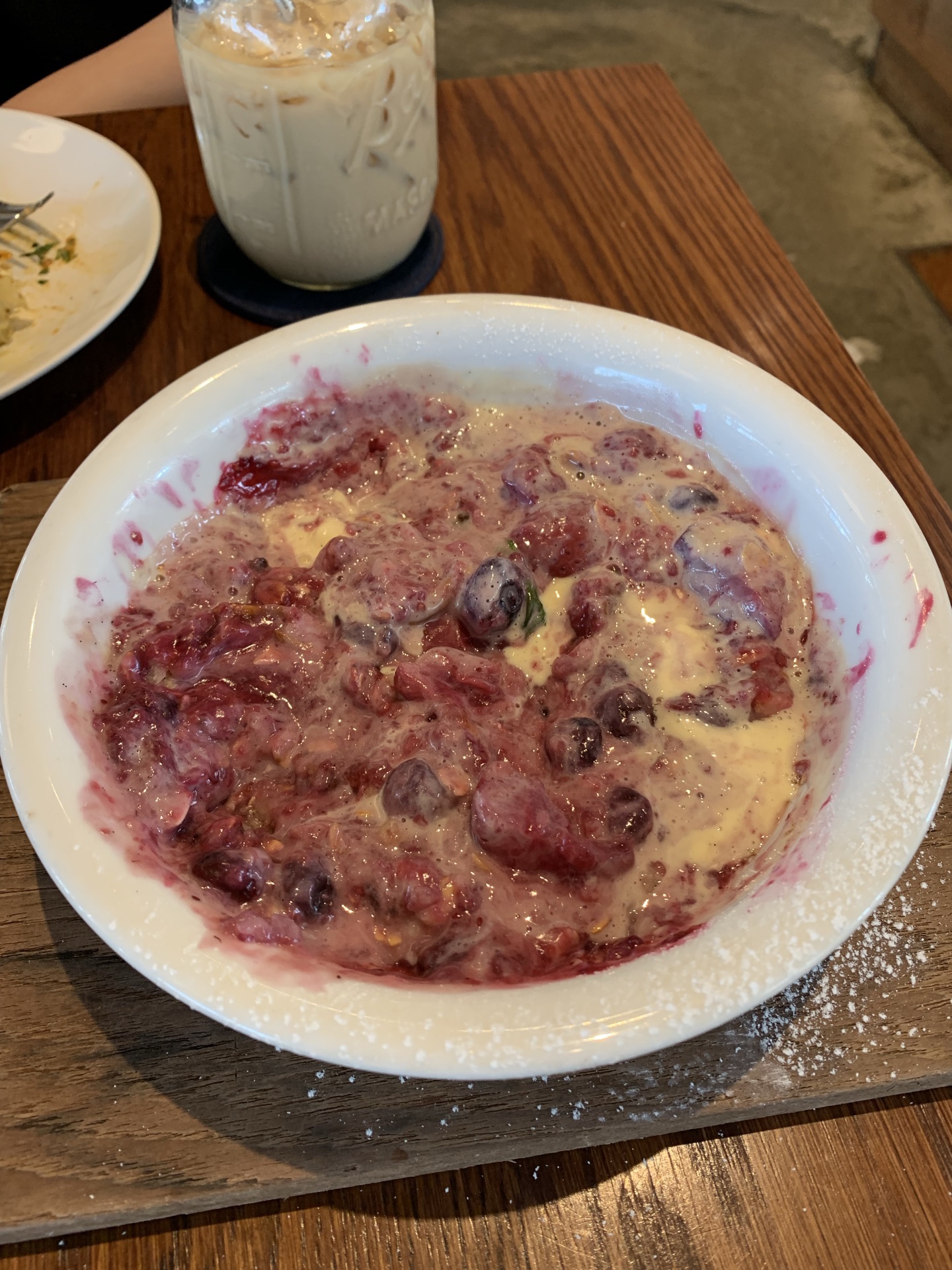 在商场的最顶层,商场挺有特点的。点了个烟熏三文鱼的班乃迪克蛋和一份烤玉米。曼谷这里的甜点都太甜了,就想点一个不那么甜的,点了个看上去一层燕麦上面一个冰激淋球的东西,万万没想到燕麦下面是厚厚的草莓果酱,真崩溃。图是搅和后的结果,破坏前忘了拍了。