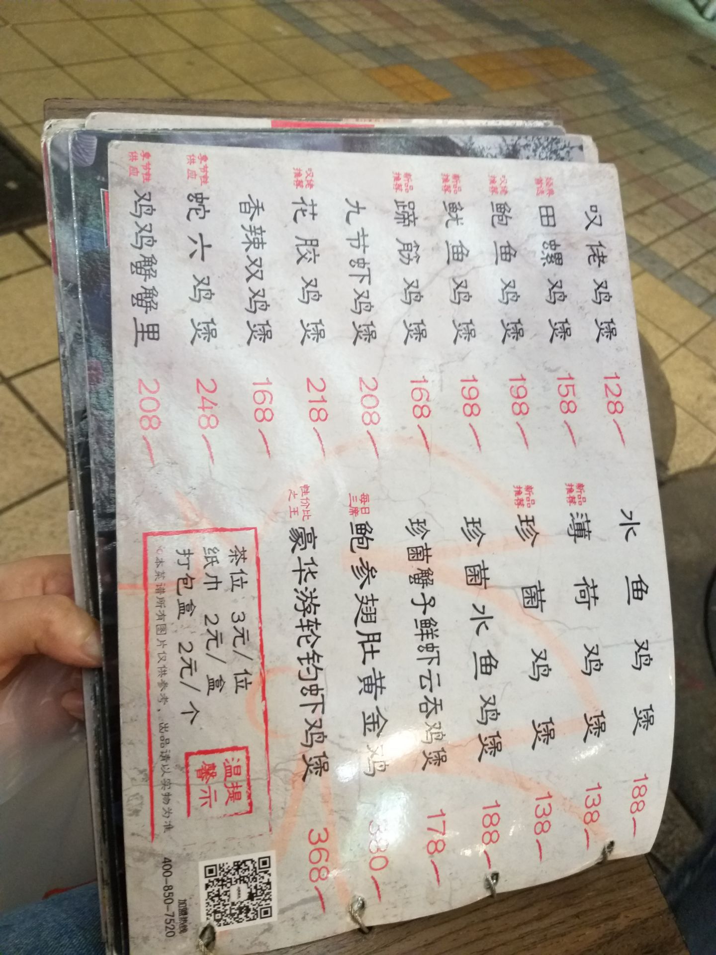 性价比不高。 1.口味偏咸,加了两次汤还是觉得咸,如果平时口味比较清淡的话,建议点清汤类。 2.虽说一只鸡一煲,但是数了数只有一条腿,鸡应该是两条腿的吧。鸡肉还算可以,比较紧实,煮久了也不柴。 3.价格偏贵吧,不论是鸡煲本身还是配菜。