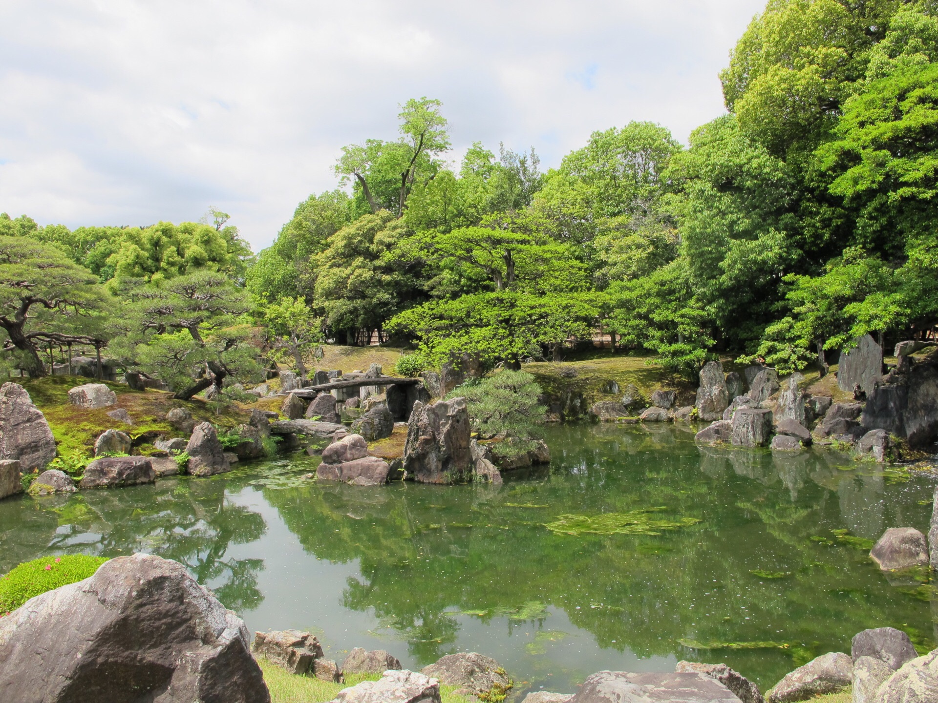 网友2019-03-07二之丸庭院位于二条城内,可以说是城中的一处花园,水池是其重要的一个布景二之丸庭院位于二条城内,可以说是城中的一处花园,水池是其重要的一个布景。水池的周围配有天然的岩石和小瀑布,是典型的池泉回游式庭院。庭院里也有一处天守阁,是二条城的制高点,在上面可以俯瞰整个二条城非常的秀美。