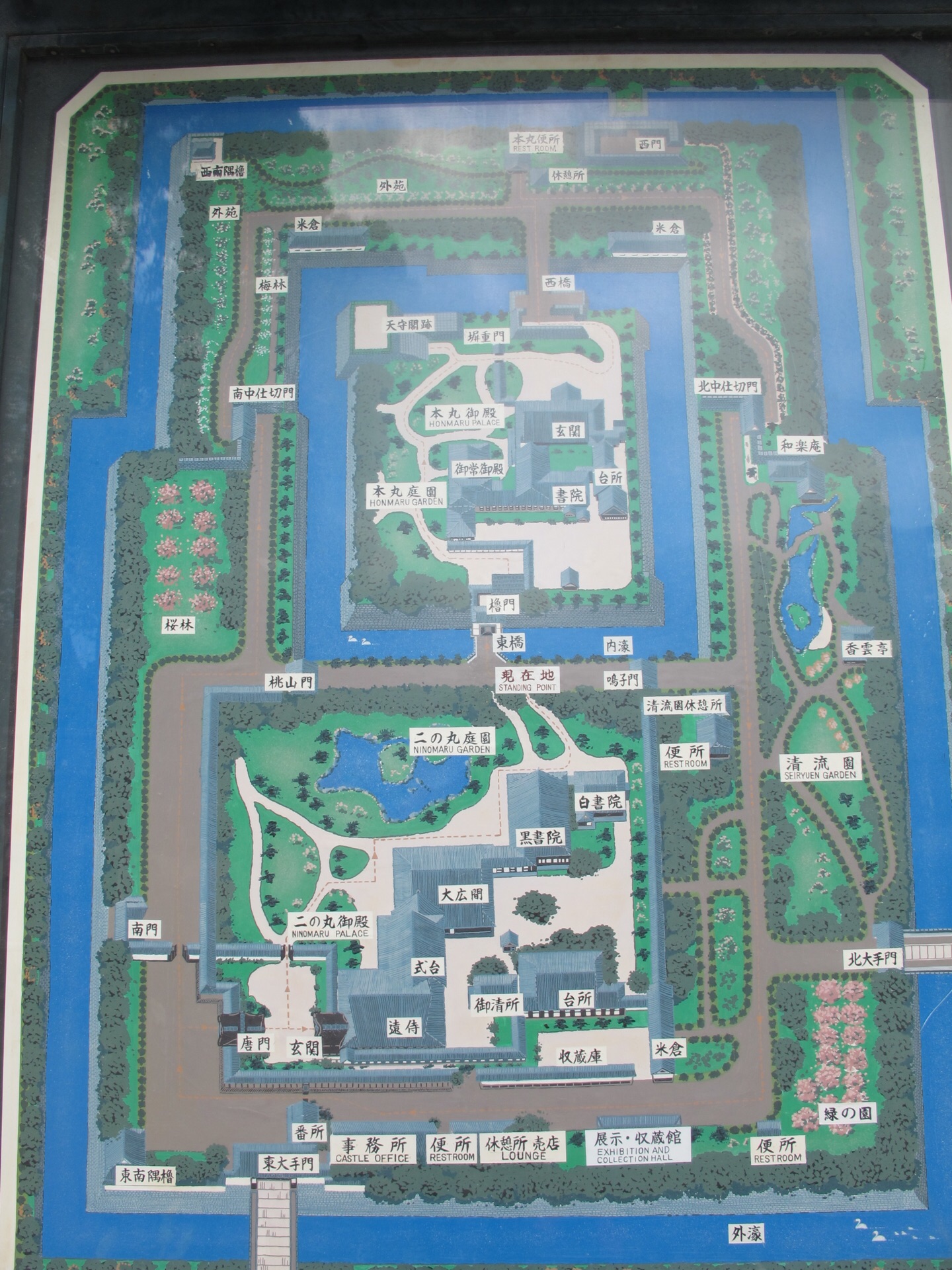 二之丸庭院位于二条城内,可以说是城中的一处花园,水池是其重要的一个布景二之丸庭院位于二条城内,可以说是城中的一处花园,水池是其重要的一个布景。水池的周围配有天然的岩石和小瀑布,是典型的池泉回游式庭院。庭院里也有一处天守阁,是二条城的制高点,在上面可以俯瞰整个二条城非常的秀美。