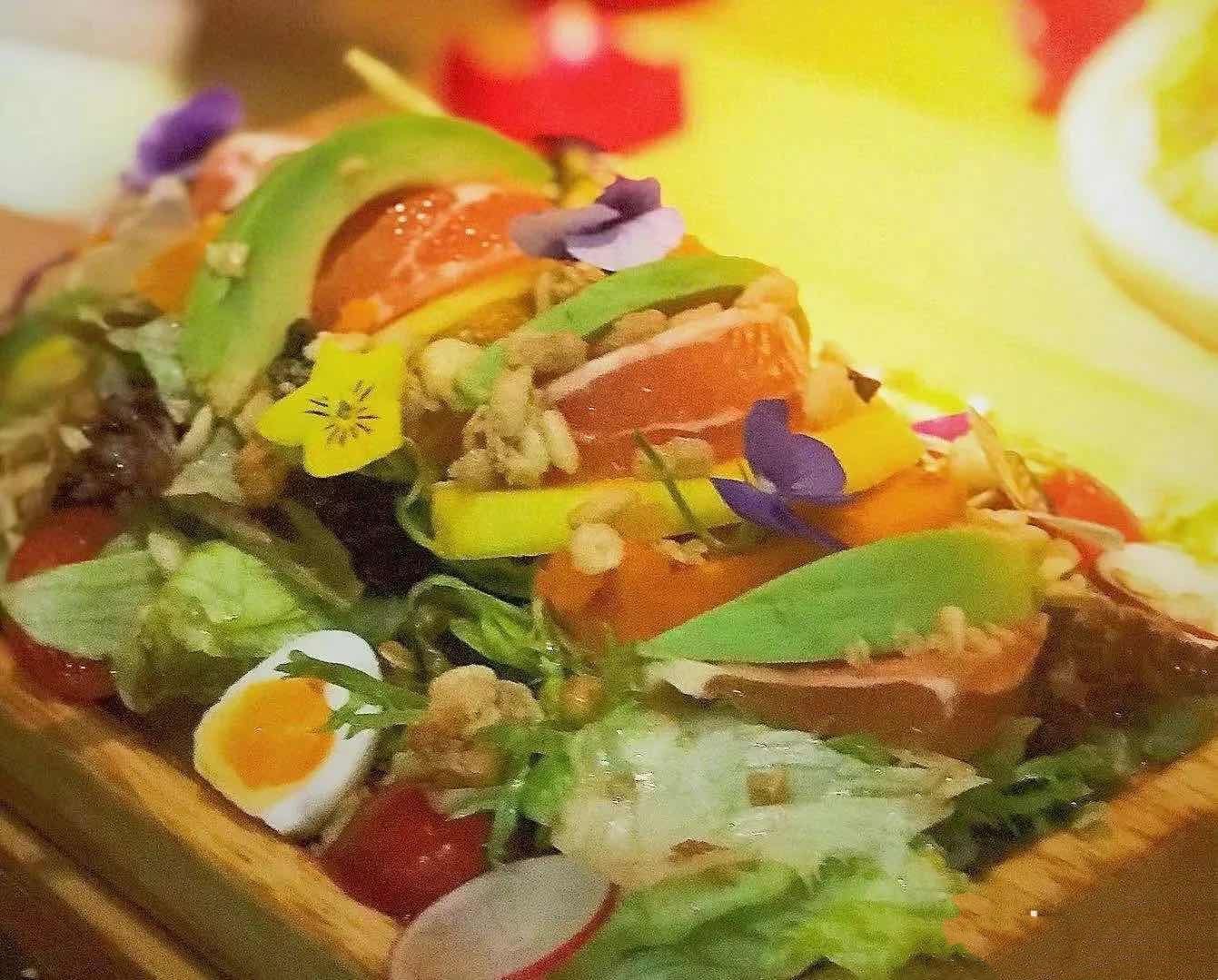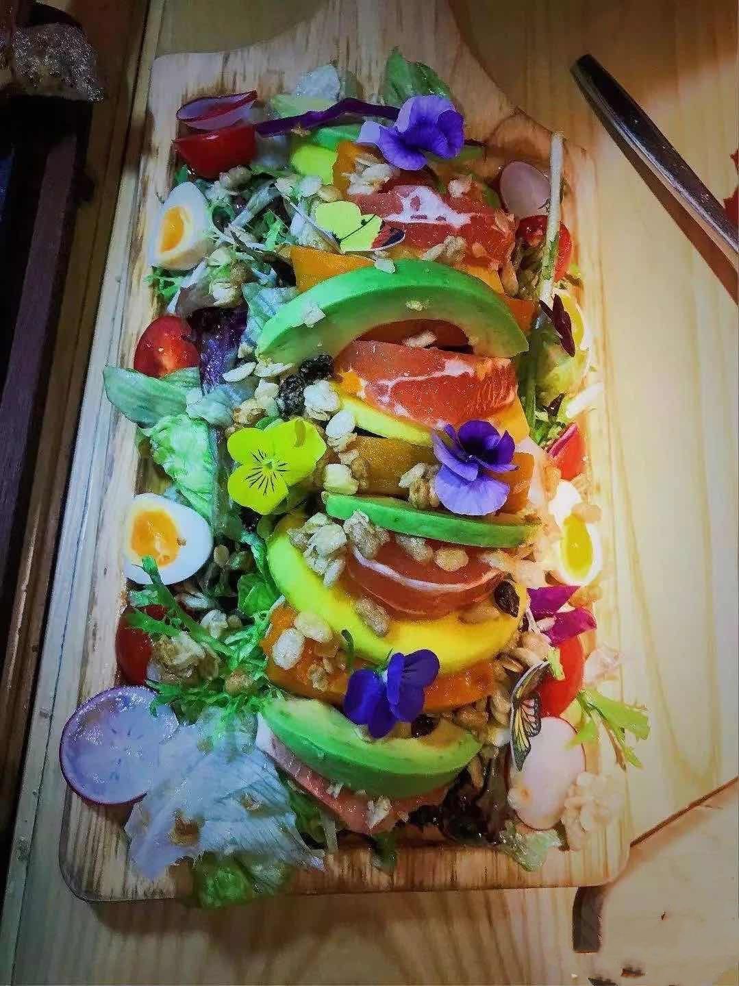 点的客人特别多,试试咯,木盘子盛着大大一盘五彩缤纷的沙拉,南瓜、牛油果、各色蔬菜拌着酸酸甜甜的...