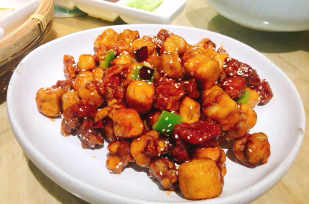 酥式烤肘,有点像烤鸭的吃法,肘子精瘦肉烤制实惠,满满一大盘。 酥茄牛肉粒,茄子切成小方块油炸,牛肉粒香嫩,浇汁可口微甜。 酸汤深海鱼片,口感软糯,鱼没有刺,酸汤微辣刺激。 炸牛奶,外酥里嫩,金黄酥脆,非常好吃。