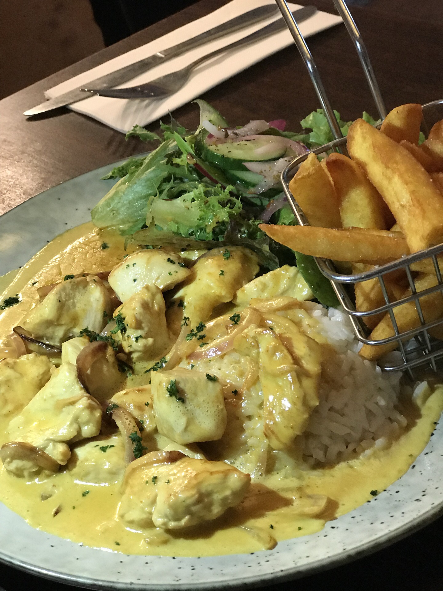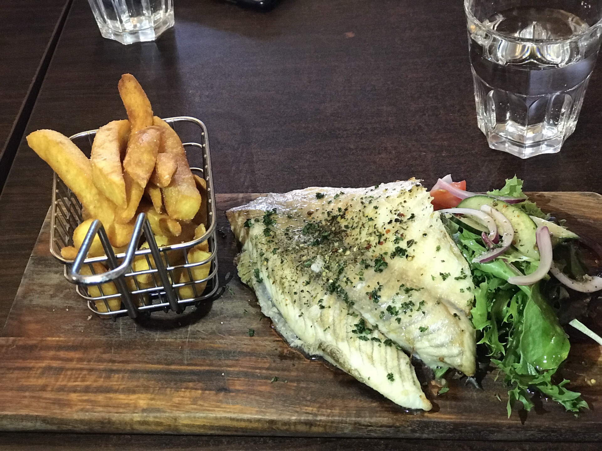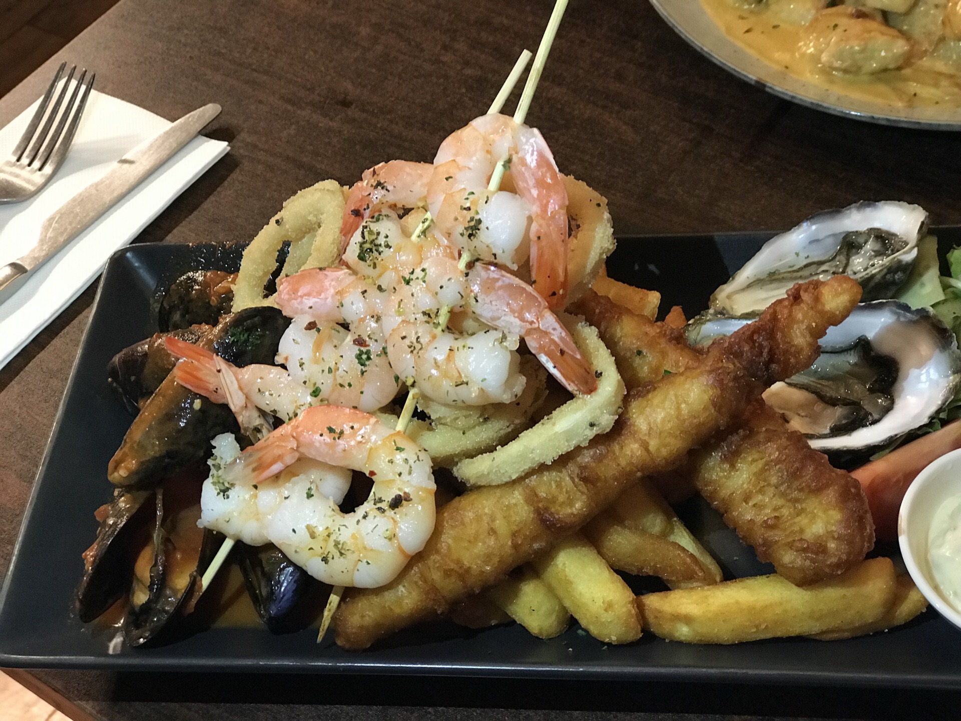 吉朗是小填,安静的小镇,海边散散步吹吹风,木头人排排站,挺有趣,拍拍照凹凹造型可以有,沿着海边开着一溜的店家,略加研究选了这家,澳州的苍蝇有点多就没有选坐外面,殿堂狭长,厨房半敞开式。有中又菜单,招牌混合海鲜拼盘、香烤莽草鱼、鸡肉咖喱饭,海鲜都非常新鲜,Q弹,鱼是当地的鱼不腥好吃。