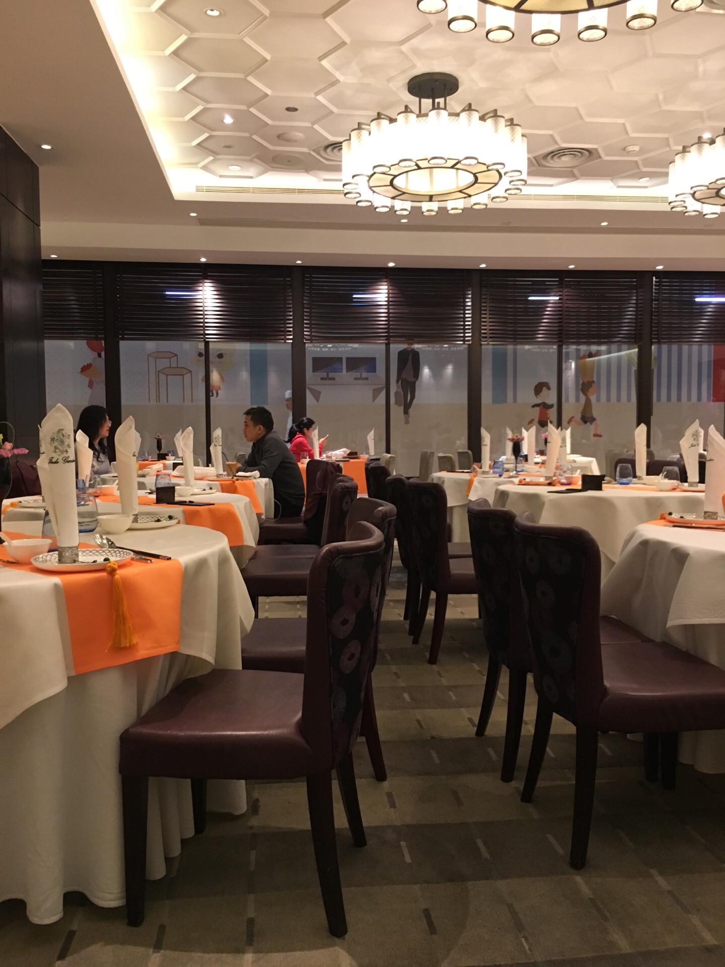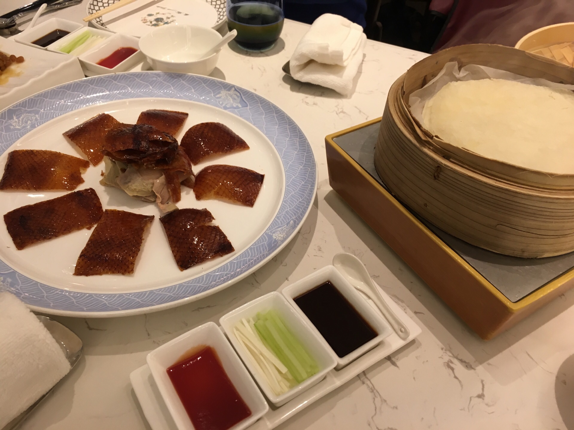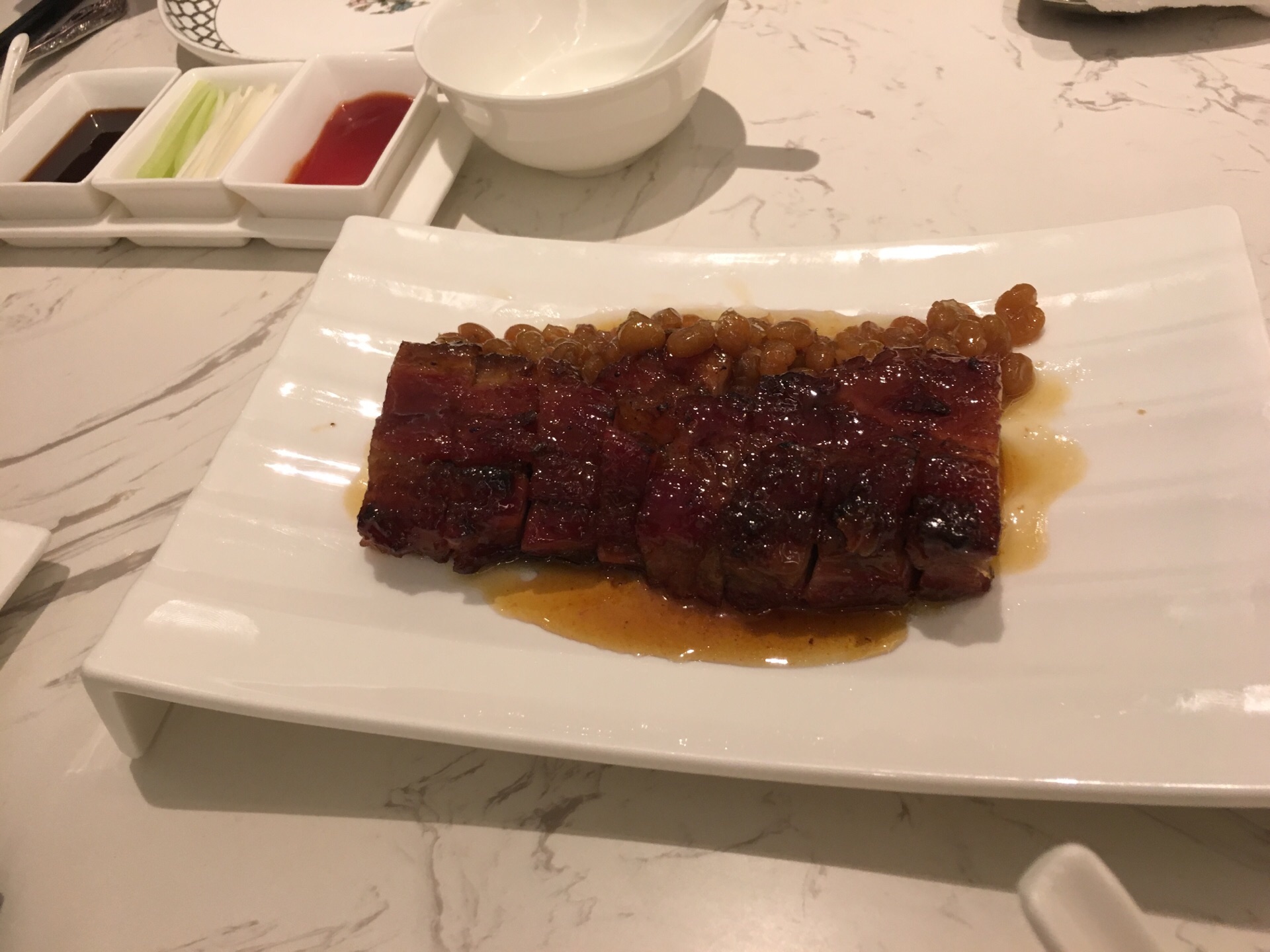 朋友请客来这里,大堂稍微有点挤,还是座在了门口大理石餐桌,点了整个烤鸭,马上上桌了,先让客人看一下然后直接去片,鸭子烤的鼓鼓的,皮脆肉嫩,包饼吃真不错,片了16片,正好饼也是16张,感觉一整个鸭子就16片太少了,又让服务员把鸭肉也片了些吃;西班牙黑豚叉烧,很嫩;避风塘虾脆脆香香的;例汤就比较一般了,一味的菜色;拿破仑可真是巨无霸啊,好大个,说不上好吃难吃,不过价格也不便宜;服务是相当不错的,不停地添茶换盘、换毛巾的,只是这里的价格也是有些贵啊,最普通的炒蔬菜起码60元左右,还要加上10[%]的服务费,性价比不高。