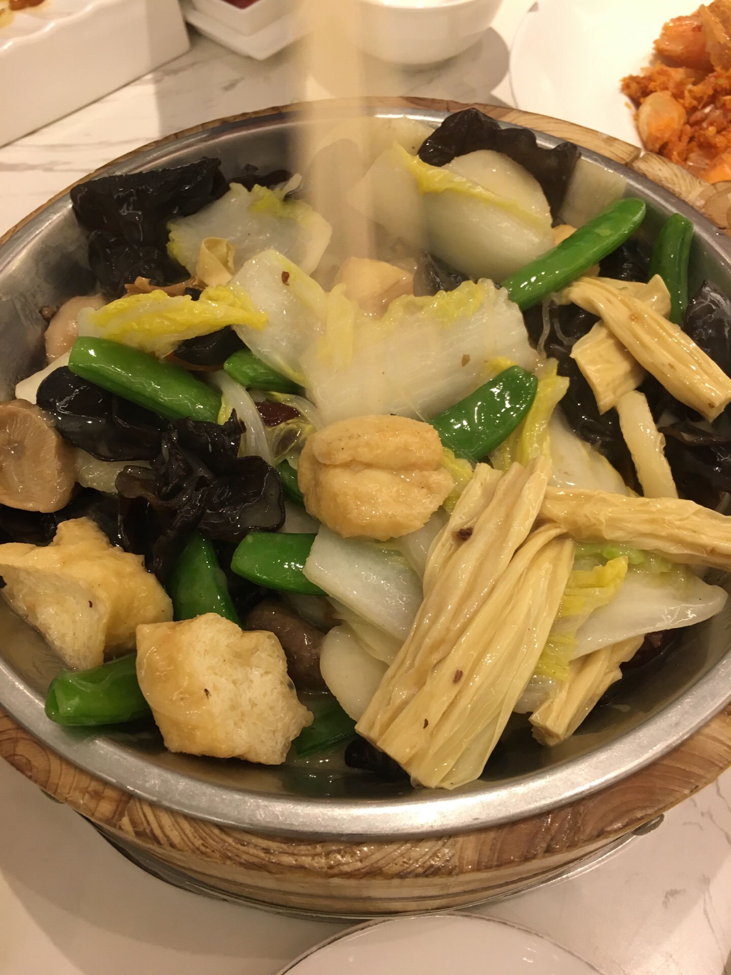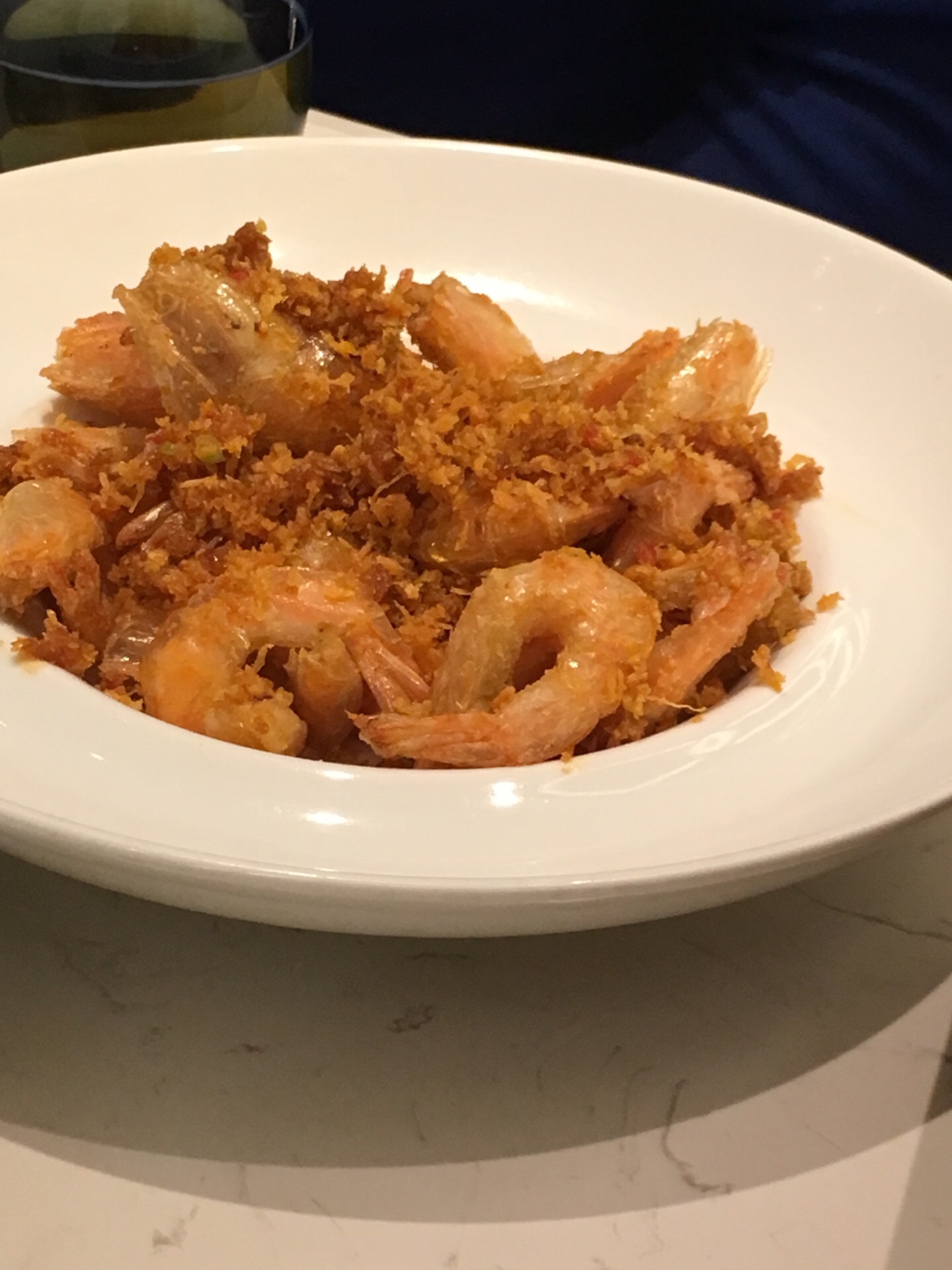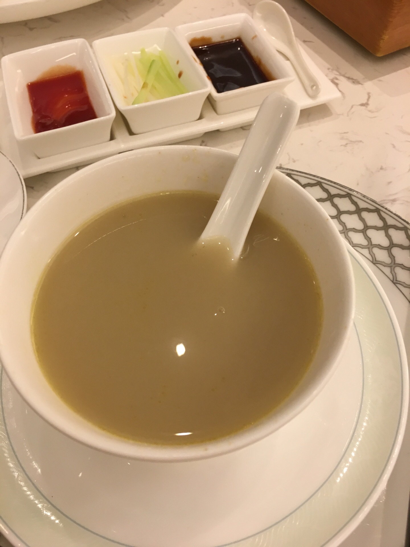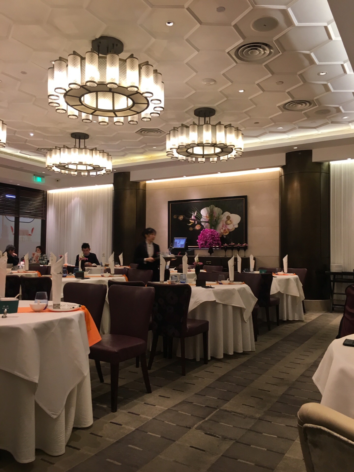 朋友请客来这里,大堂稍微有点挤,还是座在了门口大理石餐桌,点了整个烤鸭,马上上桌了,先让客人看一下然后直接去片,鸭子烤的鼓鼓的,皮脆肉嫩,包饼吃真不错,片了16片,正好饼也是16张,感觉一整个鸭子就16片太少了,又让服务员把鸭肉也片了些吃;西班牙黑豚叉烧,很嫩;避风塘虾脆脆香香的;例汤就比较一般了,一味的菜色;拿破仑可真是巨无霸啊,好大个,说不上好吃难吃,不过价格也不便宜;服务是相当不错的,不停地添茶换盘、换毛巾的,只是这里的价格也是有些贵啊,最普通的炒蔬菜起码60元左右,还要加上10[%]的服务费,性价比不高。